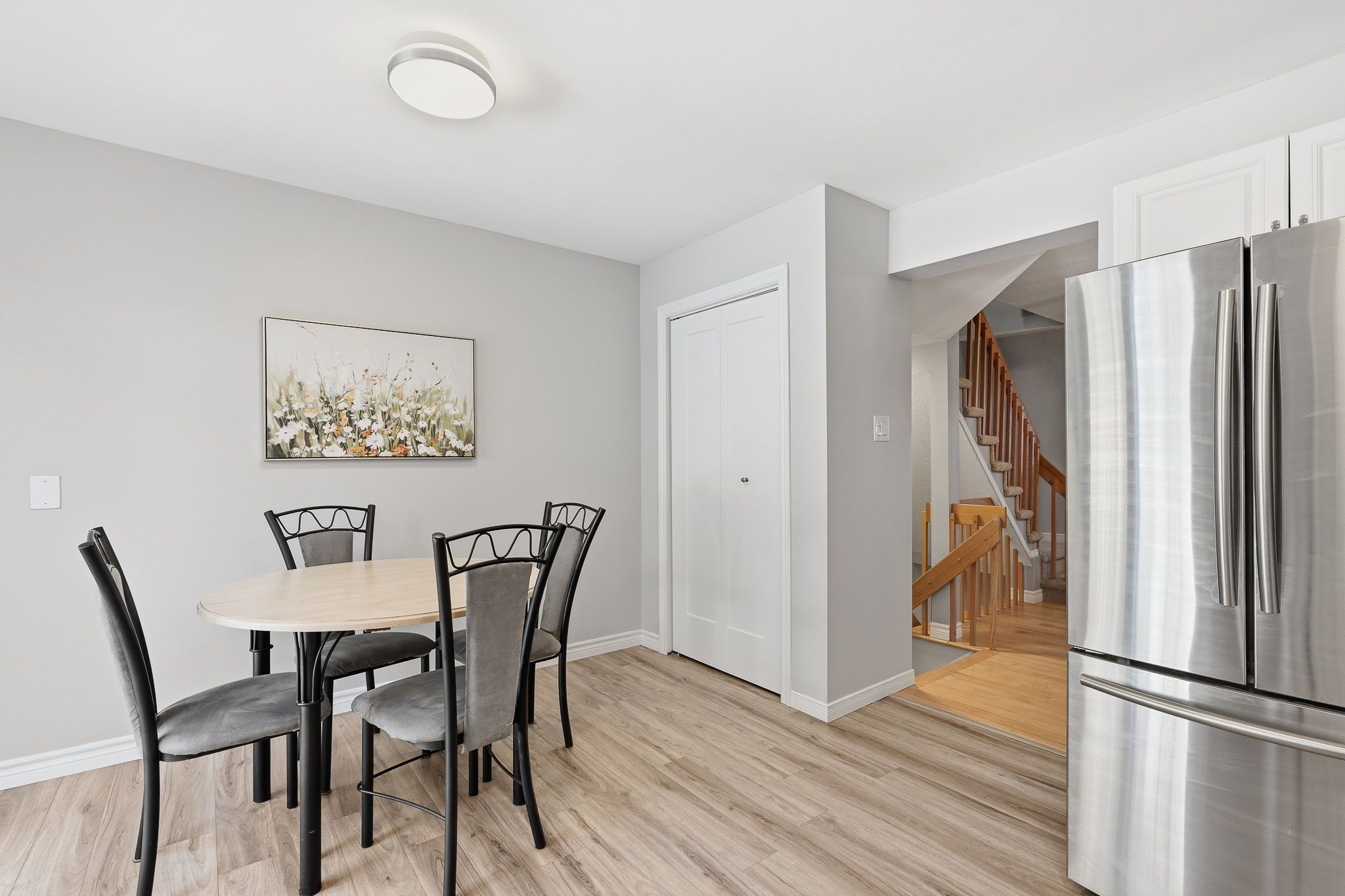 Welcome home to this beautifully maintained end-unit townhouse offering exceptional space, privacy, and an unbeatable location. This 3-storey, 3-bedroom, 2-bathroom home with attached garage is ideal for a growing family or professionals seeking comfort and convenience. Step inside to a spacious front entrance with inside access to the garage, a powder room/laundry, and a bright bonus room with a large window-perfect for a home office, gym, or flex space. The main living level features hardwood floors in the bright living room open to the dining area, creating a warm and inviting space for everyday living and entertaining. The large kitchen offers classic white cabinetry, an eat-in area, and a bonus pantry for extra storage. Patio doors lead to a private backyard, ideal for relaxing or hosting guests. Upstairs, you'll find three generously sized bedrooms, perfect for family living, along with a full bathroom. This home has been freshly painted and is well maintained, with many key updates including windows, roof, furnace, a/c, and hot water tank (2016), plus a garage door (2018). Located close to montfort hospital, this property is perfect for healthcare professionals and commuters, with downtown ottawa just 15 minutes away. A perfect starter home offering space, and a fantastic location-move in and enjoy!
