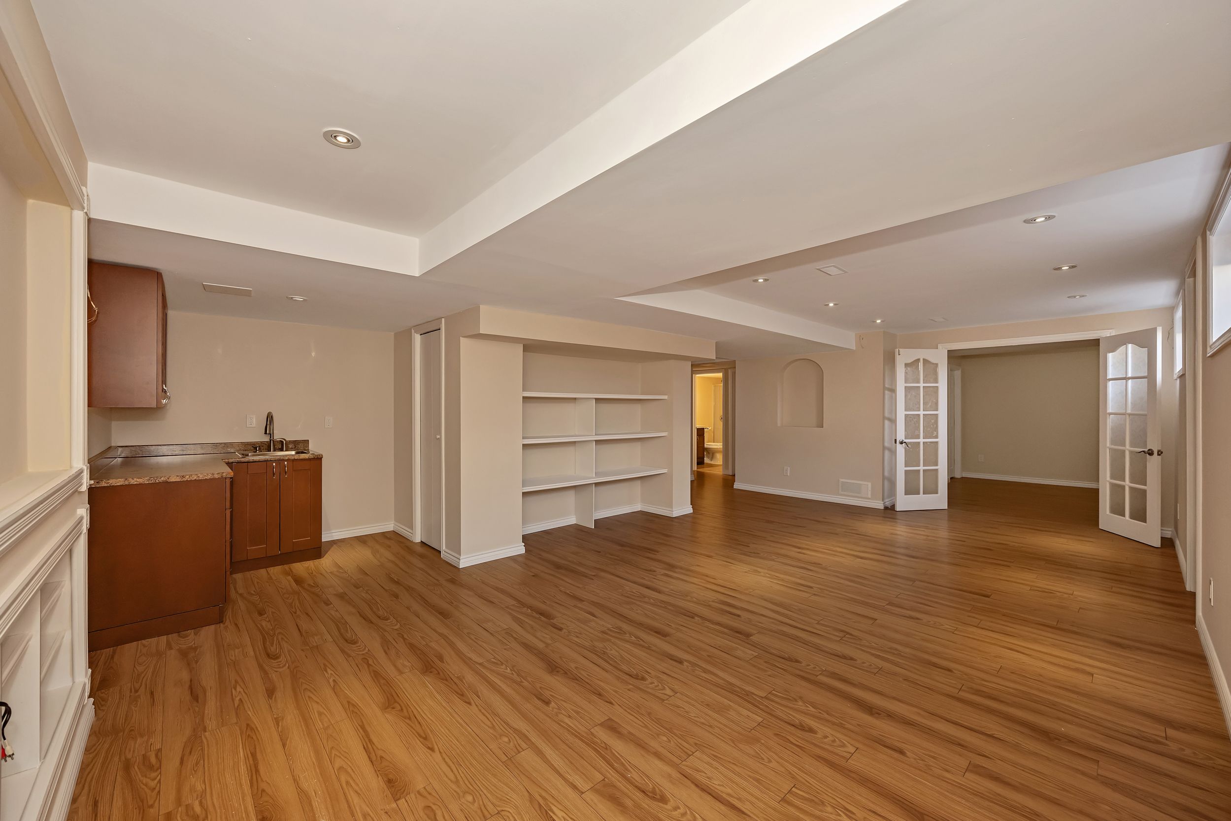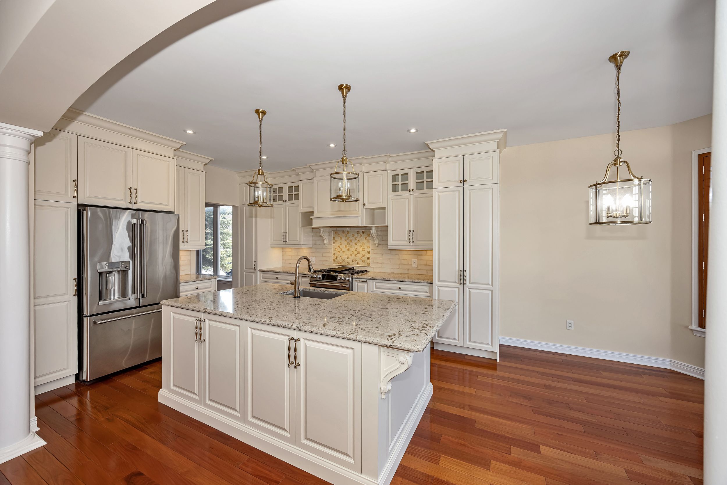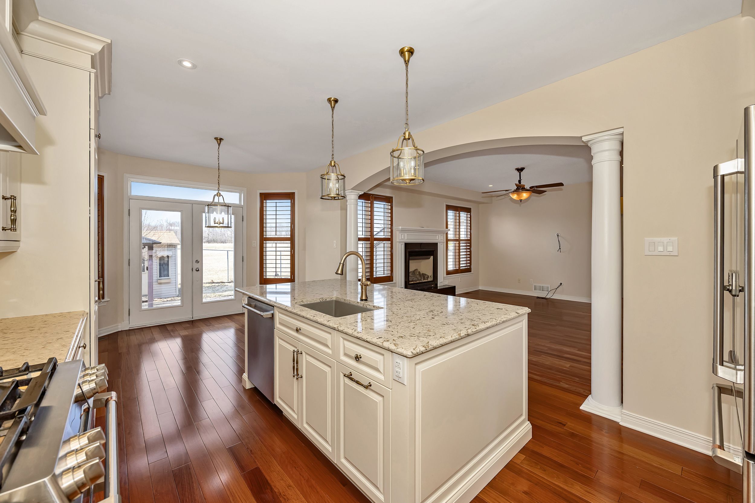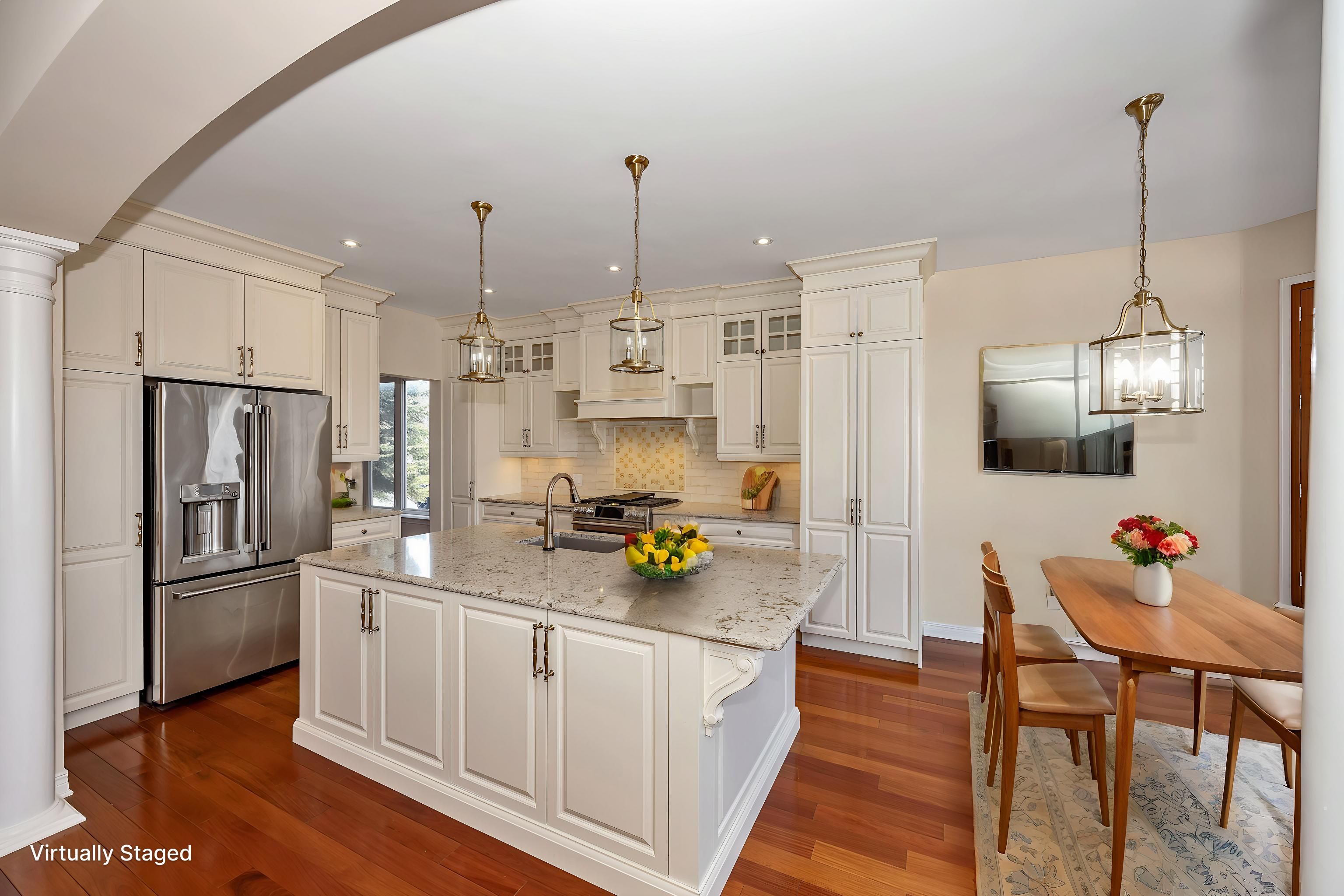 • Luxurious custom kitchen with large island and direct backyard access.