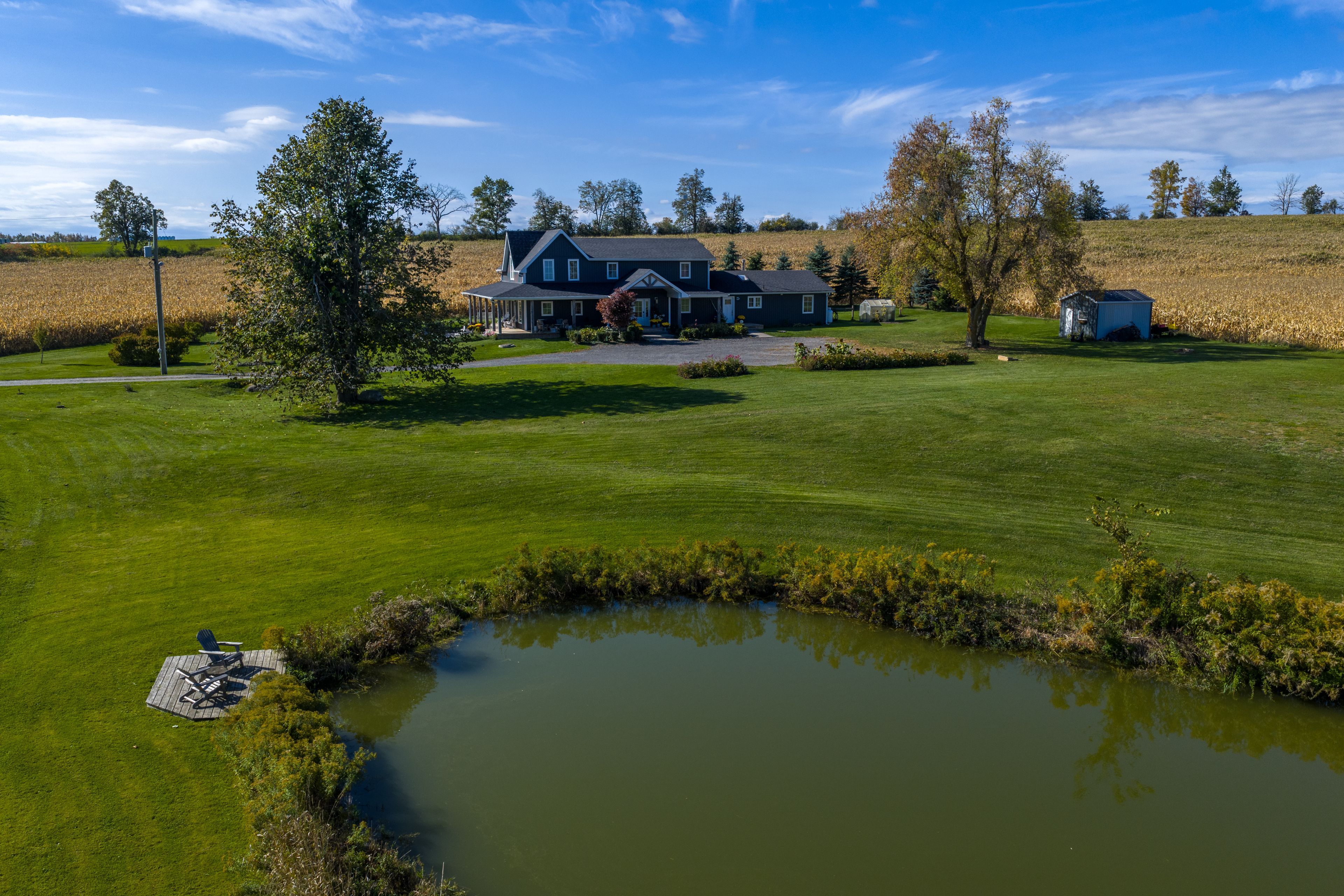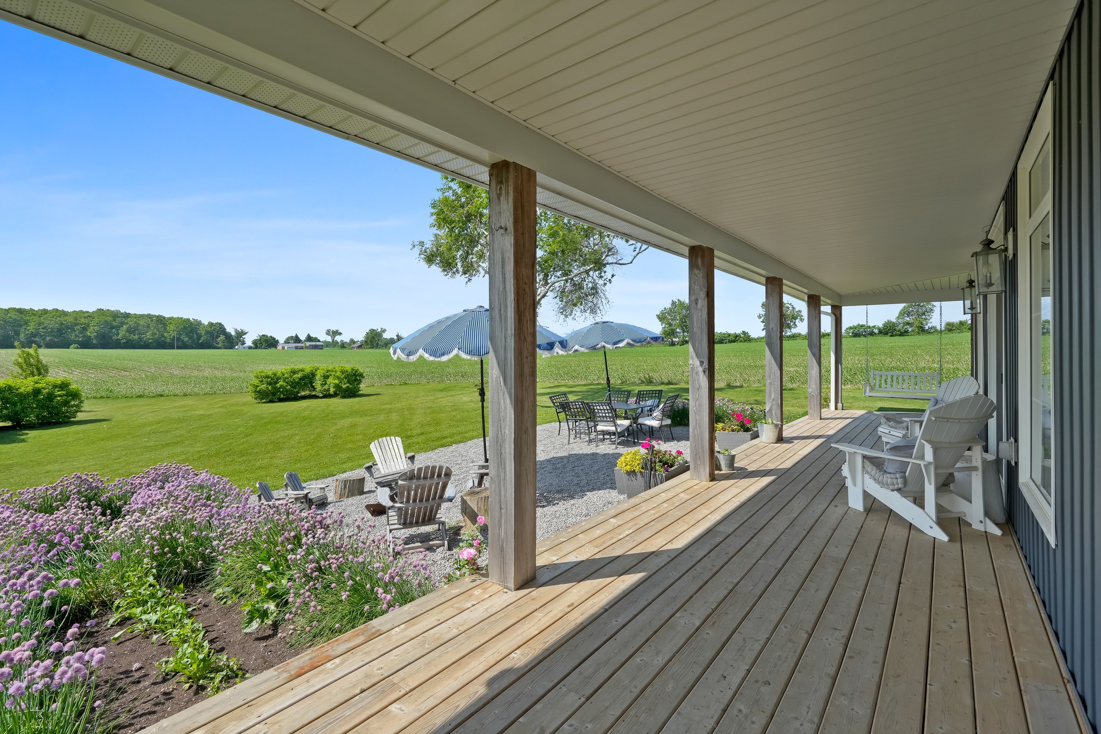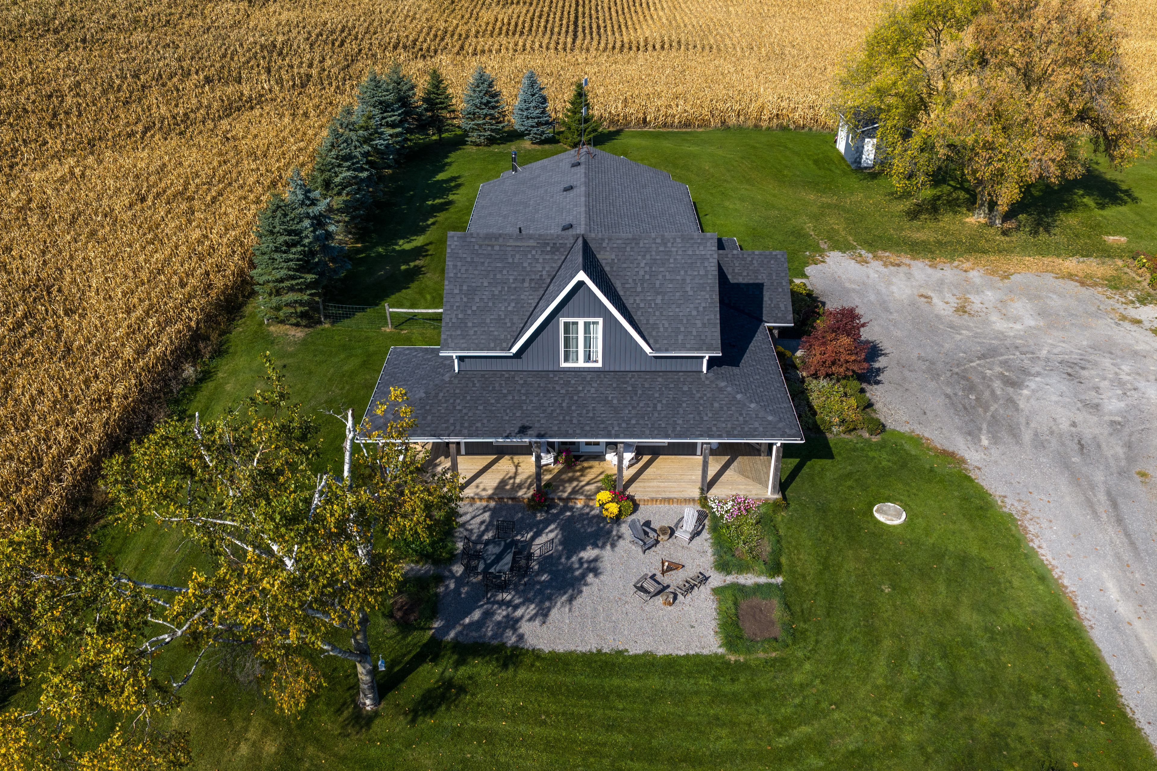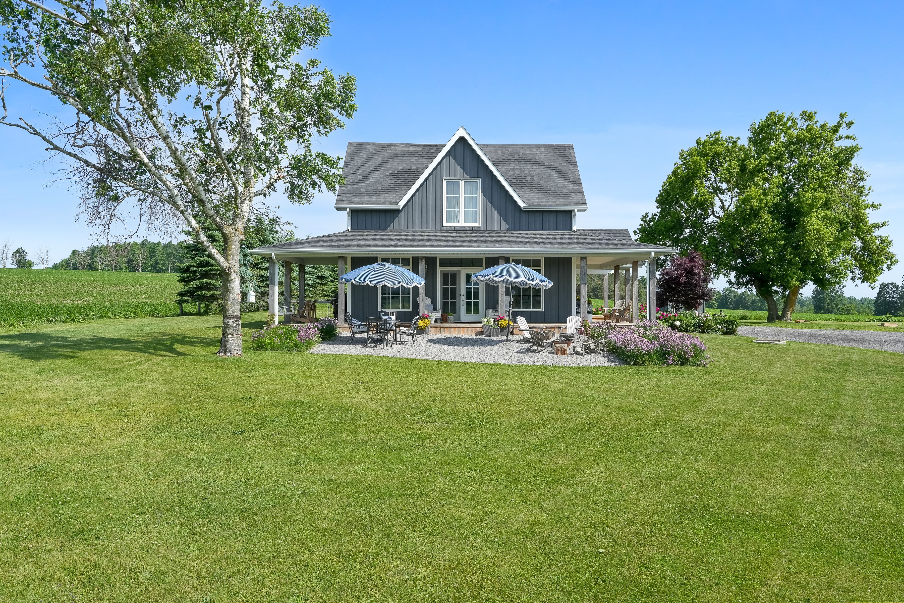 Beautifully renovated farmhouse on 1. 91 acres featuring a self-contained apartment and sweeping countryside views! Set down a romantic laneway & completely hidden in the summer months, this modern farmhouse feels like a discovered treasure-quiet, relaxing, & immersed in views of cornfields, a neighbouring pond & distant barns. Every room is bathed in white, highlighting the rich wide-plank hardwood floors & the home's elevated farmhouse design. The kitchen features stainless steel appliances & quartz counters, while all bathrooms are beautifully finished with quality tile & quartz vanities. With 3,620 s. F. Of total living space, the multigenerational layout offers a highly functional footprint for family living andentertaining. A heated-tile mudroom welcomes you in, leading to a secondary, fully separate mudroom-perfect for kids' lockers, sports gear, or a dog-wash room. From here, one expansive living space flows to the open-concept dining area & kitchen, with a wall of windows overlooking a picturesque pond, wraparound porch & perennial gardens. Multiple main-floor walkouts & oversized windows draw in natural light & frame a panoramic sweep of farmland that gently slopes toward a grove of trees. It's the kind of setting where the view becomes the entertainment-birds crossing the sky & the weather shifting across open fields. A cozy den adds versatility, functioning beautifully as a library or home office. Upstairs, 3 bright bedrooms share a spacious 4-pc bathroom, while the primary suite offers its own serene 3-pc bath & walk-in closet. Thoughtfully designed for flexibility, the home also includes a 1-bed apartment with full unfinished basement. As family needs evolve, this layout adapts with ease-ideal for grown kids, aging parents, or supplemental rental income. A peaceful backdrop, a beautifully finished interior & a layout that invites gathering and connection-this is a rare country property that blends modern comfort with the timeless beauty of rural living.