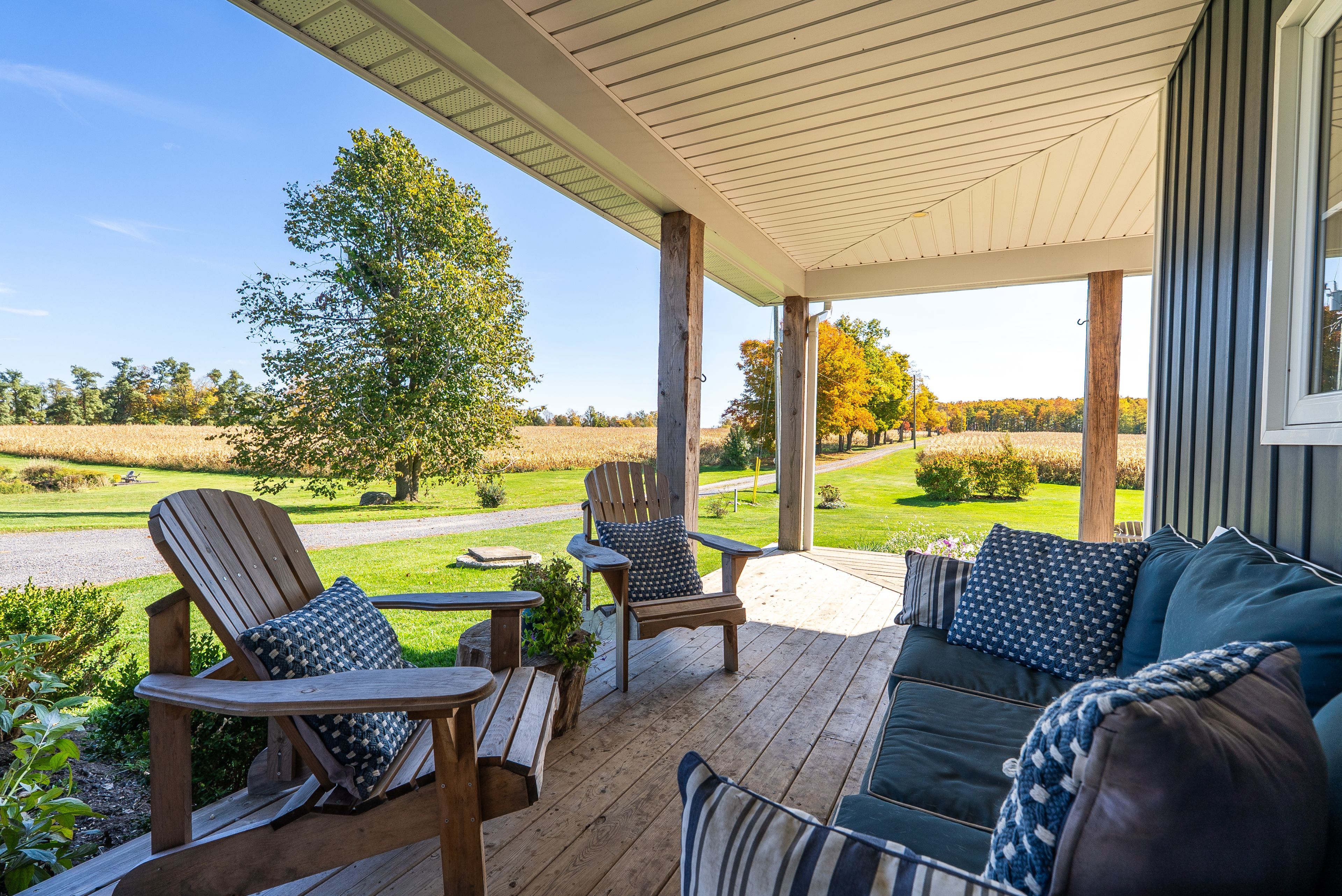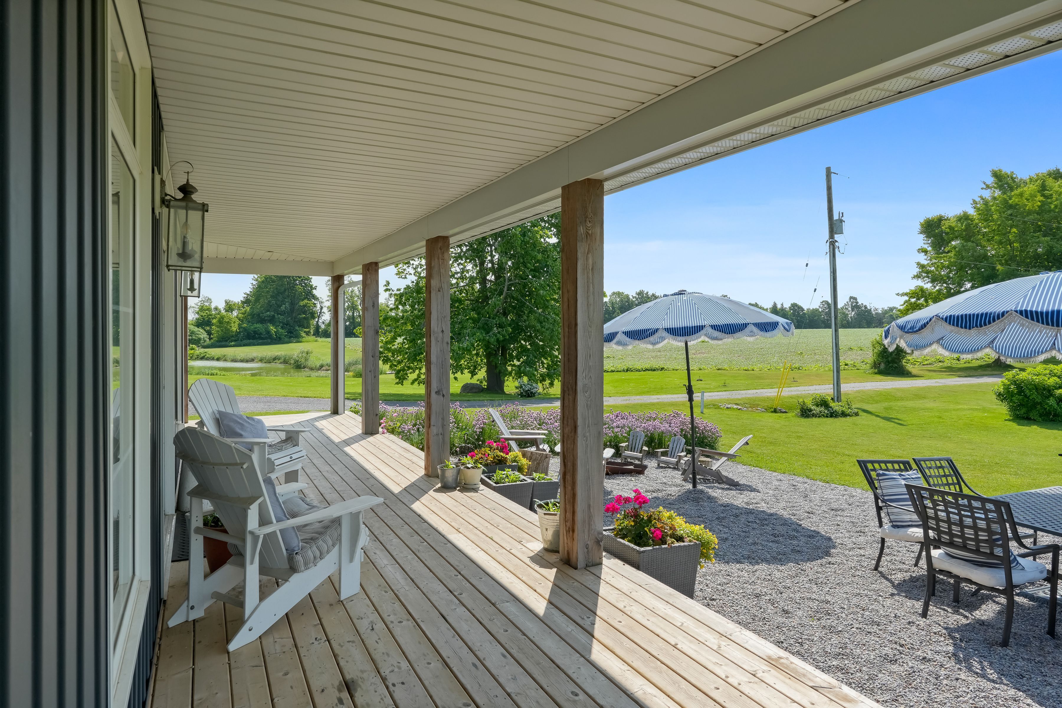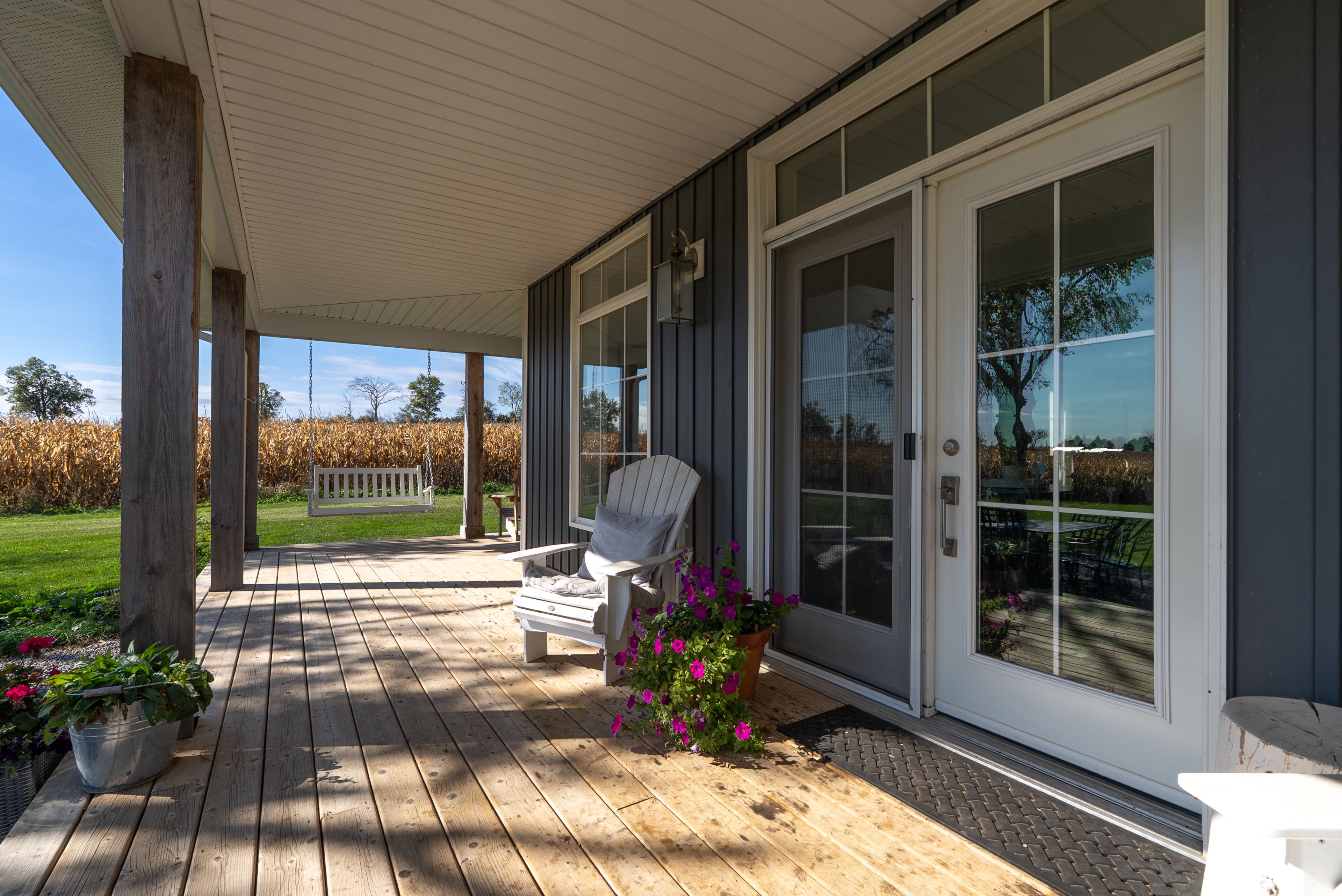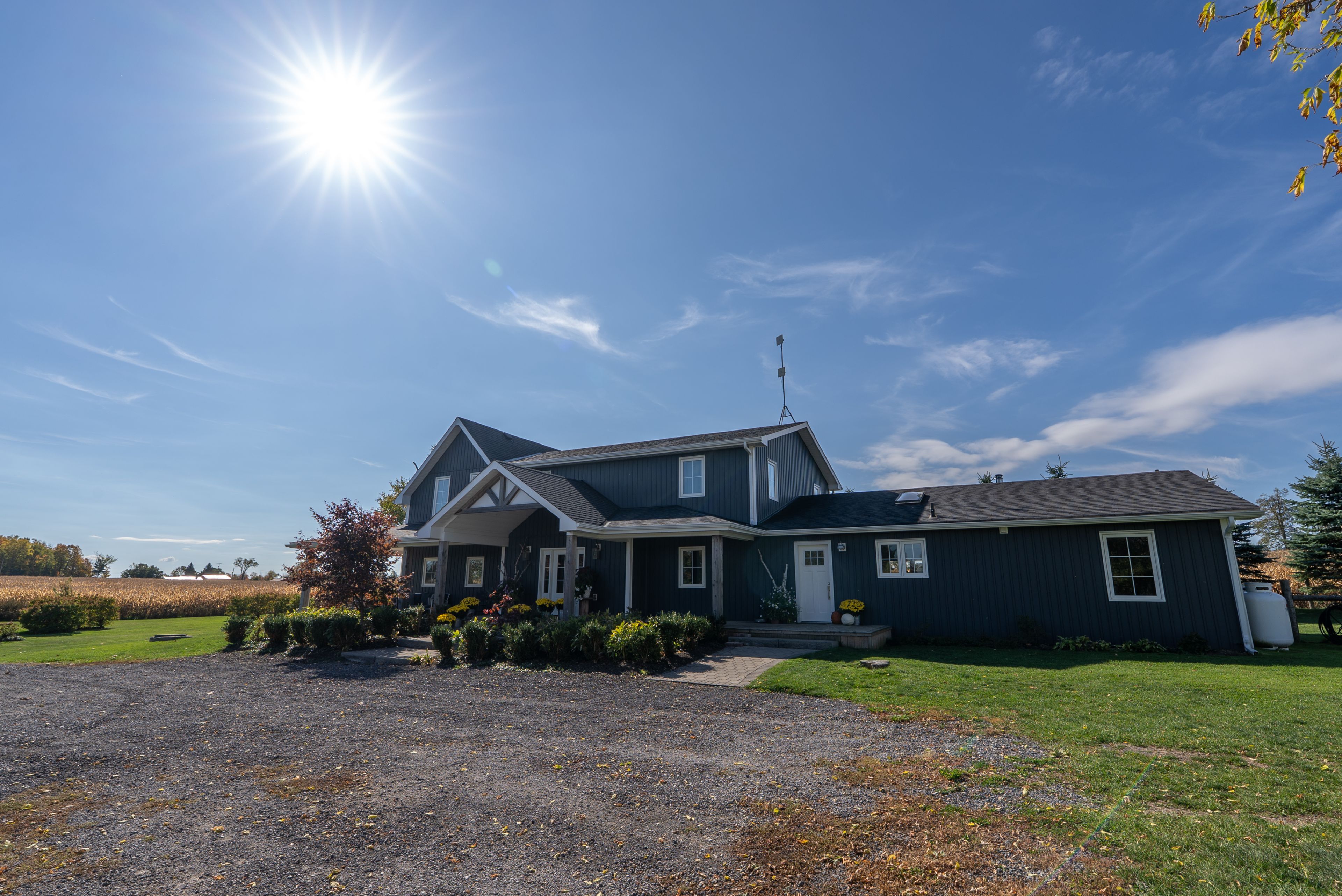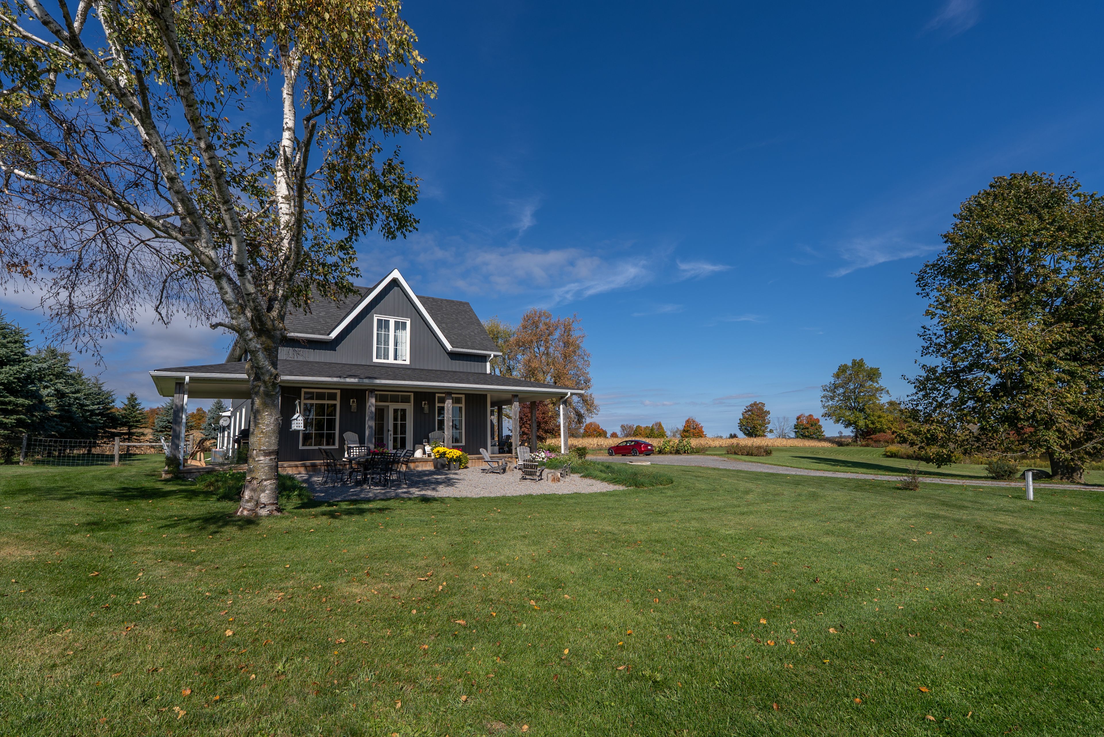 Beautifully renovated farmhouse on 1. 91 acres featuring a self-contained apartment and sweeping countryside views! Set down a romantic laneway & completely hidden in the summer months, this modern farmhouse feels like a discovered treasure-quiet, relaxing, & immersed in views of cornfields, a neighbouring pond & distant barns. Every room is bathed in white, highlighting the rich wide-plank hardwood floors & the home's elevated farmhouse design. The kitchen features stainless steel appliances & quartz counters, while all bathrooms are beautifully finished with quality tile & quartz vanities. With 3,620 s. F. Of total living space, the multigenerational layout offers a highly functional footprint for family living andentertaining. A heated-tile mudroom welcomes you in, leading to a secondary, fully separate mudroom-perfect for kids' lockers, sports gear, or a dog-wash room. From here, one expansive living space flows to the open-concept dining area & kitchen, with a wall of windows overlooking a picturesque pond, wraparound porch & perennial gardens. Multiple main-floor walkouts & oversized windows draw in natural light & frame a panoramic sweep of farmland that gently slopes toward a grove of trees. It's the kind of setting where the view becomes the entertainment-birds crossing the sky & the weather shifting across open fields. A cozy den adds versatility, functioning beautifully as a library or home office. Upstairs, 3 bright bedrooms share a spacious 4-pc bathroom, while the primary suite offers its own serene 3-pc bath & walk-in closet. Thoughtfully designed for flexibility, the home also includes a 1-bed apartment with full unfinished basement. As family needs evolve, this layout adapts with ease-ideal for grown kids, aging parents, or supplemental rental income. A peaceful backdrop, a beautifully finished interior & a layout that invites gathering and connection-this is a rare country property that blends modern comfort with the timeless beauty of rural living.