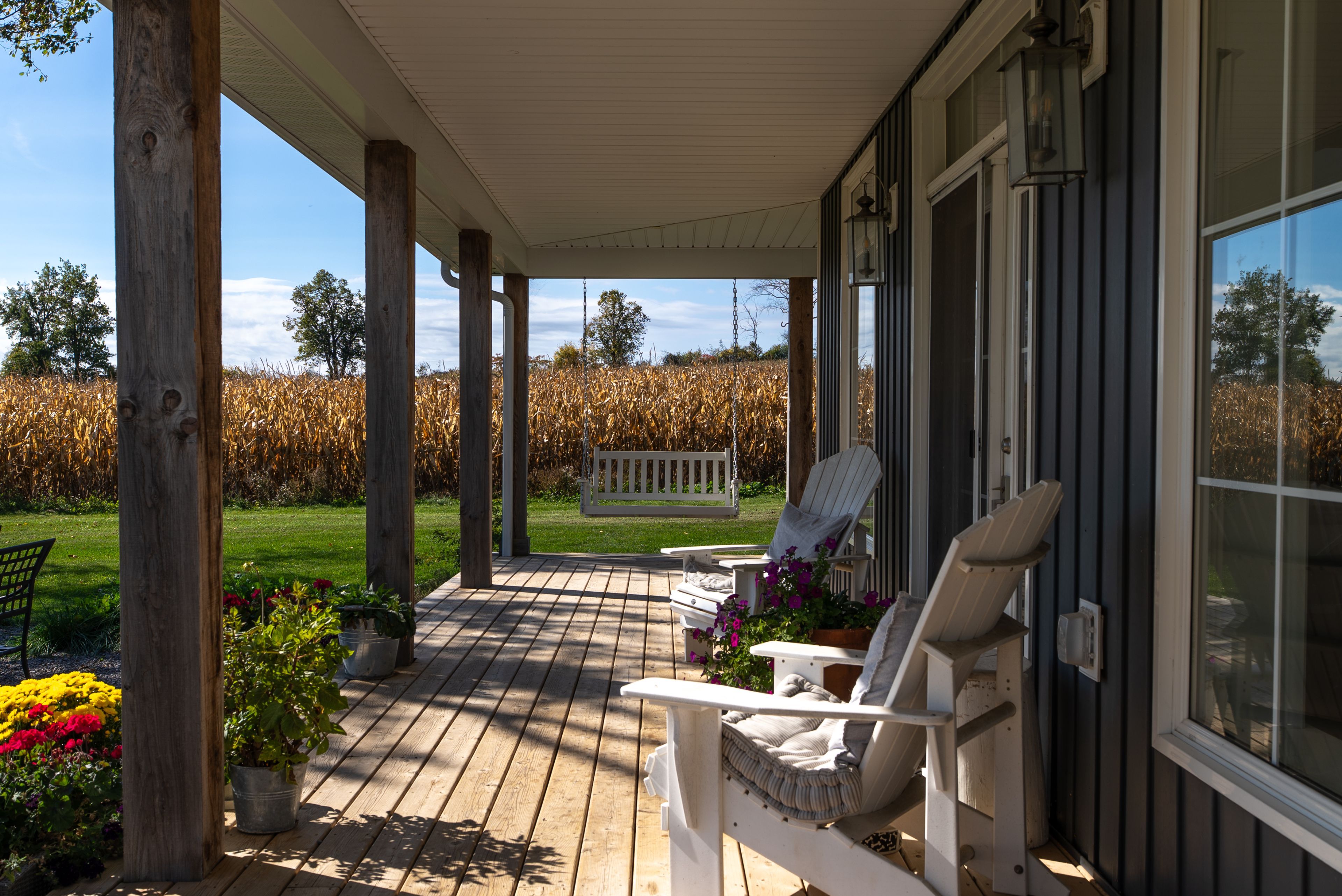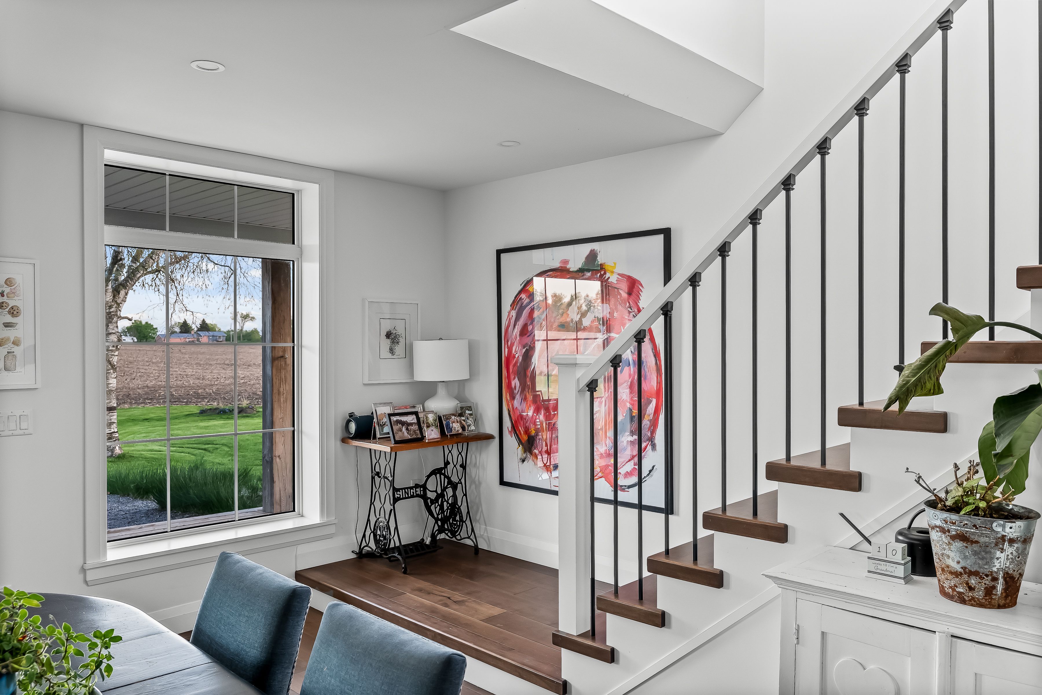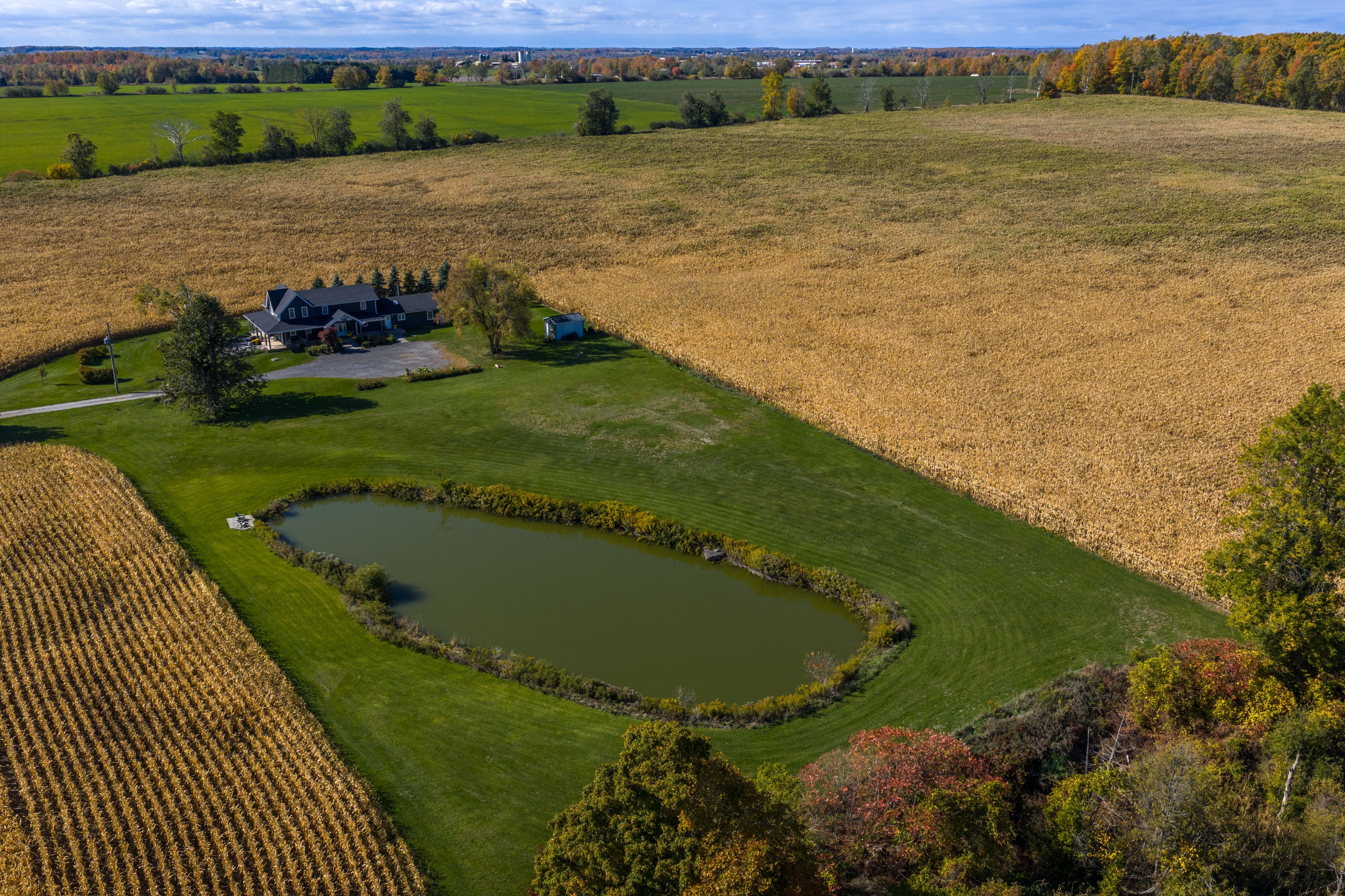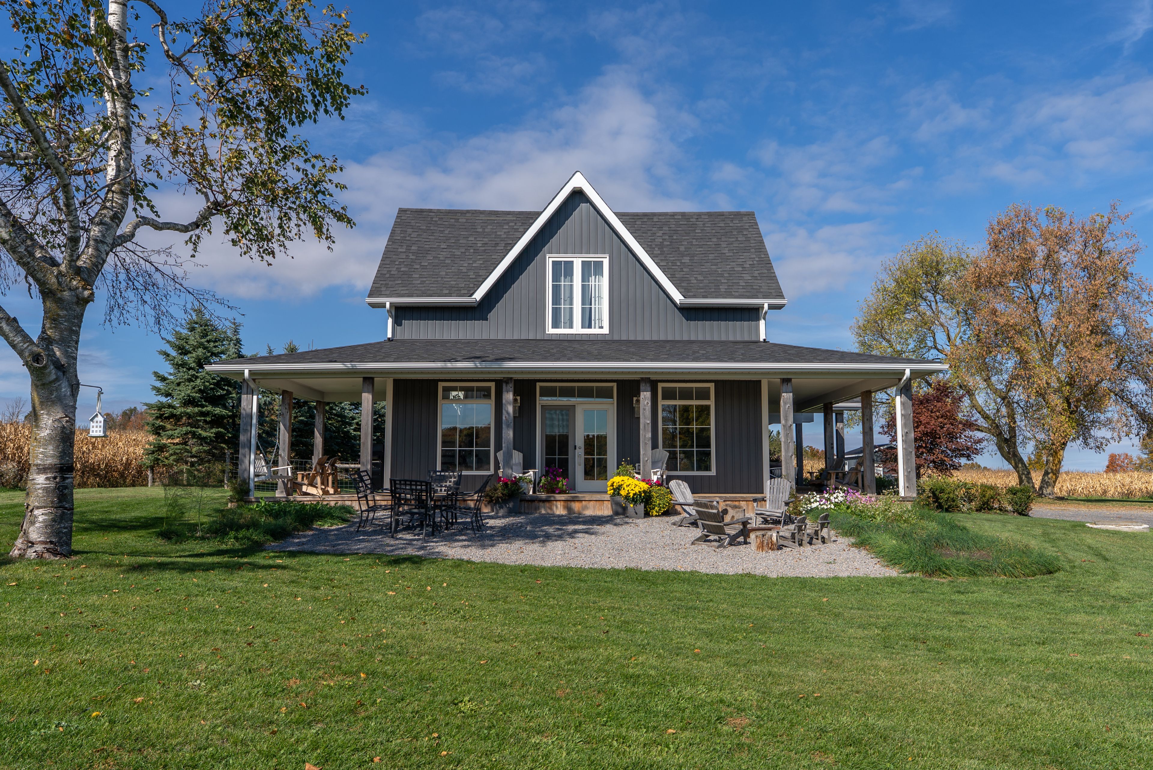 Beautifully renovated farmhouse on 1. 91 acres featuring a self-contained apartment and sweeping countryside views! Set down a romantic laneway & completely hidden in the summer months, this modern farmhouse feels like a discovered treasure-quiet, relaxing, & immersed in views of cornfields, a neighbouring pond & distant barns. Every room is bathed in white, highlighting the rich wide-plank hardwood floors & the home's elevated farmhouse design. The kitchen features stainless steel appliances & quartz counters, while all bathrooms are beautifully finished with quality tile & quartz vanities. With 3,620 s. F. Of total living space, the multigenerational layout offers a highly functional footprint for family living andentertaining. A heated-tile mudroom welcomes you in, leading to a secondary, fully separate mudroom-perfect for kids' lockers, sports gear, or a dog-wash room. From here, one expansive living space flows to the open-concept dining area & kitchen, with a wall of windows overlooking a picturesque pond, wraparound porch & perennial gardens. Multiple main-floor walkouts & oversized windows draw in natural light & frame a panoramic sweep of farmland that gently slopes toward a grove of trees. It's the kind of setting where the view becomes the entertainment-birds crossing the sky & the weather shifting across open fields. A cozy den adds versatility, functioning beautifully as a library or home office. Upstairs, 3 bright bedrooms share a spacious 4-pc bathroom, while the primary suite offers its own serene 3-pc bath & walk-in closet. Thoughtfully designed for flexibility, the home also includes a 1-bed apartment with full unfinished basement. As family needs evolve, this layout adapts with ease-ideal for grown kids, aging parents, or supplemental rental income. A peaceful backdrop, a beautifully finished interior & a layout that invites gathering and connection-this is a rare country property that blends modern comfort with the timeless beauty of rural living.