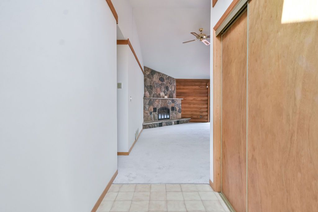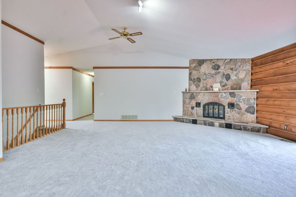 • Open concept living area with vaulted ceilings and a stunning stone fireplace.