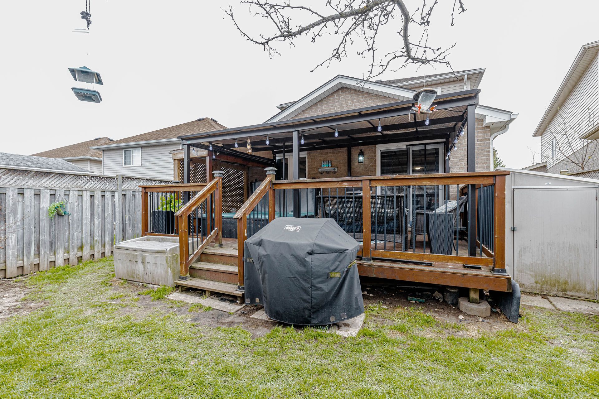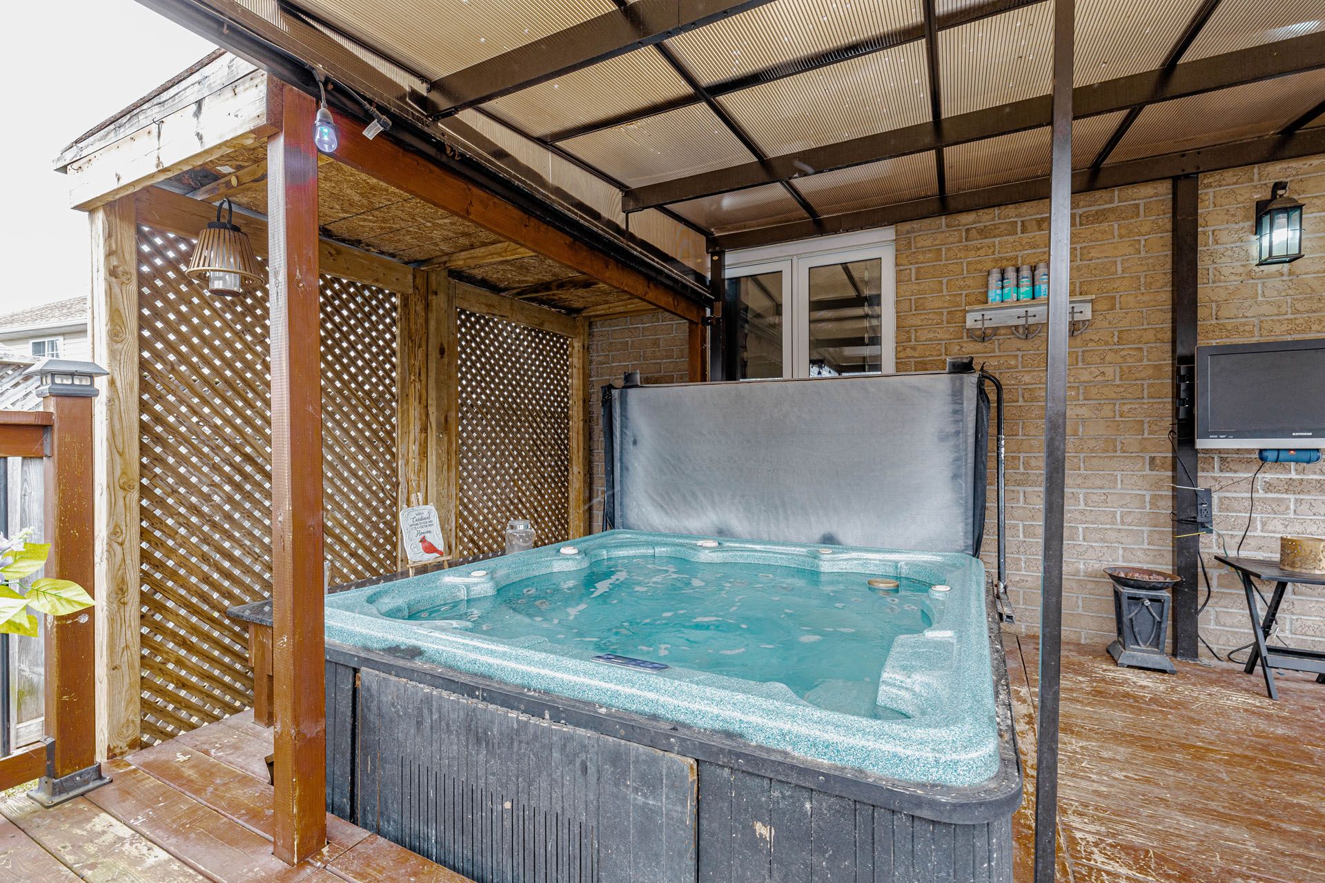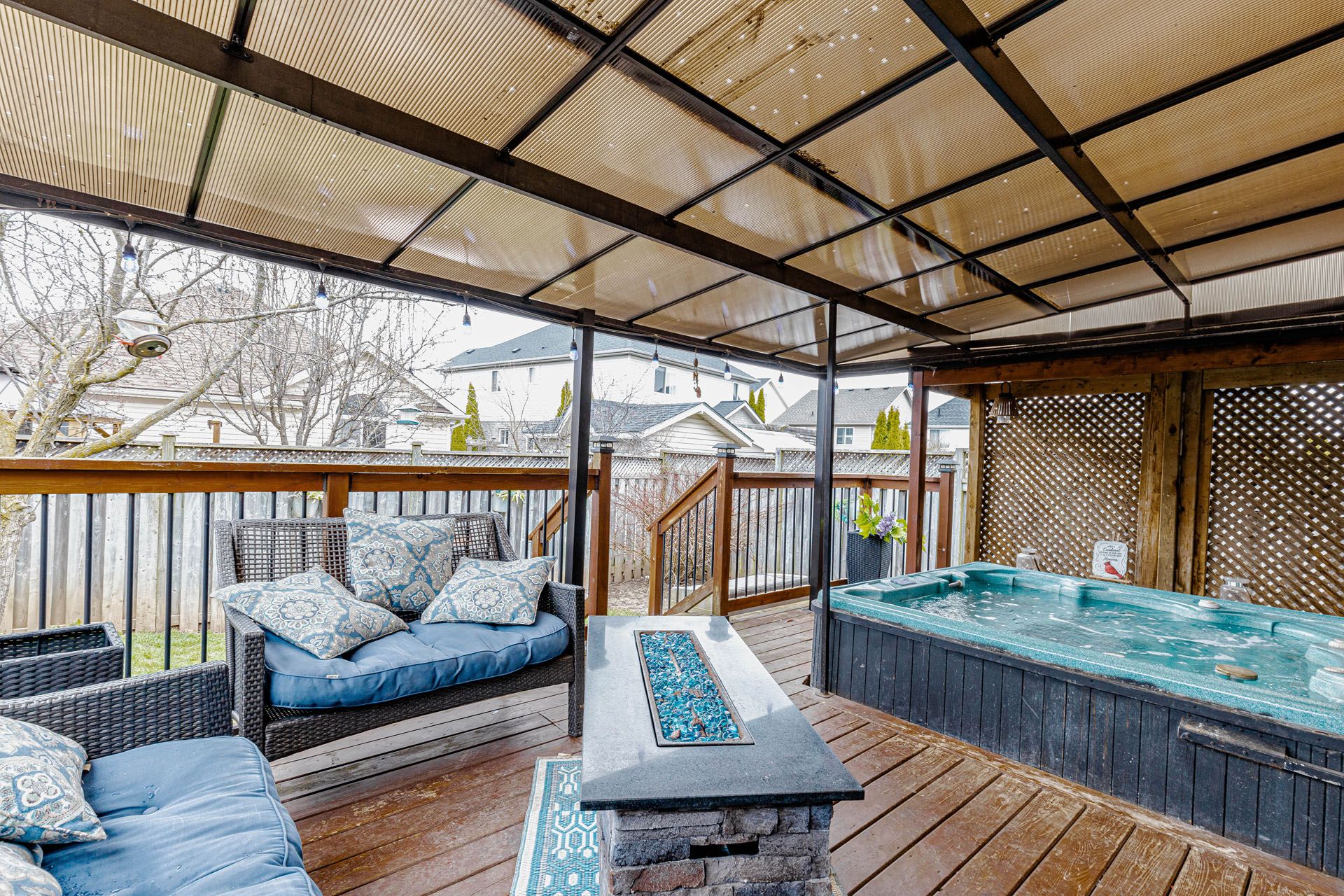 • Fully fenced backyard with deck, gazebo, hot tub, and storage shed.