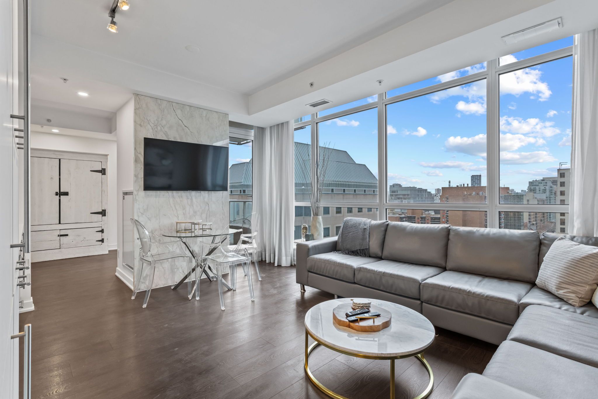 Welcome to upscale downtown living at 199 richmond street west. This beautifully furnished 1 bedroom + den suite offers a functional layout ideal for professionals seeking comfort and convenience in the heart of toronto's vibrant entertainment district. Just steps to the financial district, path, transit, top restaurants, theatres, and within walking distance to the hospital district, this location truly offers the best of city living. Residents enjoy premium building amenities including a fully equipped gym and rooftop terrace with hot tub. Available for a 1-year lease a rare opportunity to enjoy turnkey living in one of downtown toronto's most sought-after locations.