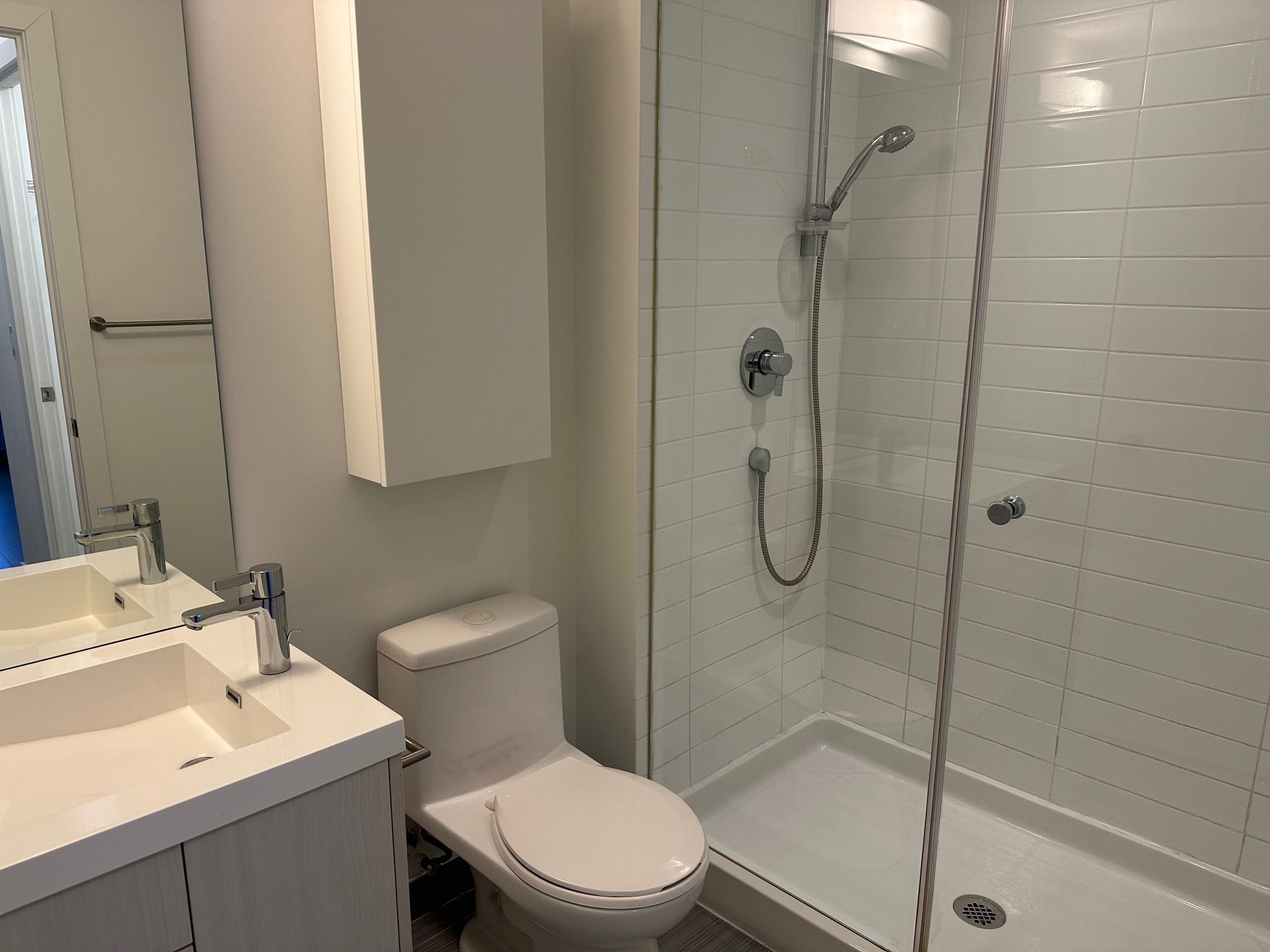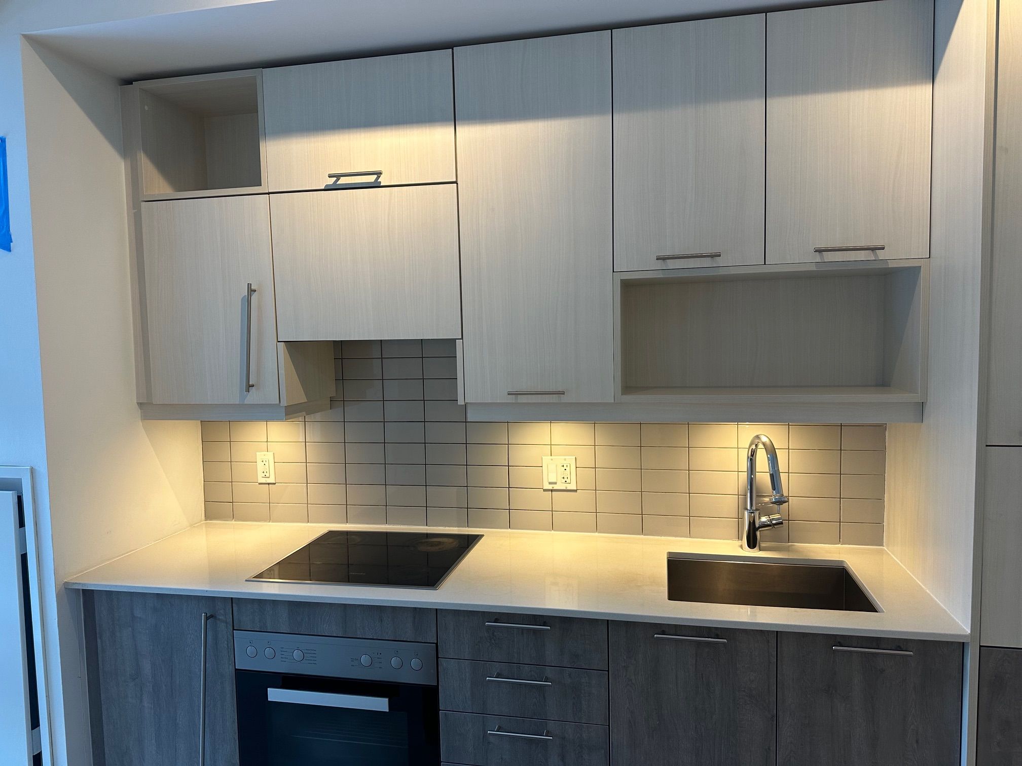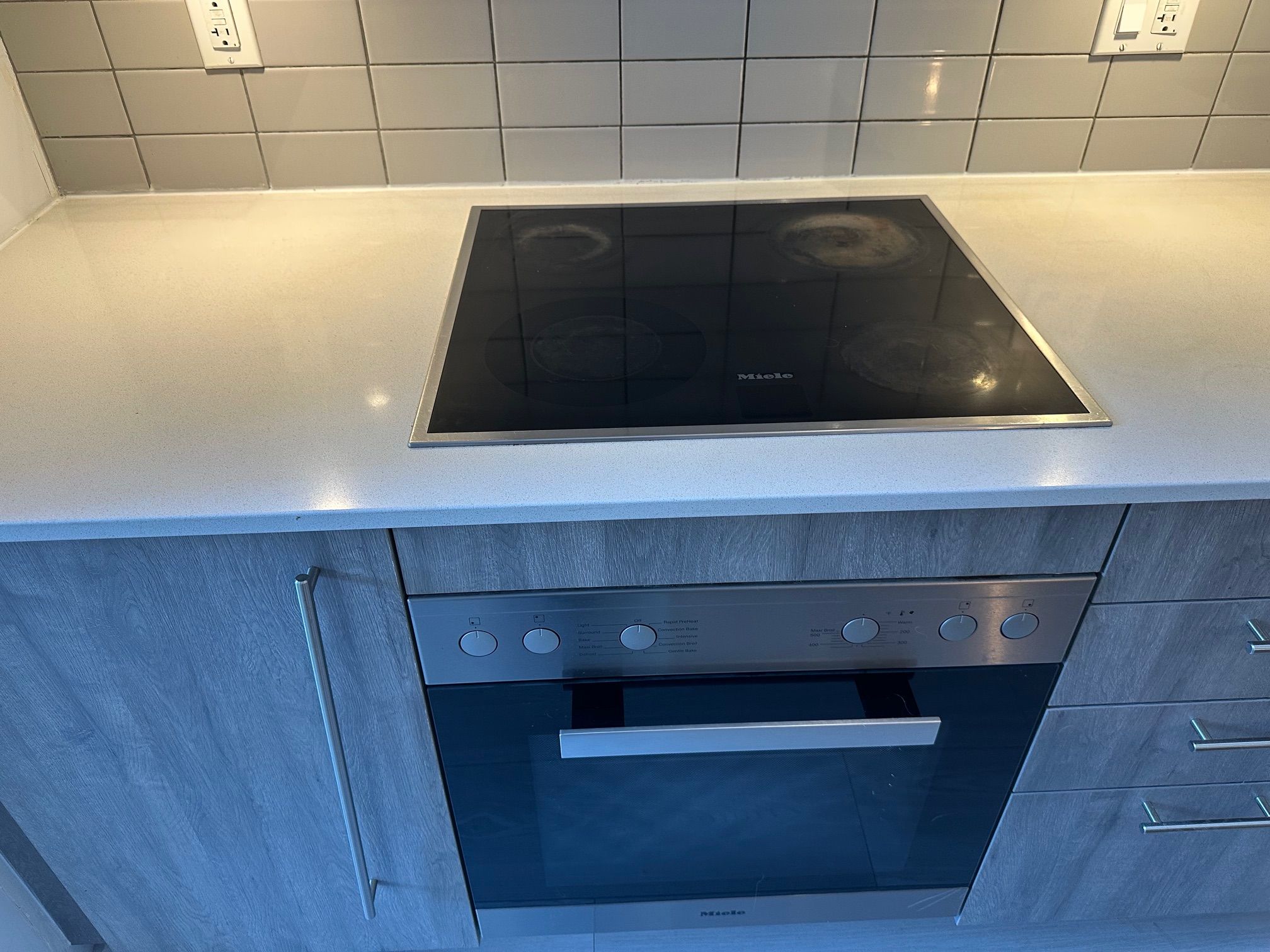 Newly renovated unit with 724 sf layout featuring a large living/dining area. Modern kitchen with miele appliances, enclosed den (can be used as 2nd bedroom or office). 2 bathrooms, huge closet in the primary bedroom, floor to ceiling windows.