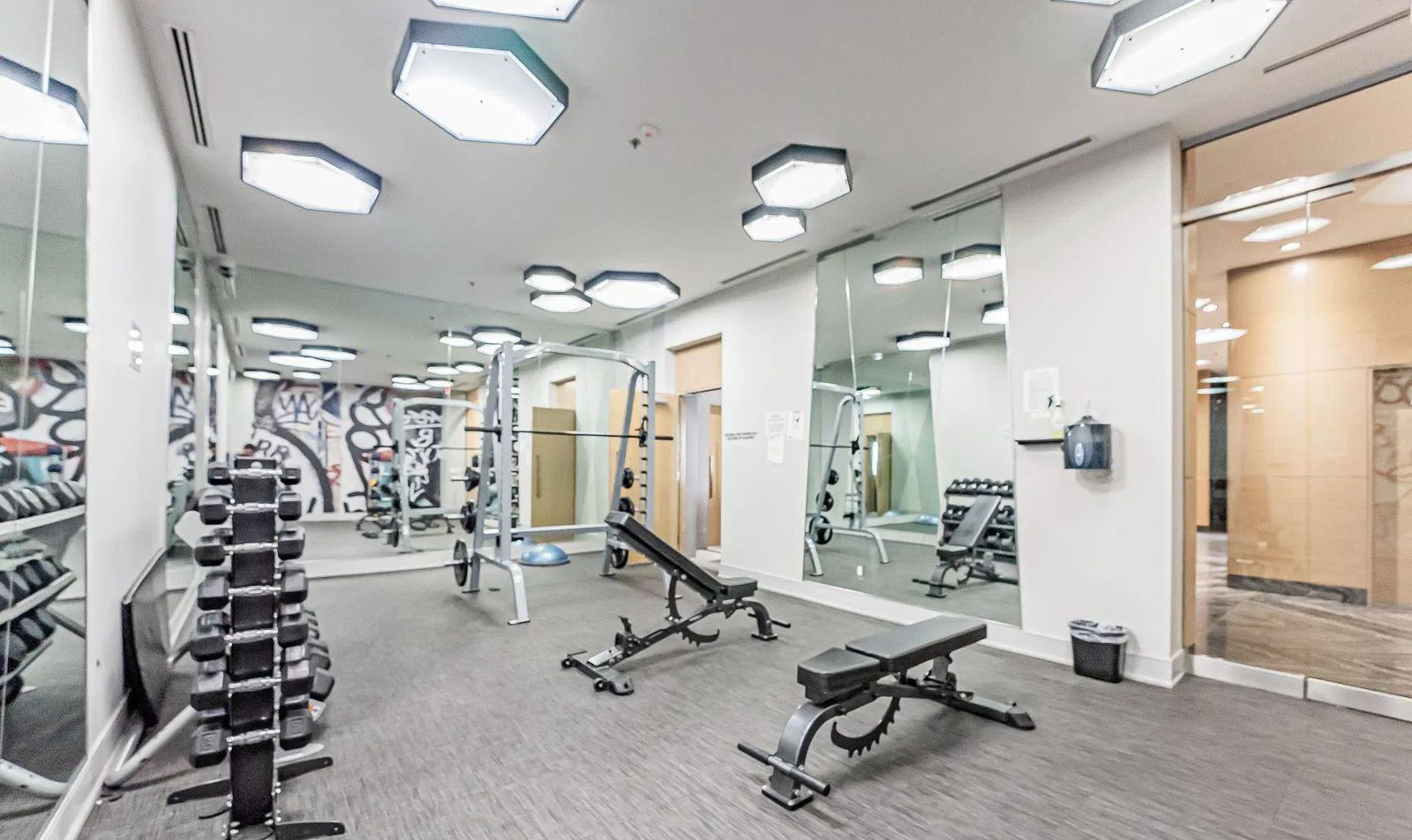• Amenities include a fitness center, aqua lounge, saunas, and steam room.