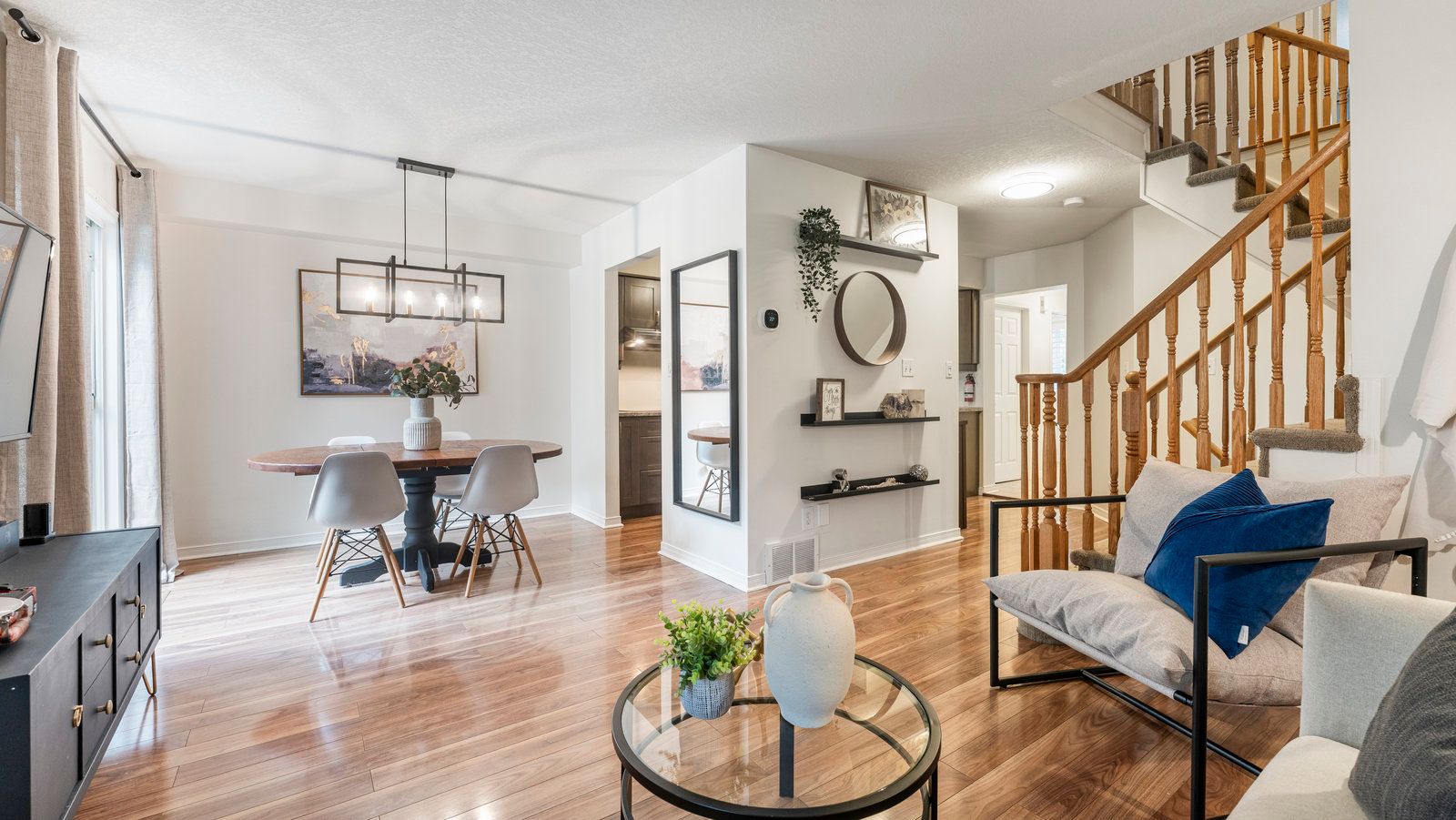 • Open-concept living area with honey oak laminate flooring.