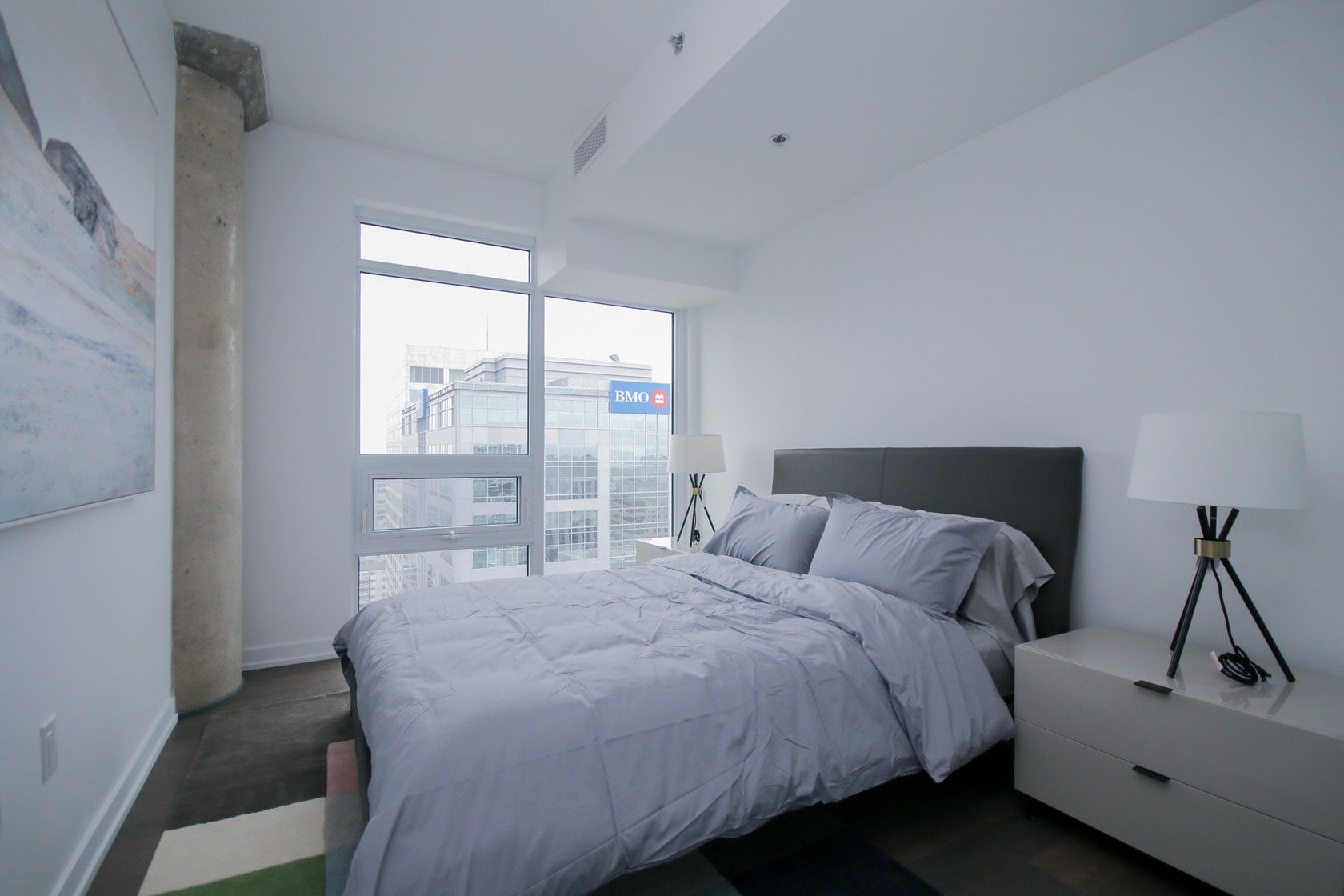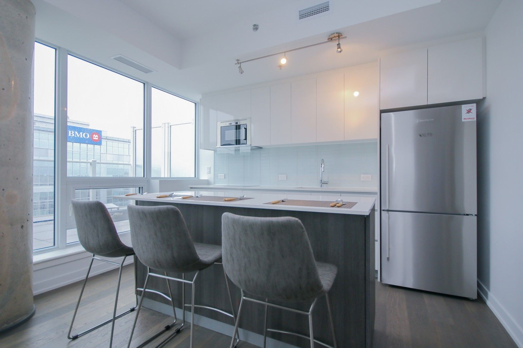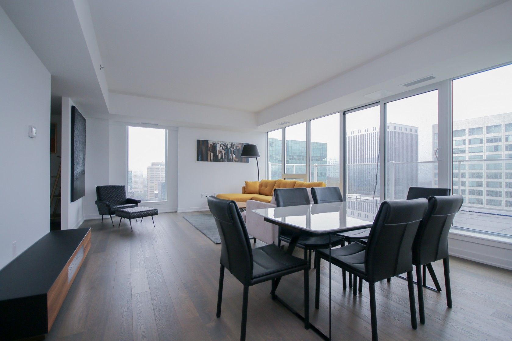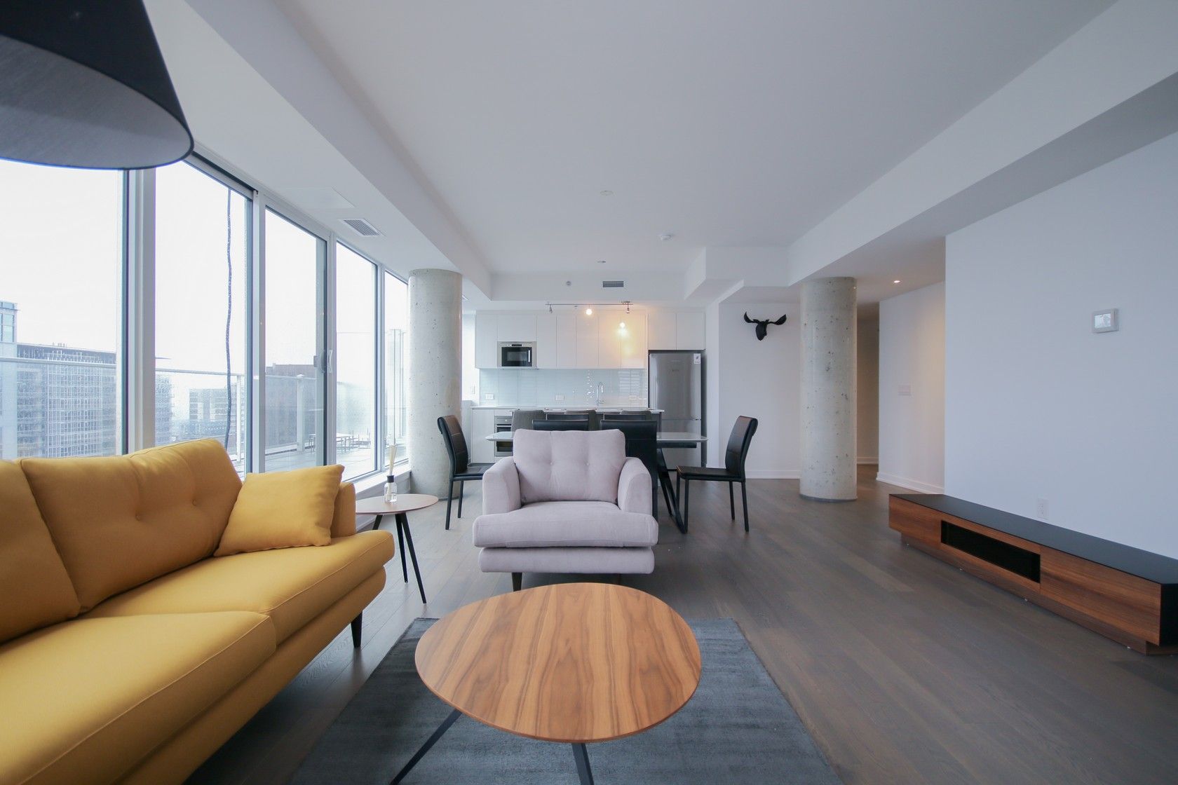 • Open-concept living area with floor-to-ceiling windows and urban views.
