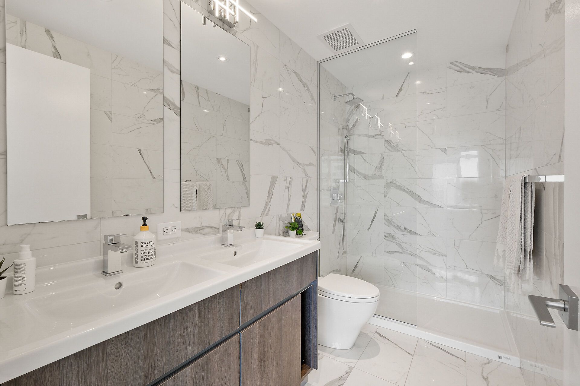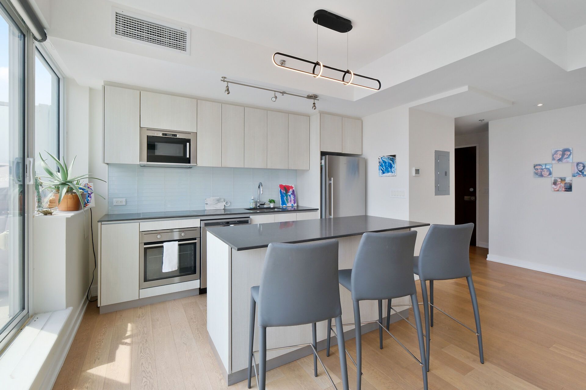 • Modern kitchen with quartz countertops and ample cabinetry space.