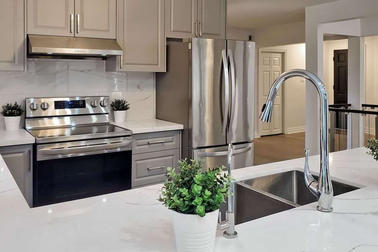 • Modern kitchen with stone countertops and stainless steel appliances.