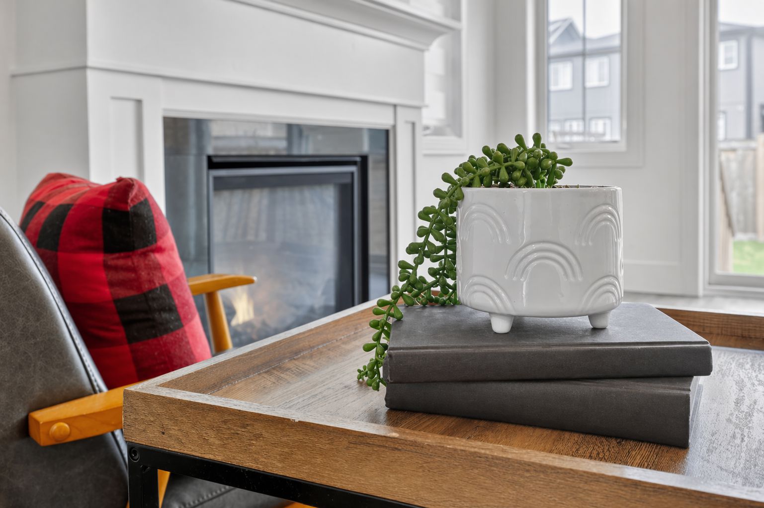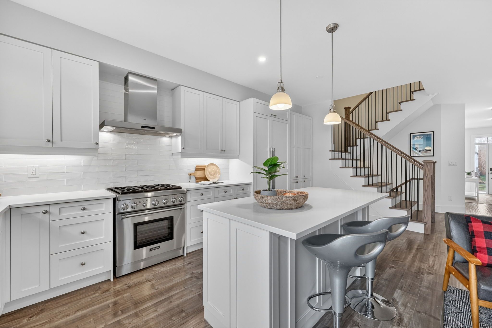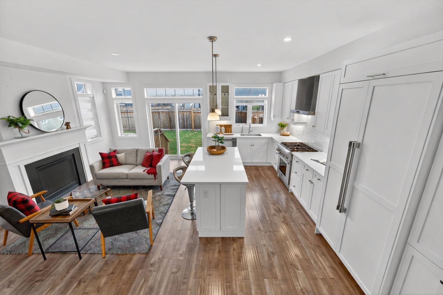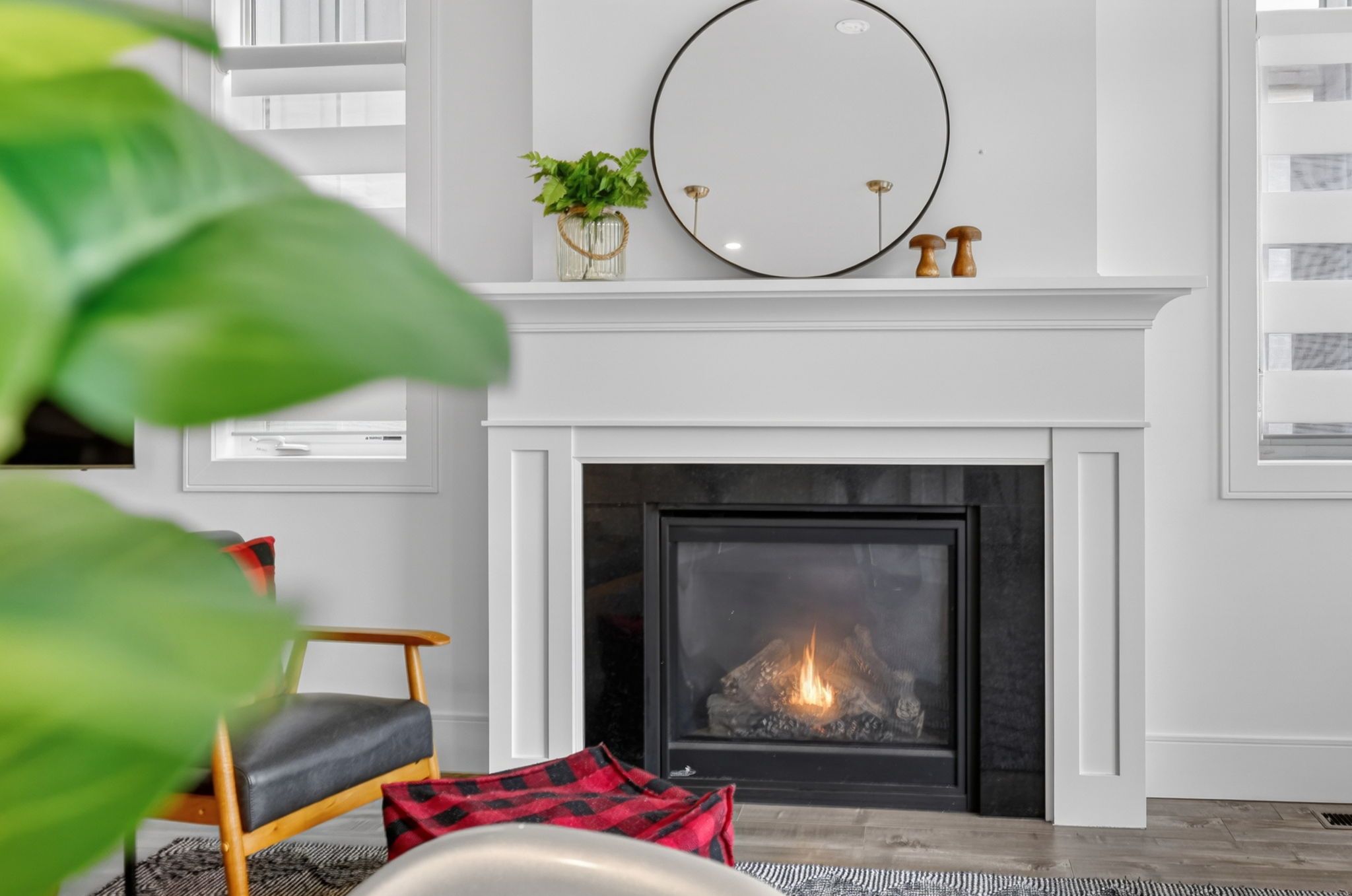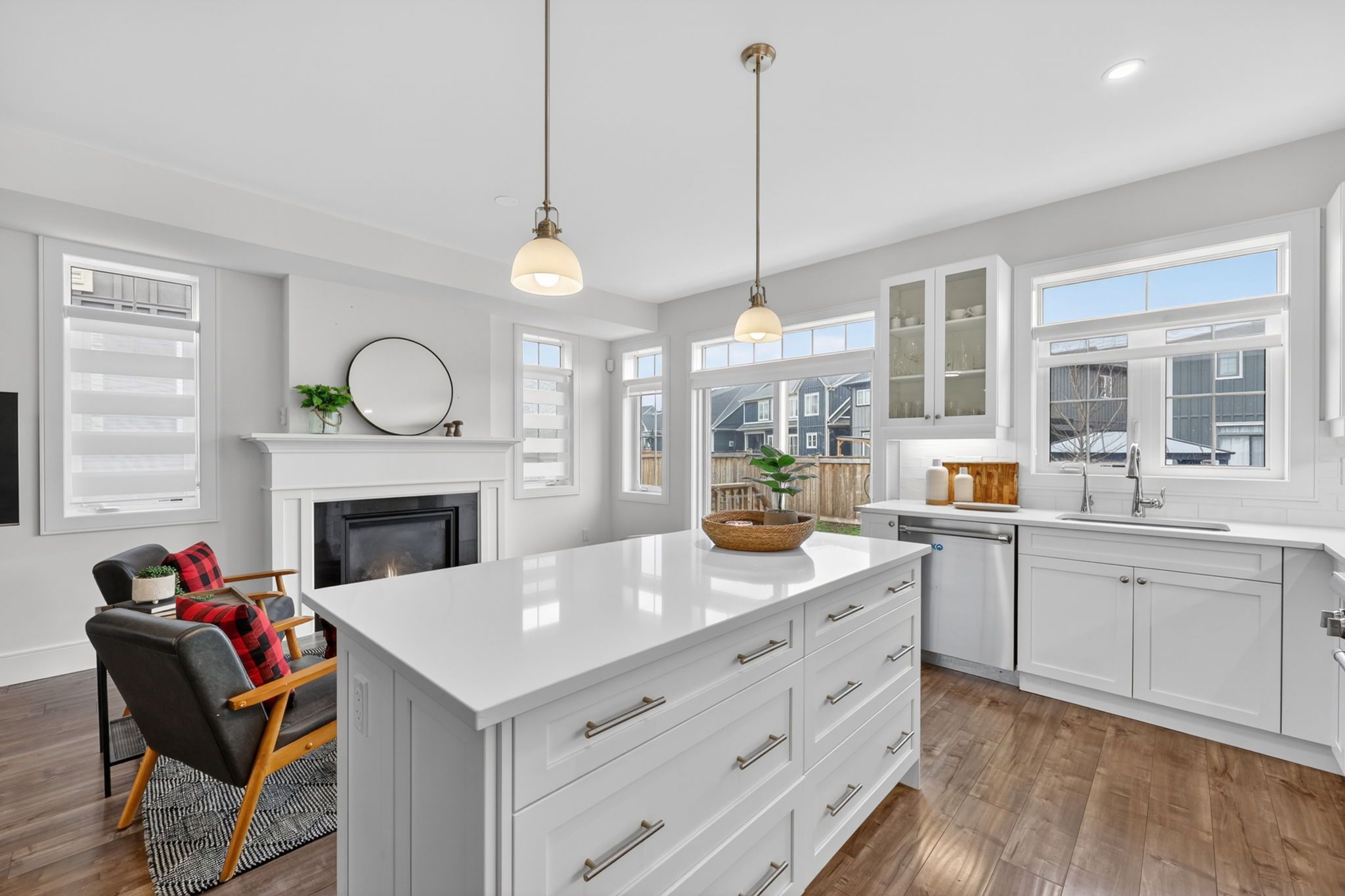 • Open concept living area with a gas fireplace and gourmet kitchen.