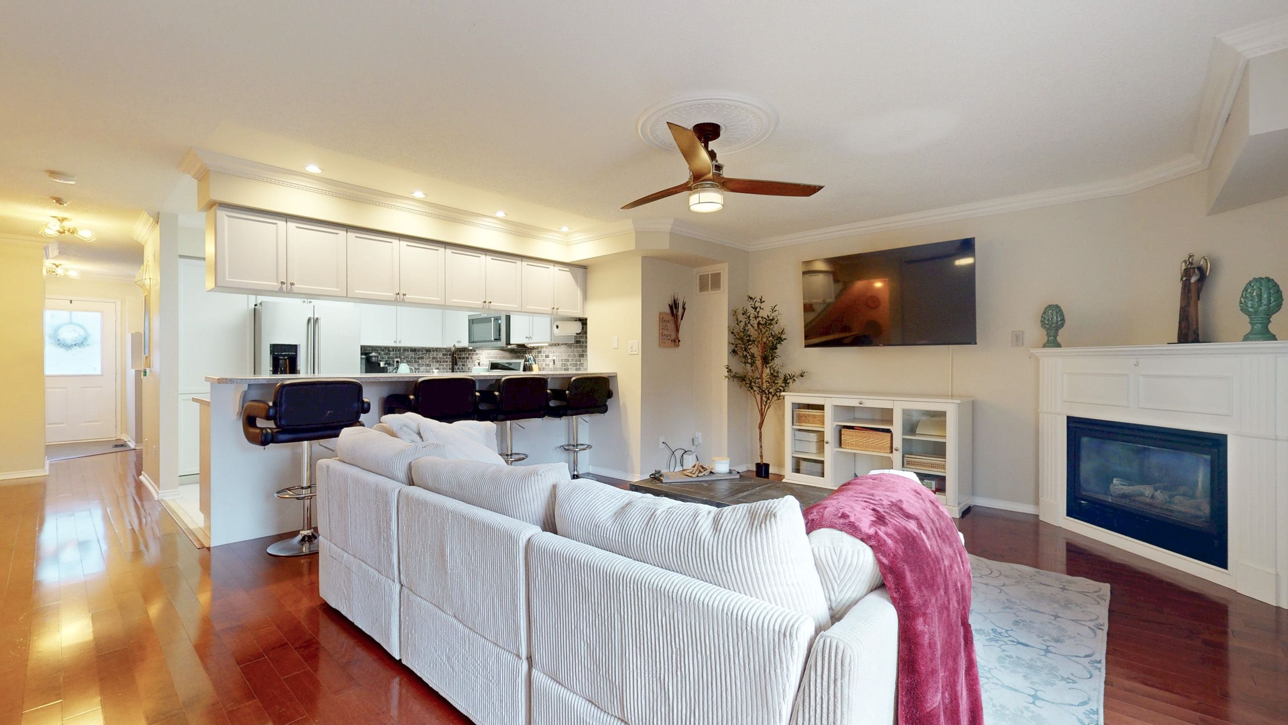 • Open-concept main level features a family room with a cozy gas fireplace.