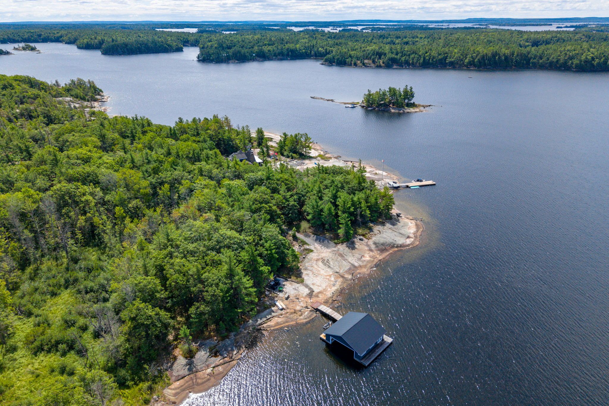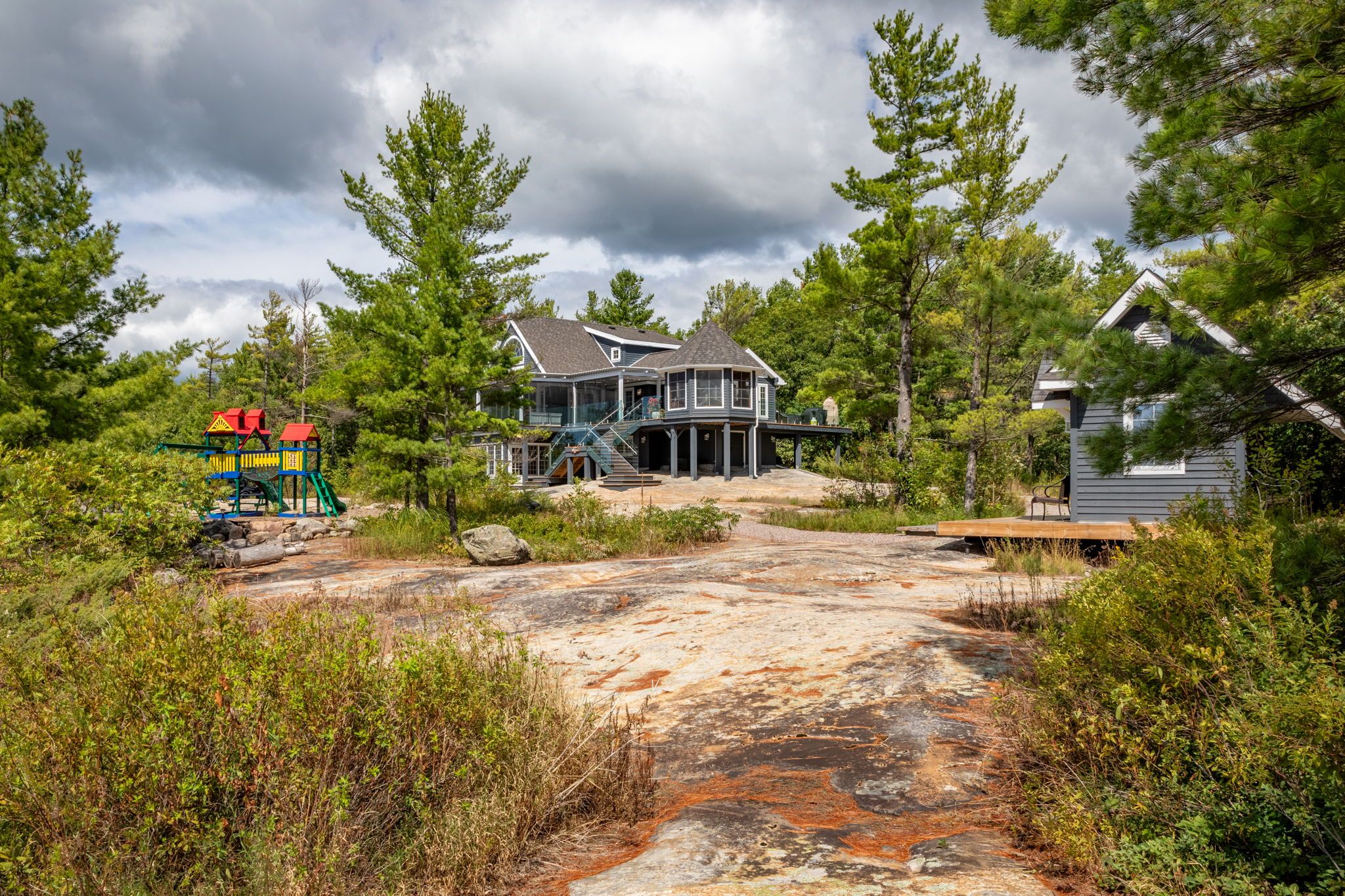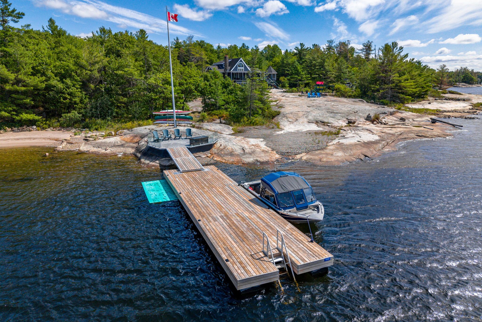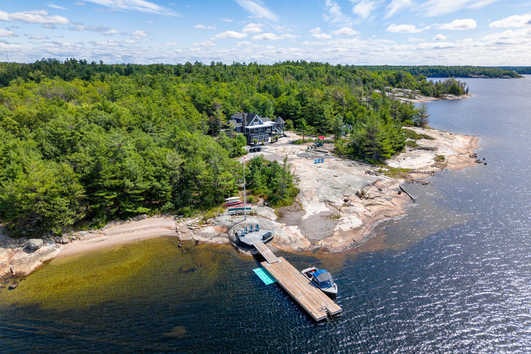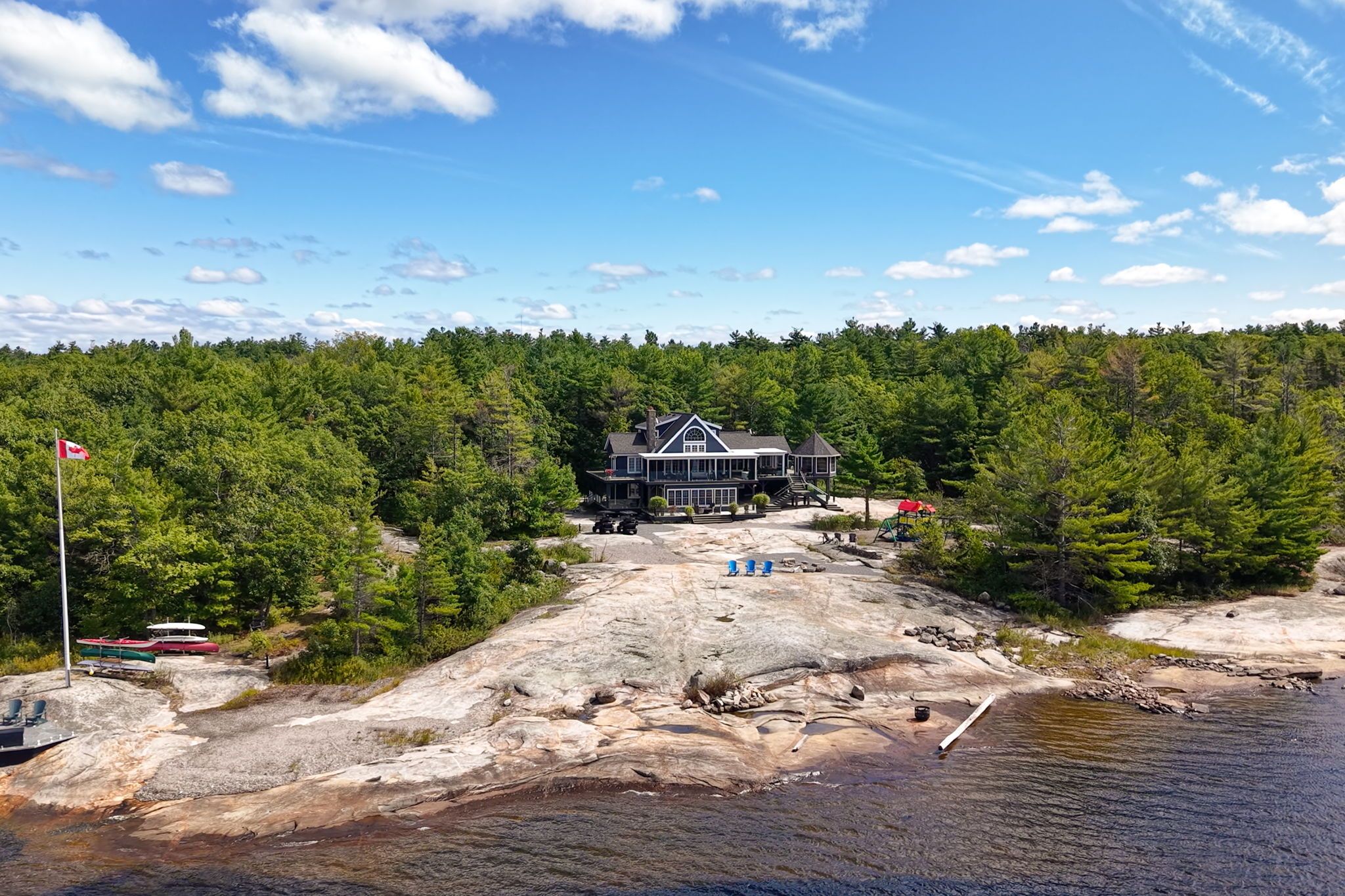 This property is truly a private paradise on the clear waters of georgian bay, where 20 spectacular acres of trees, granite and over 1700 feet of waterfront await your arrival. This exceptional 2 1/2 storey, 5-bedroom, 4-bathroom post and beam cottage offers the perfect blend of rustic charm and modern comfort, creating an unforgettable lakeside sanctuary. Your adventure begins with a scenic 15-20 minute boat ride from honey harbour marinas, delivering you to this secluded haven near the musquash river mouth. Enjoy the convenience of multiple docking systems and a floating double wet boathouse. The granite shore deck near the sandy beach area creates an elegant transition to the property. Landscaping combines crushed granite pathways with natural exposed rock formations creating stunning visual interest. Glass railings grace the expansive decks, providing unobstructed views and a louvered pergola system on the upper deck allows you to curate your outdoor experience. The main floor has a primary bedroom with ensuite, complemented by a convenient 2-piece bathroom and generous storage areas. The heart of the home features an open concept kitchen/dining area with spacious living room and a cozy wood-burning fireplace. A secondary sitting room provides additional gathering space for quiet moments. The walkout basement level transforms into an entertainer's dream with two additional bedrooms, bathroom facilities with separate shower, and a games room featuring its own wood-burning fireplace. The sunroom offers breathtaking water views and serves as the perfect morning coffee spot. A charming bunkie provides additional guest accommodation or serves as a peaceful retreat space. The western exposure ensures spectacular sunsets that paint the sky each evening, creating magical moments that will become treasured family memories. This remarkable waterfront estate offers the ultimate georgian bay experience, where natural beauty meets thoughtful design in perfect harmony.