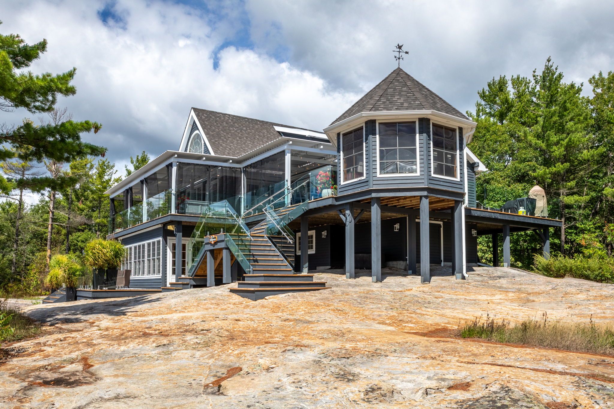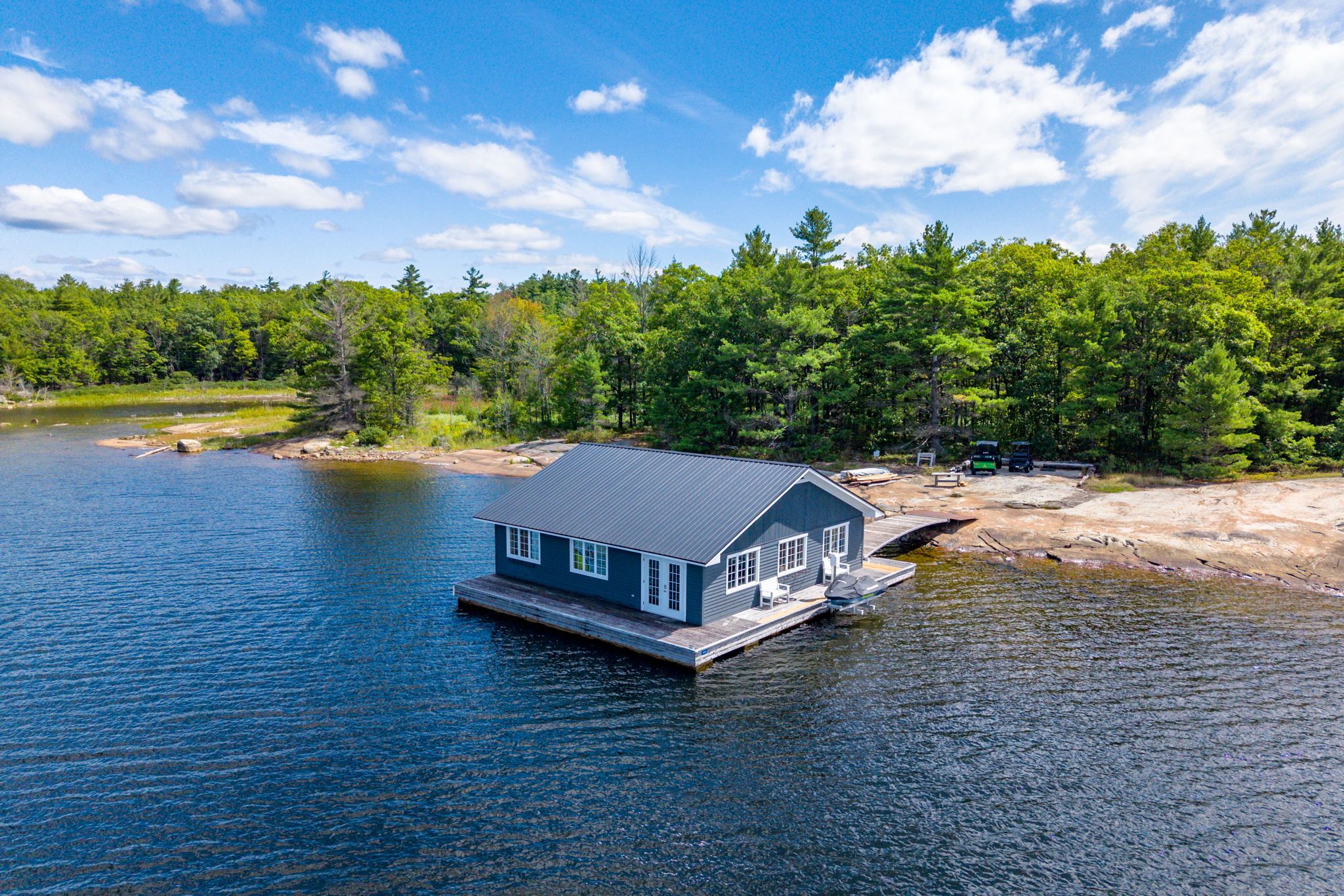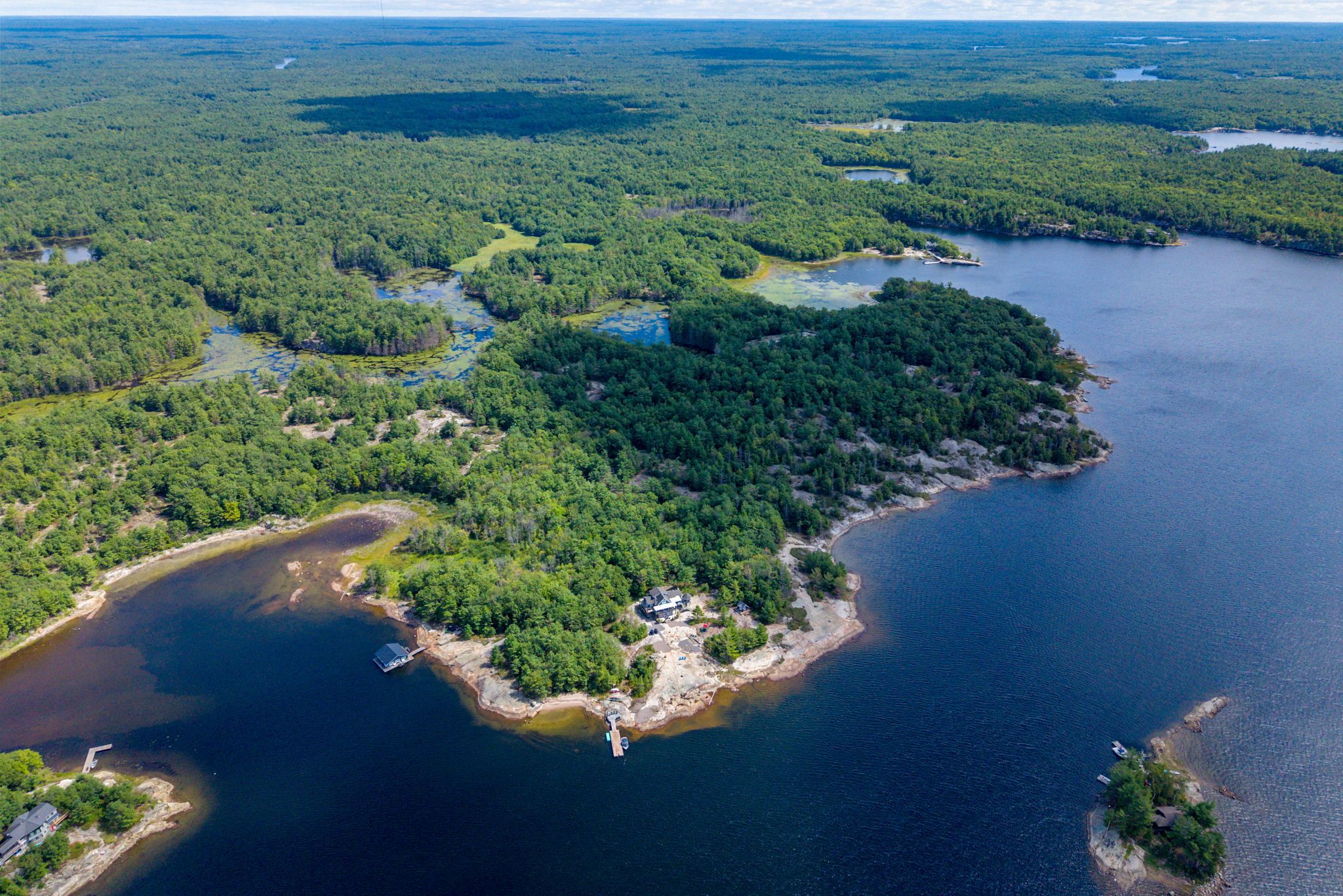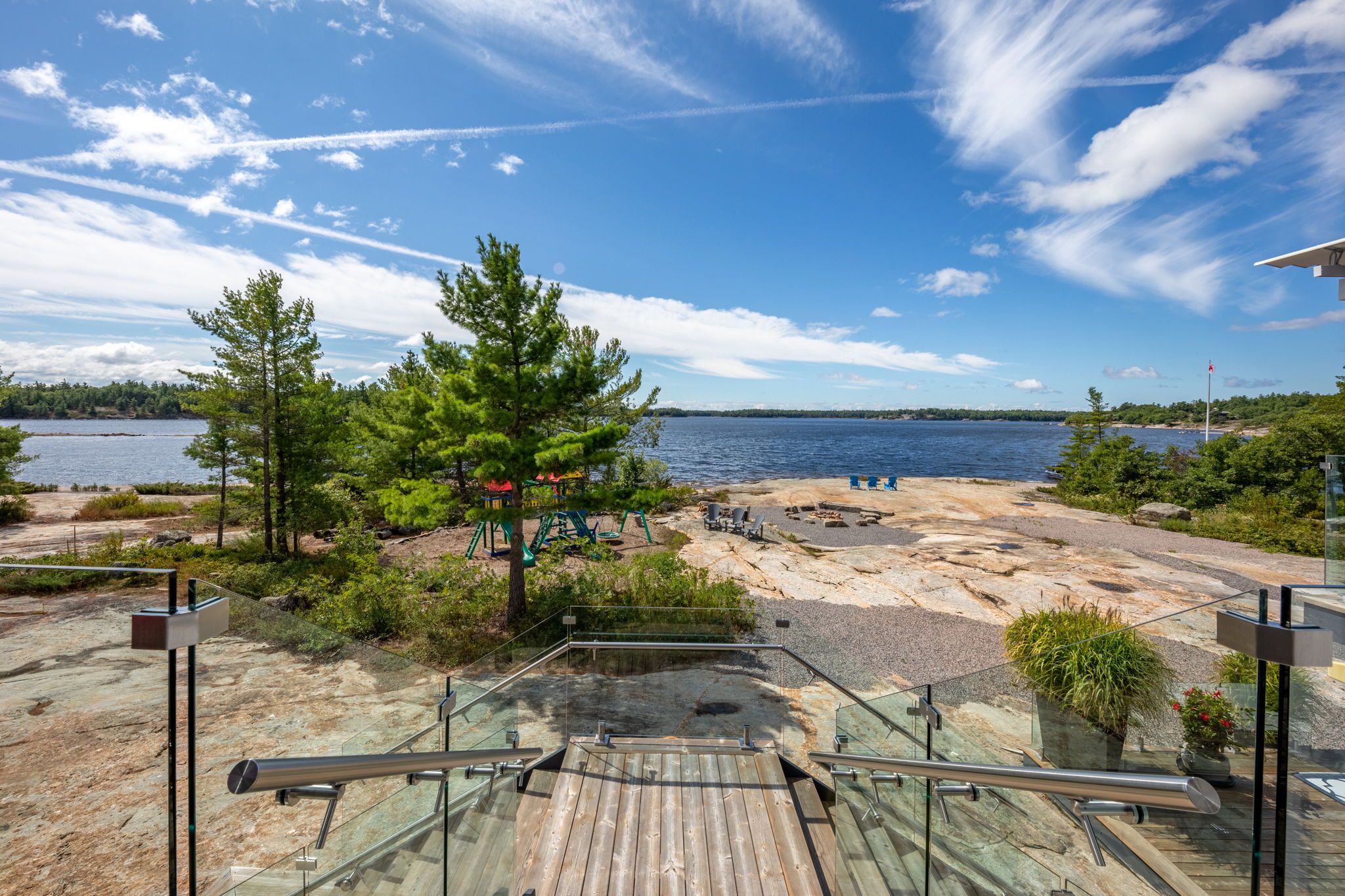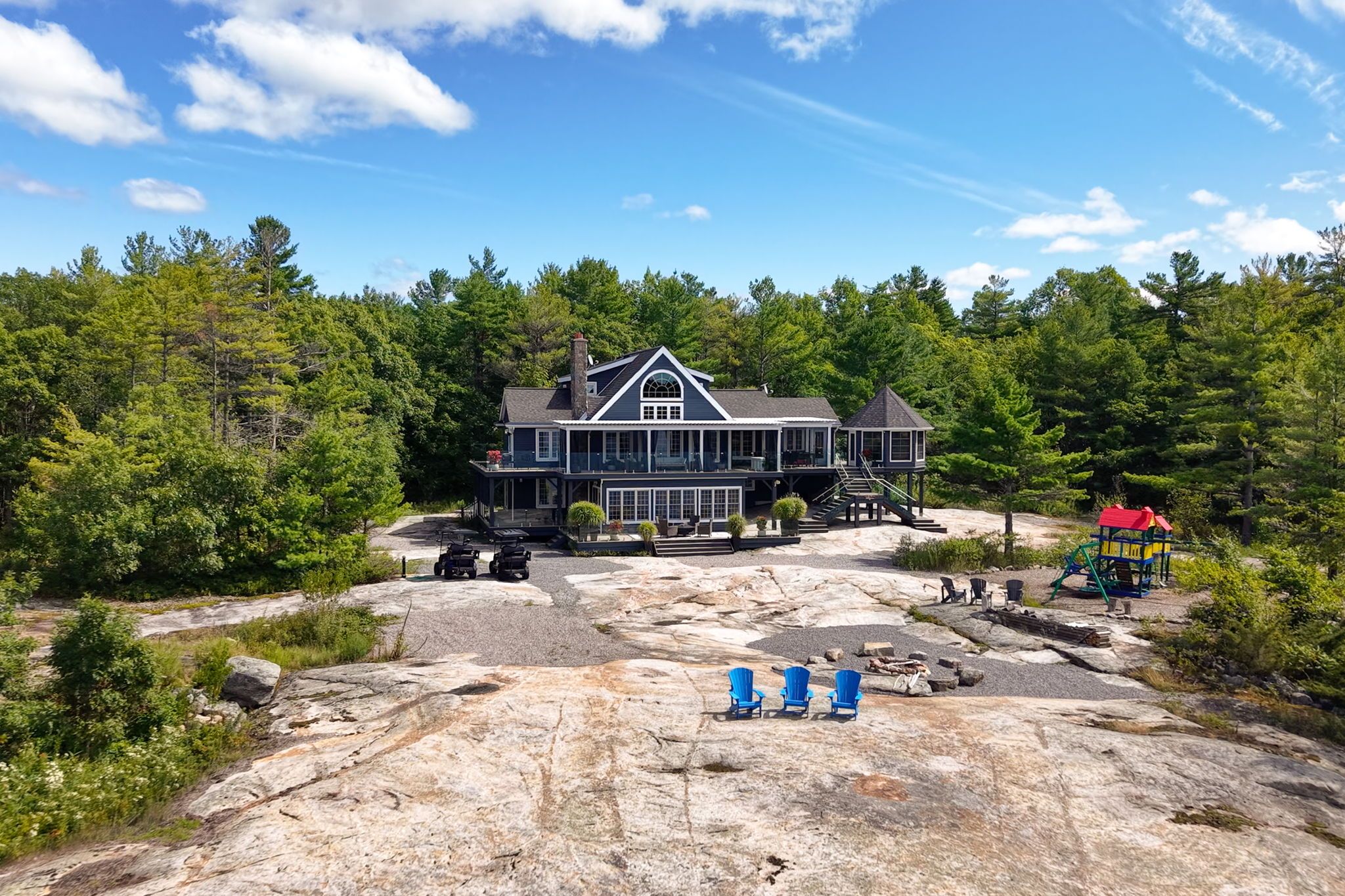 This property is truly a private paradise on the clear waters of georgian bay, where 20 spectacular acres of trees, granite and over 1700 feet of waterfront await your arrival. This exceptional 2 1/2 storey, 5-bedroom, 4-bathroom post and beam cottage offers the perfect blend of rustic charm and modern comfort, creating an unforgettable lakeside sanctuary. Your adventure begins with a scenic 15-20 minute boat ride from honey harbour marinas, delivering you to this secluded haven near the musquash river mouth. Enjoy the convenience of multiple docking systems and a floating double wet boathouse. The granite shore deck near the sandy beach area creates an elegant transition to the property. Landscaping combines crushed granite pathways with natural exposed rock formations creating stunning visual interest. Glass railings grace the expansive decks, providing unobstructed views and a louvered pergola system on the upper deck allows you to curate your outdoor experience. The main floor has a primary bedroom with ensuite, complemented by a convenient 2-piece bathroom and generous storage areas. The heart of the home features an open concept kitchen/dining area with spacious living room and a cozy wood-burning fireplace. A secondary sitting room provides additional gathering space for quiet moments. The walkout basement level transforms into an entertainer's dream with two additional bedrooms, bathroom facilities with separate shower, and a games room featuring its own wood-burning fireplace. The sunroom offers breathtaking water views and serves as the perfect morning coffee spot. A charming bunkie provides additional guest accommodation or serves as a peaceful retreat space. The western exposure ensures spectacular sunsets that paint the sky each evening, creating magical moments that will become treasured family memories. This remarkable waterfront estate offers the ultimate georgian bay experience, where natural beauty meets thoughtful design in perfect harmony.
