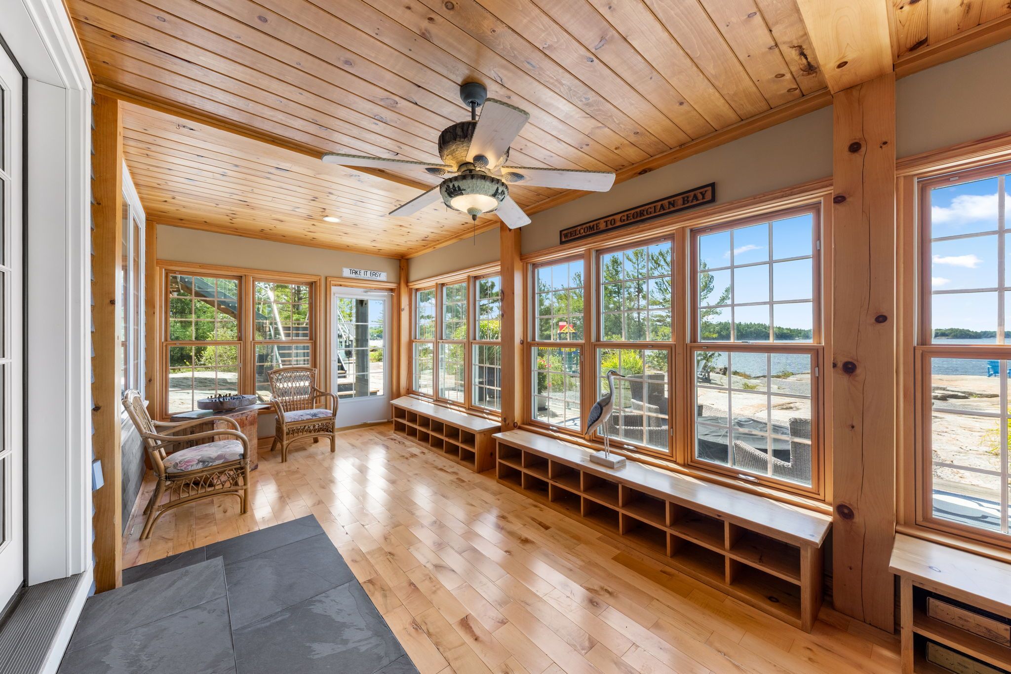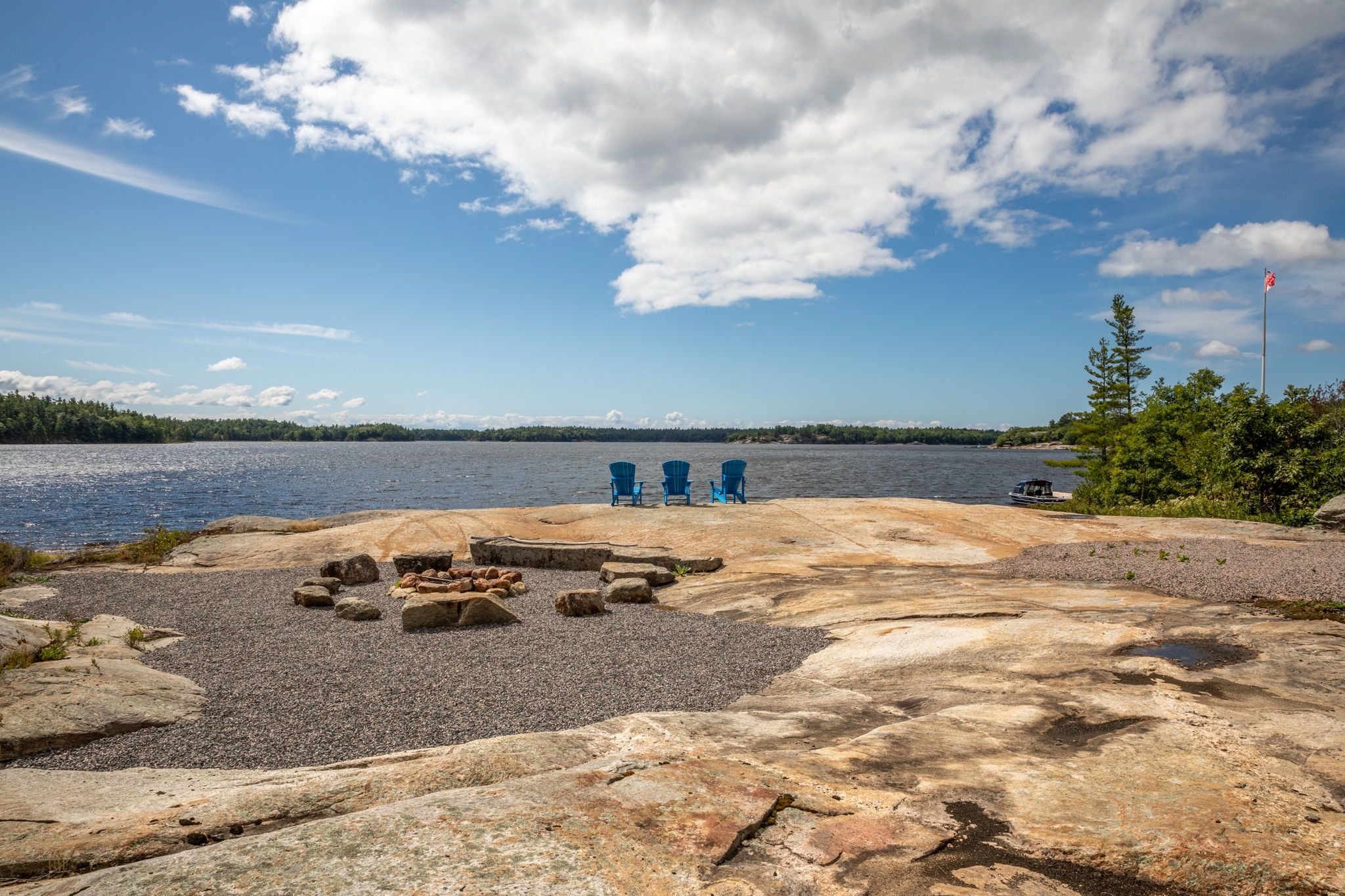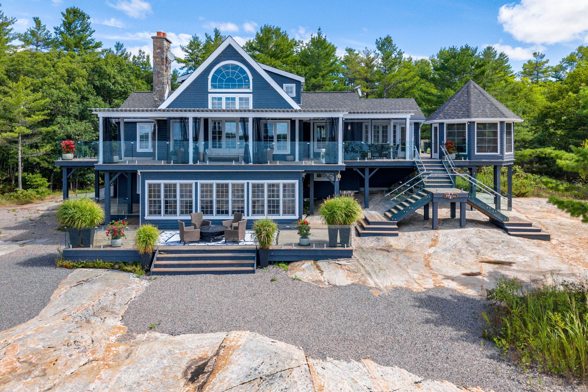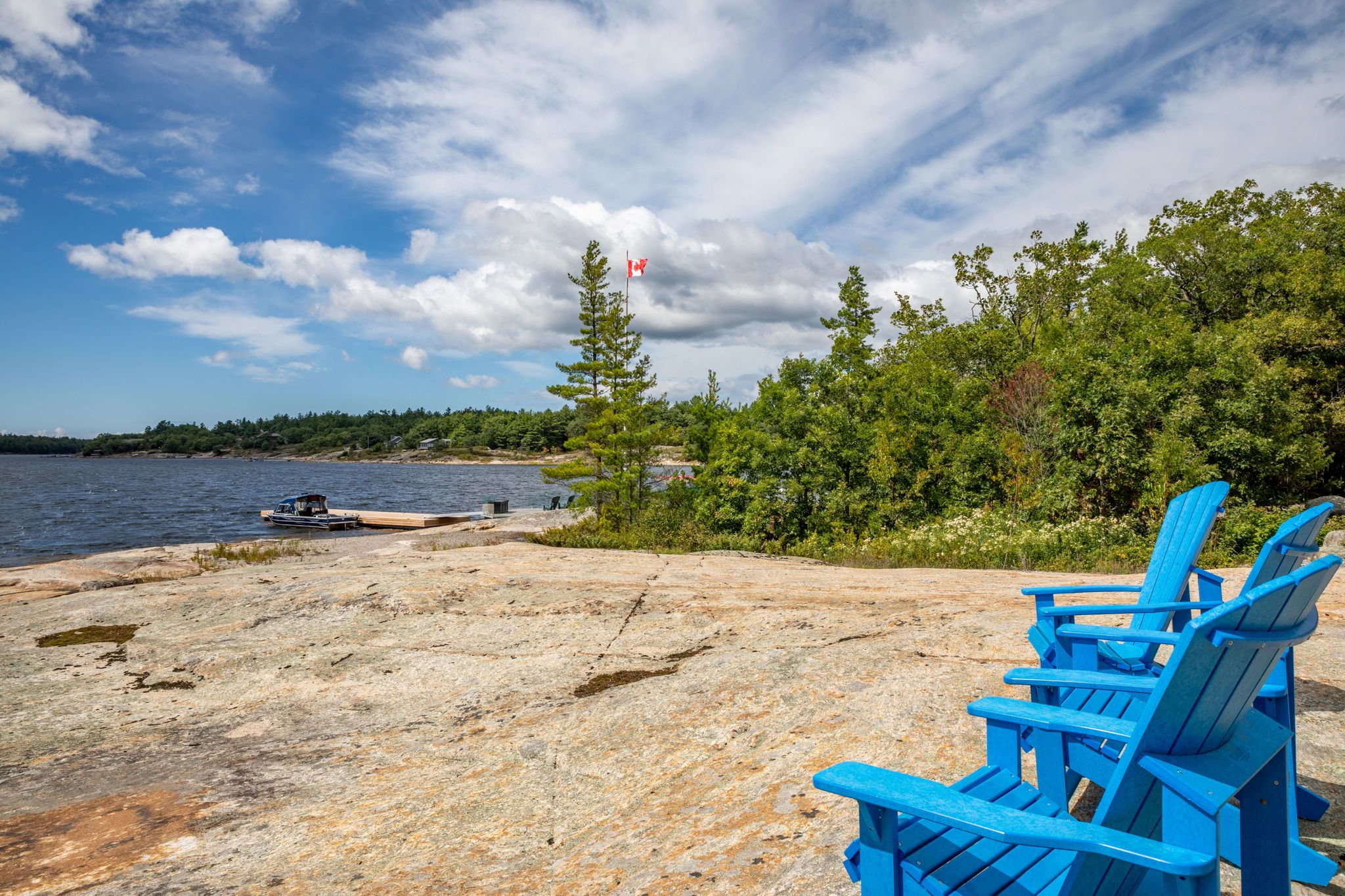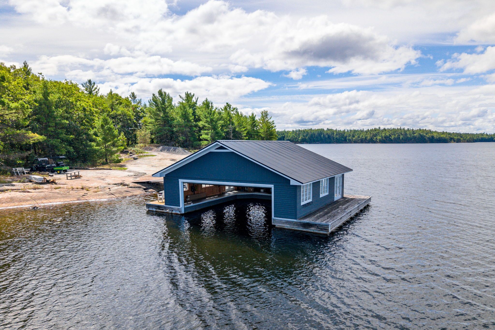This property is truly a private paradise on the clear waters of georgian bay, where 20 spectacular acres of trees, granite and over 1700 feet of waterfront await your arrival. This exceptional 2 1/2 storey, 5-bedroom, 4-bathroom post and beam cottage offers the perfect blend of rustic charm and modern comfort, creating an unforgettable lakeside sanctuary. Your adventure begins with a scenic 15-20 minute boat ride from honey harbour marinas, delivering you to this secluded haven near the musquash river mouth. Enjoy the convenience of multiple docking systems and a floating double wet boathouse. The granite shore deck near the sandy beach area creates an elegant transition to the property. Landscaping combines crushed granite pathways with natural exposed rock formations creating stunning visual interest. Glass railings grace the expansive decks, providing unobstructed views and a louvered pergola system on the upper deck allows you to curate your outdoor experience. The main floor has a primary bedroom with ensuite, complemented by a convenient 2-piece bathroom and generous storage areas. The heart of the home features an open concept kitchen/dining area with spacious living room and a cozy wood-burning fireplace. A secondary sitting room provides additional gathering space for quiet moments. The walkout basement level transforms into an entertainer's dream with two additional bedrooms, bathroom facilities with separate shower, and a games room featuring its own wood-burning fireplace. The sunroom offers breathtaking water views and serves as the perfect morning coffee spot. A charming bunkie provides additional guest accommodation or serves as a peaceful retreat space. The western exposure ensures spectacular sunsets that paint the sky each evening, creating magical moments that will become treasured family memories. This remarkable waterfront estate offers the ultimate georgian bay experience, where natural beauty meets thoughtful design in perfect harmony.