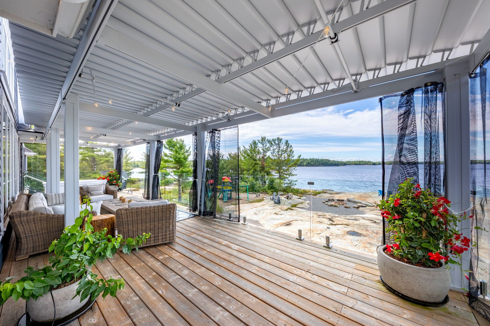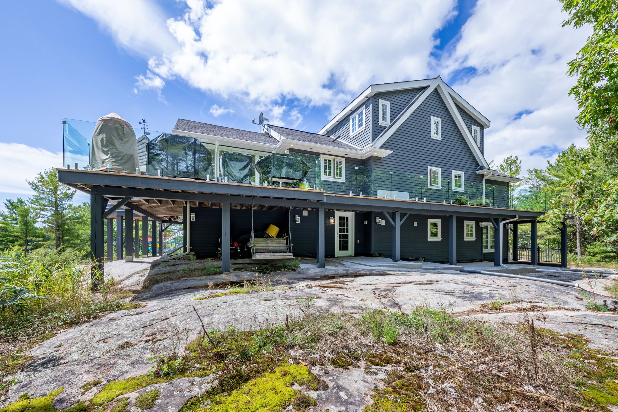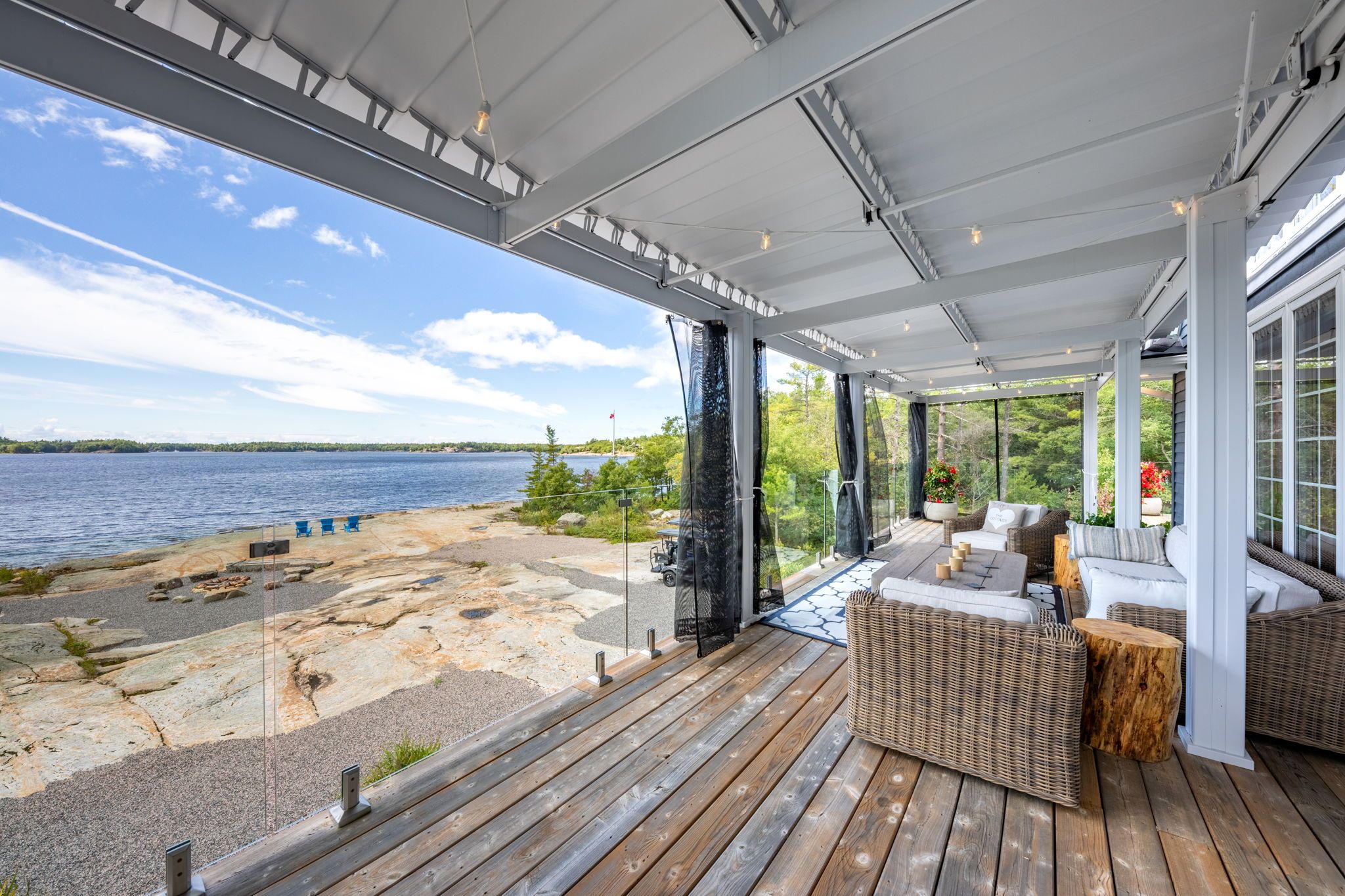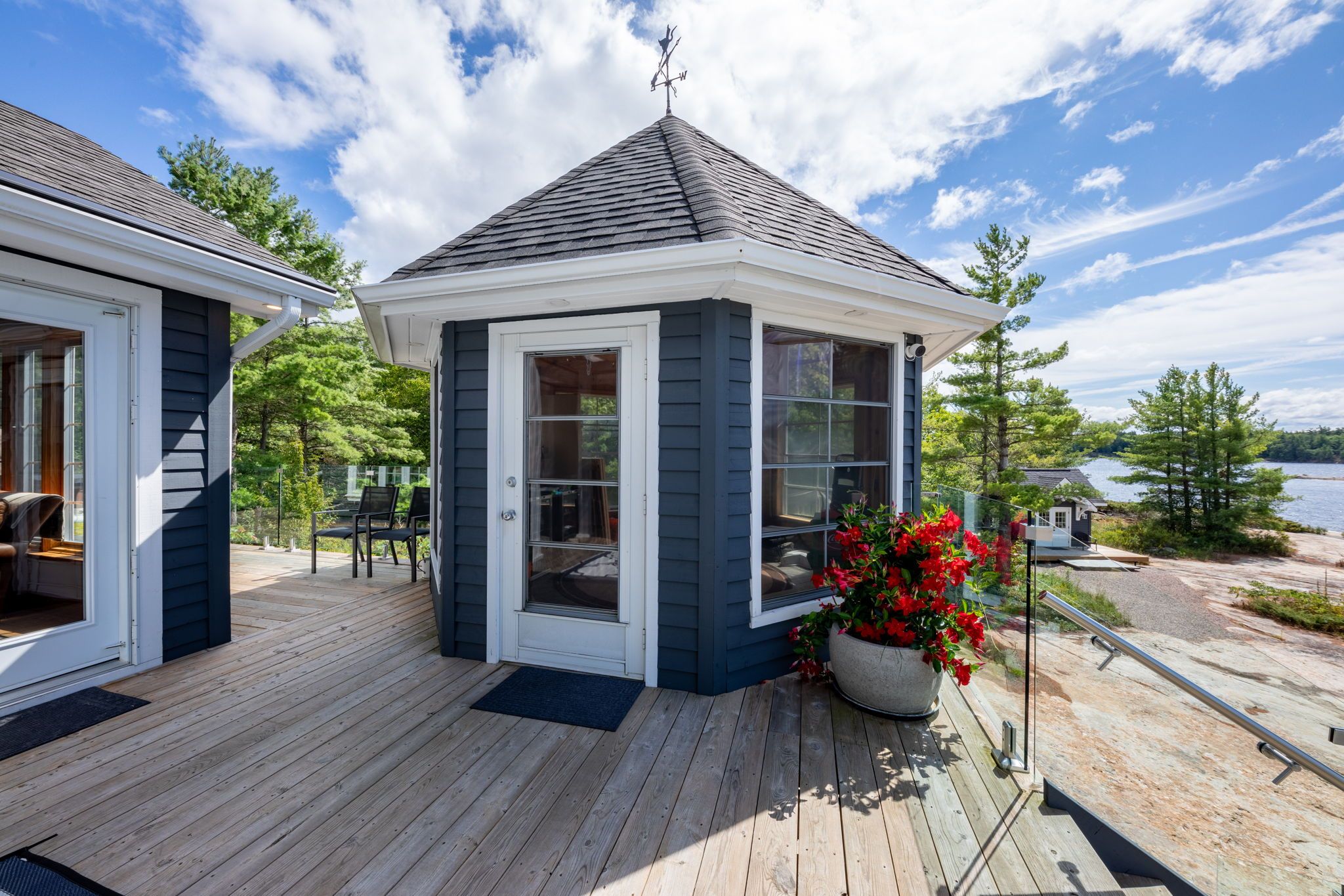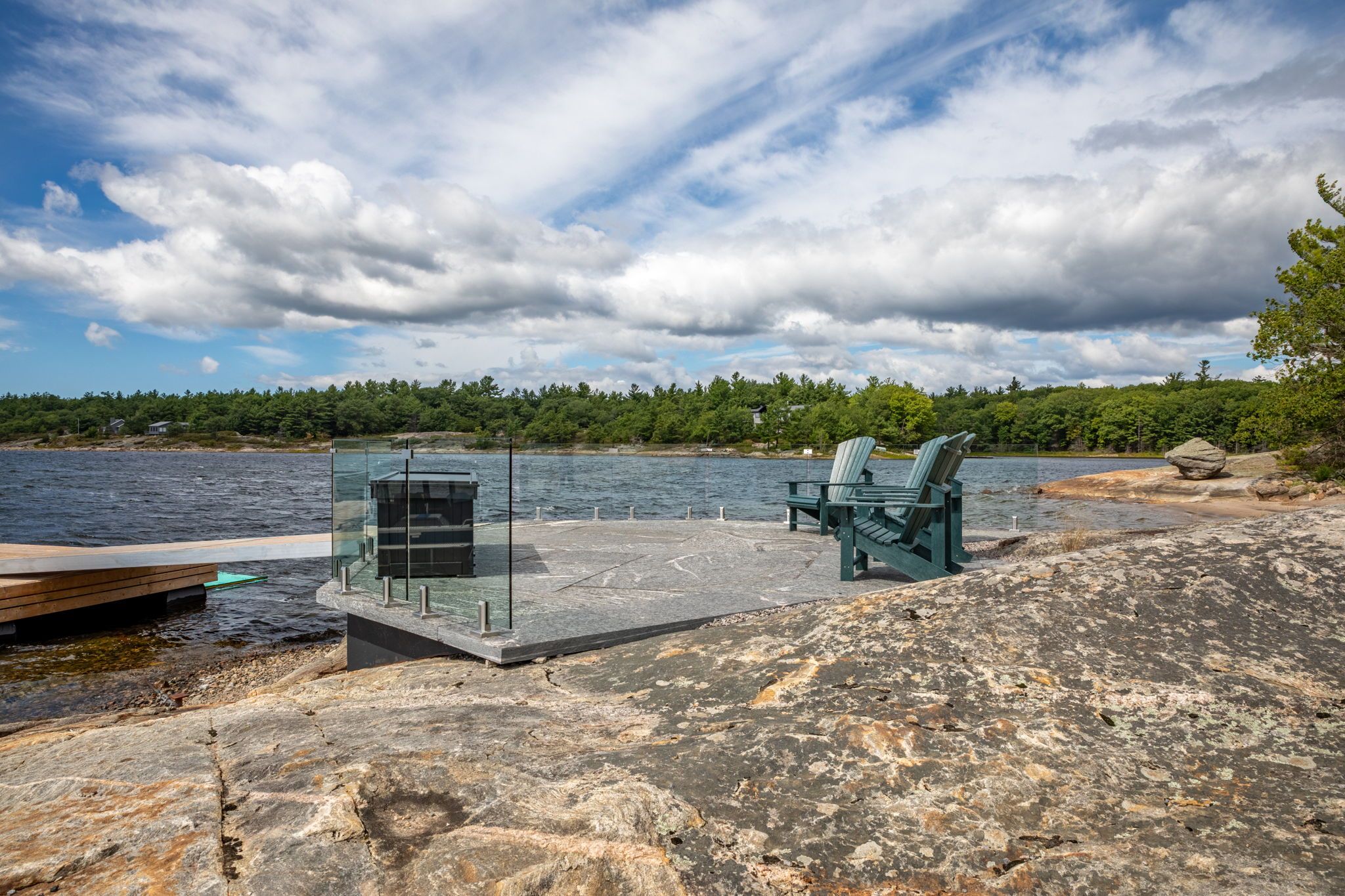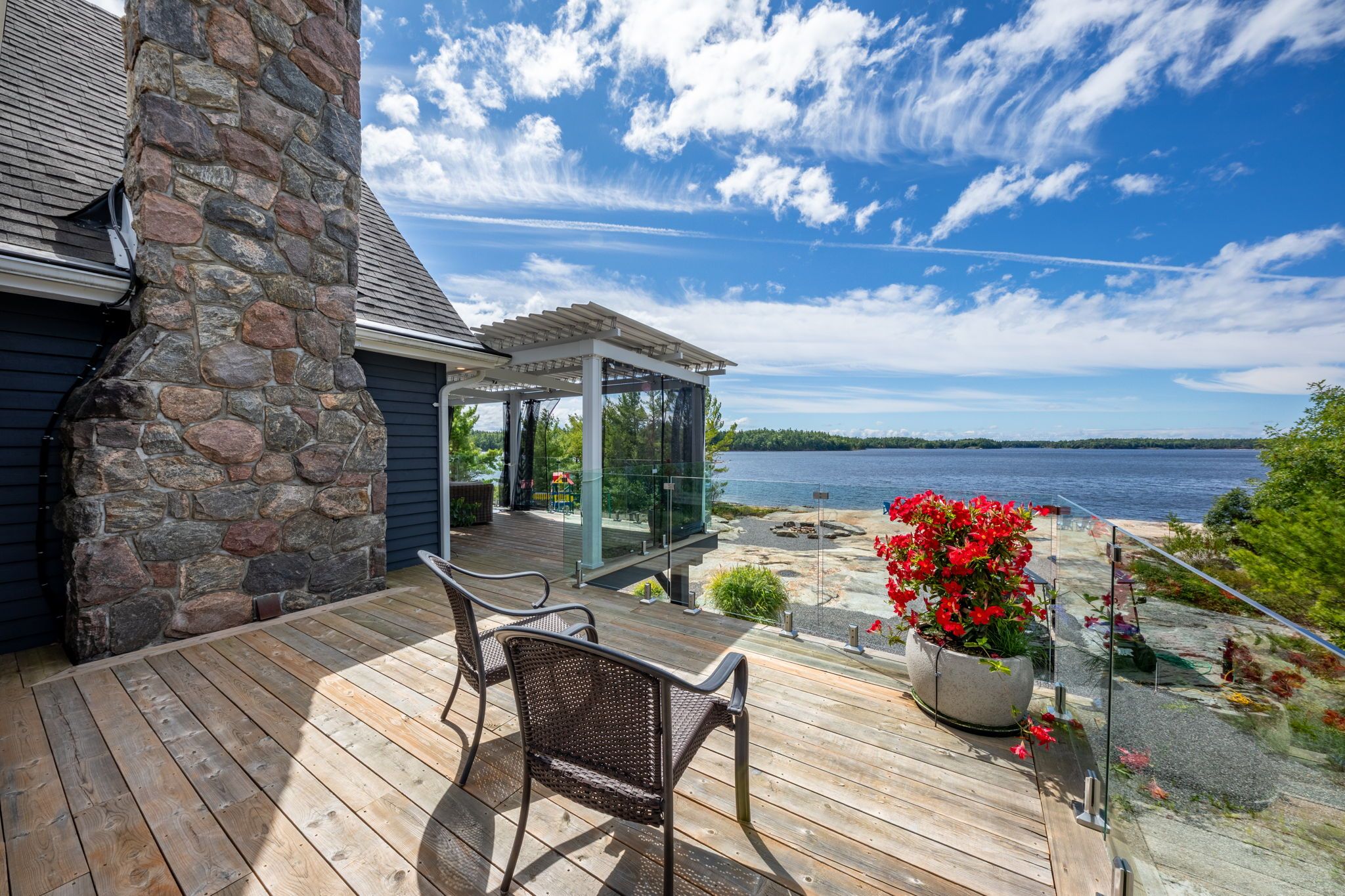 This property is truly a private paradise on the clear waters of georgian bay, where 20 spectacular acres of trees, granite and over 1700 feet of waterfront await your arrival. This exceptional 2 1/2 storey, 5-bedroom, 4-bathroom post and beam cottage offers the perfect blend of rustic charm and modern comfort, creating an unforgettable lakeside sanctuary. Your adventure begins with a scenic 15-20 minute boat ride from honey harbour marinas, delivering you to this secluded haven near the musquash river mouth. Enjoy the convenience of multiple docking systems and a floating double wet boathouse. The granite shore deck near the sandy beach area creates an elegant transition to the property. Landscaping combines crushed granite pathways with natural exposed rock formations creating stunning visual interest. Glass railings grace the expansive decks, providing unobstructed views and a louvered pergola system on the upper deck allows you to curate your outdoor experience. The main floor has a primary bedroom with ensuite, complemented by a convenient 2-piece bathroom and generous storage areas. The heart of the home features an open concept kitchen/dining area with spacious living room and a cozy wood-burning fireplace. A secondary sitting room provides additional gathering space for quiet moments. The walkout basement level transforms into an entertainer's dream with two additional bedrooms, bathroom facilities with separate shower, and a games room featuring its own wood-burning fireplace. The sunroom offers breathtaking water views and serves as the perfect morning coffee spot. A charming bunkie provides additional guest accommodation or serves as a peaceful retreat space. The western exposure ensures spectacular sunsets that paint the sky each evening, creating magical moments that will become treasured family memories. This remarkable waterfront estate offers the ultimate georgian bay experience, where natural beauty meets thoughtful design in perfect harmony.