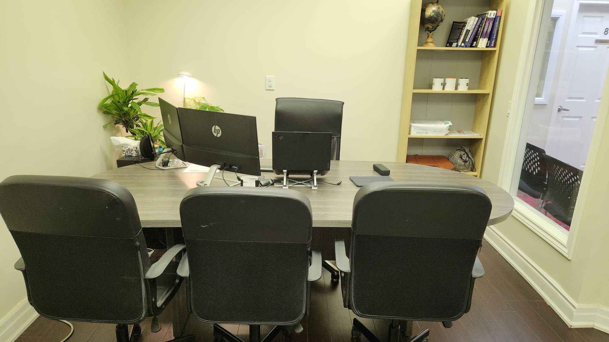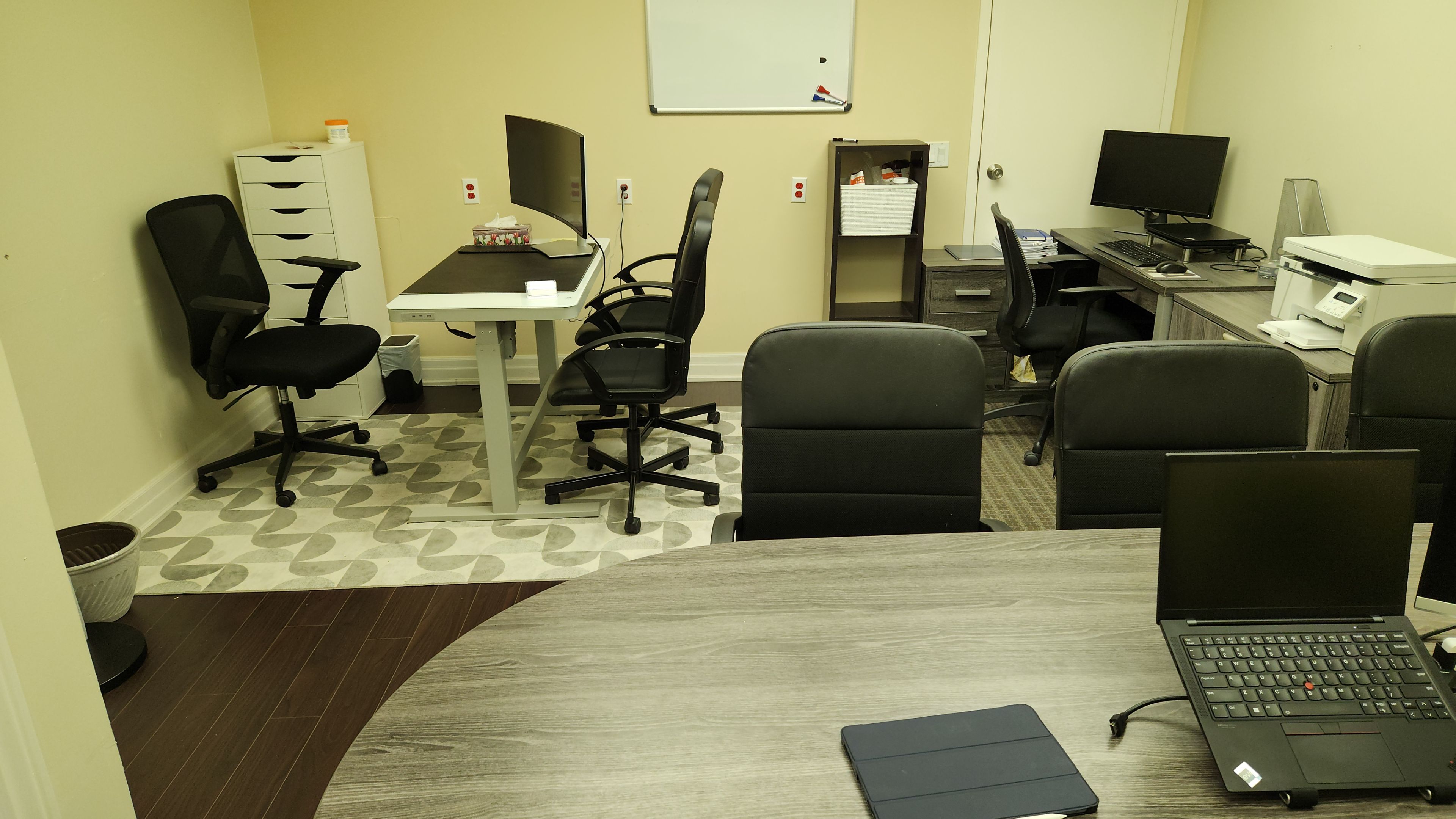 • Office includes desk, meeting table, and seating for clients.