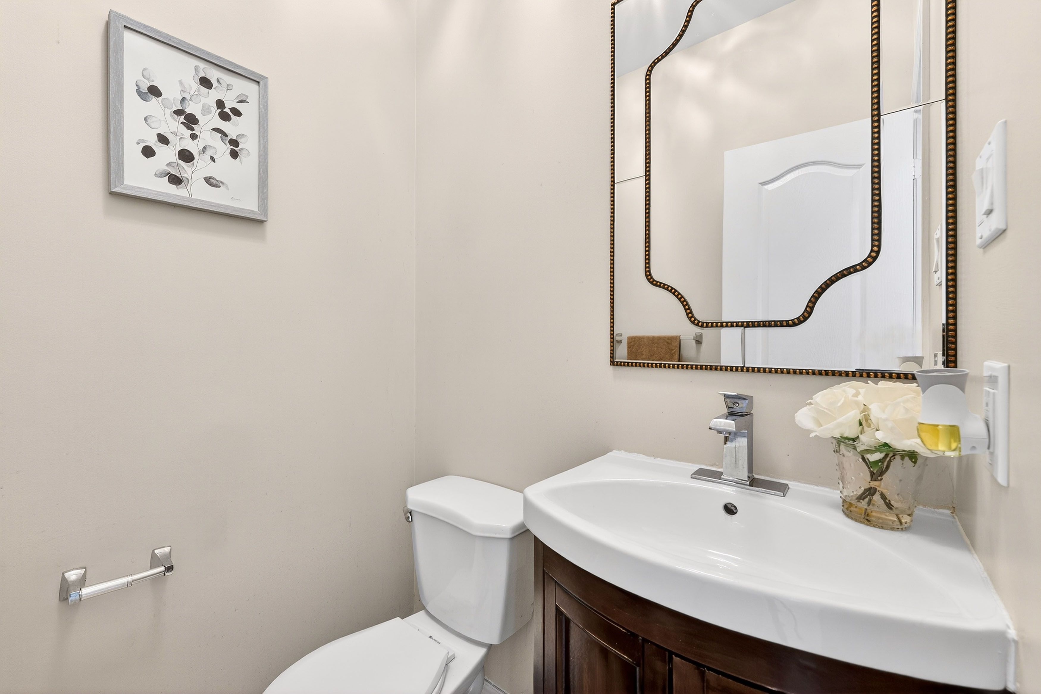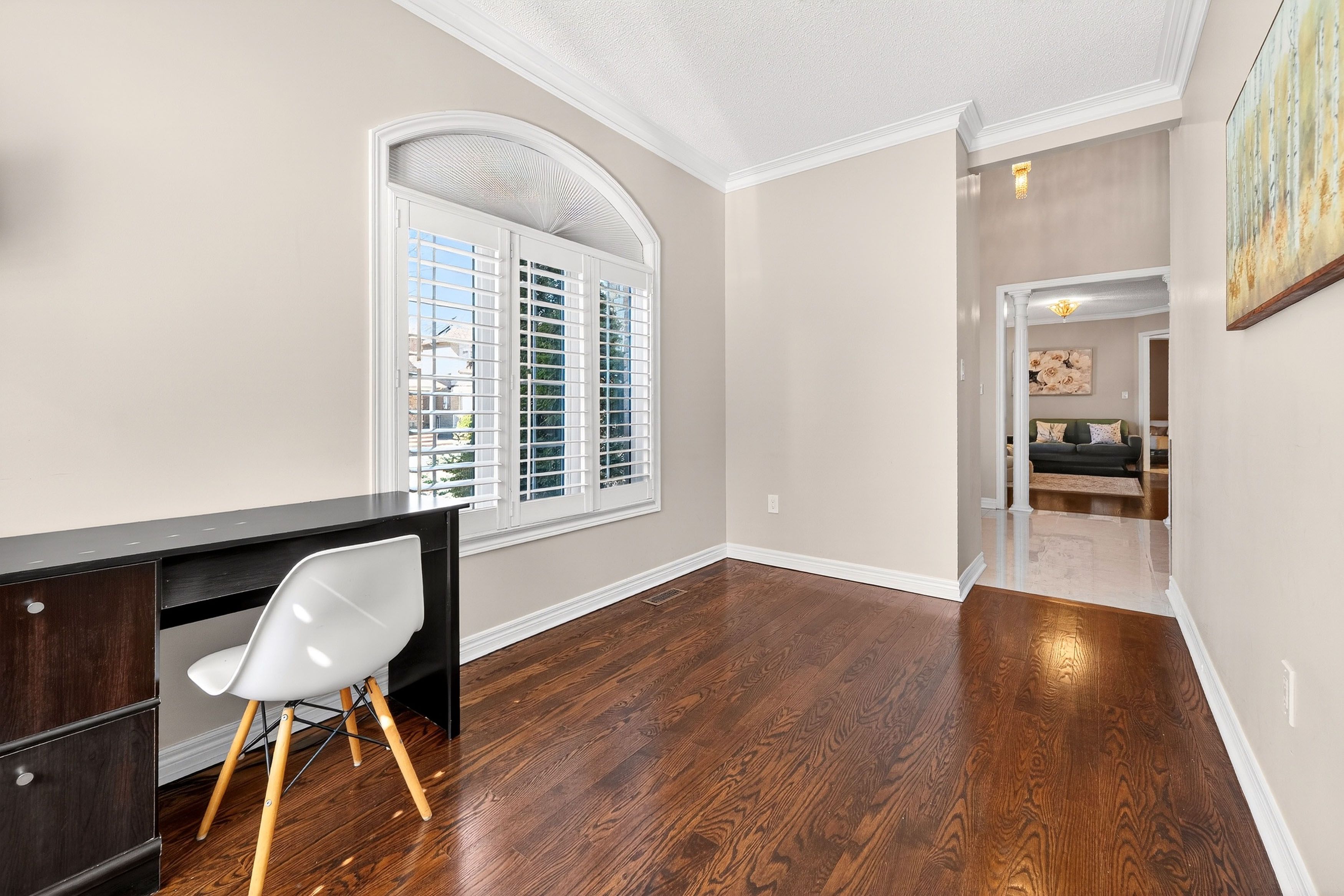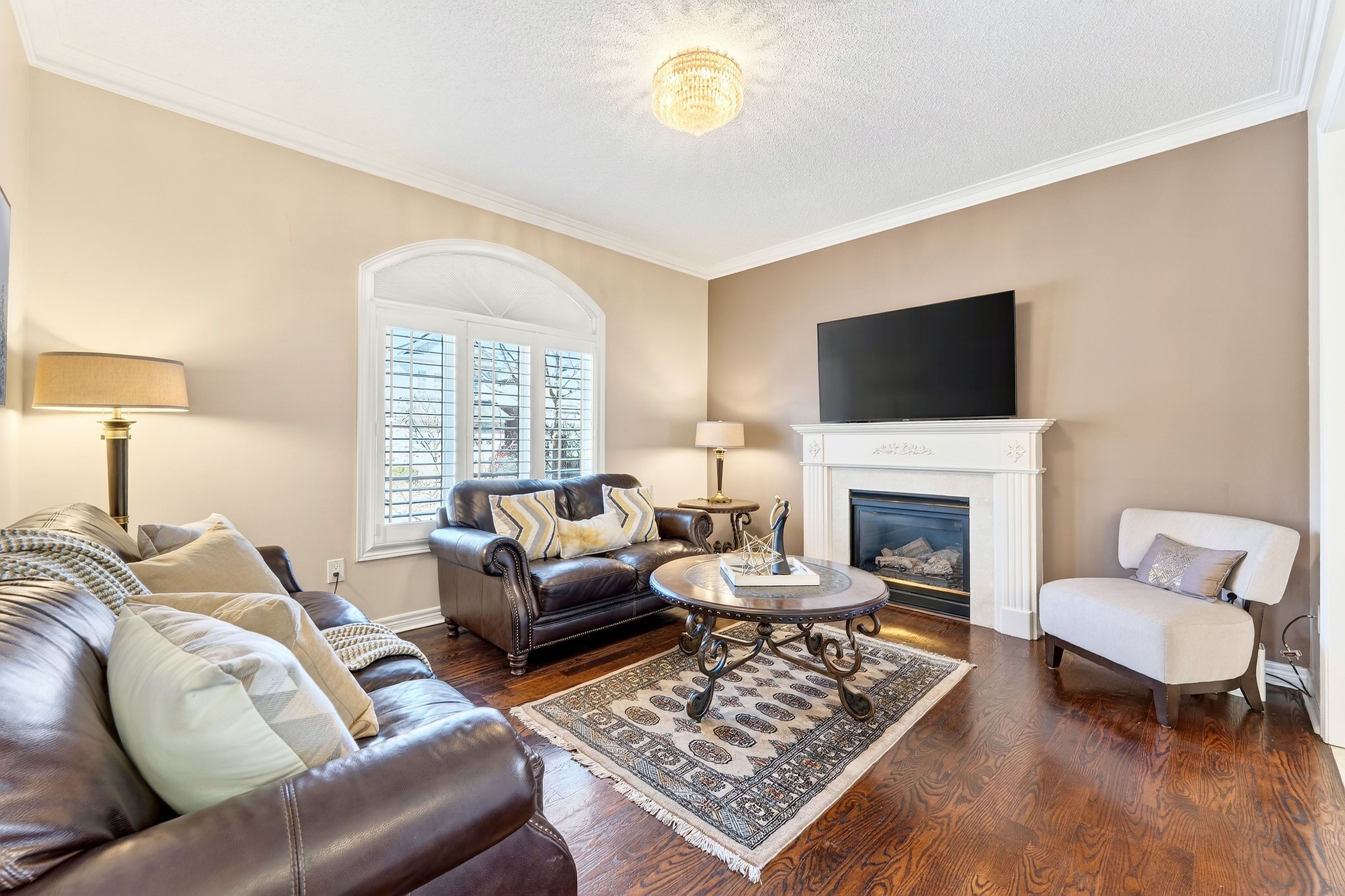 • Spacious layout with hardwood flooring, crown moulding, and 9-foot ceilings.