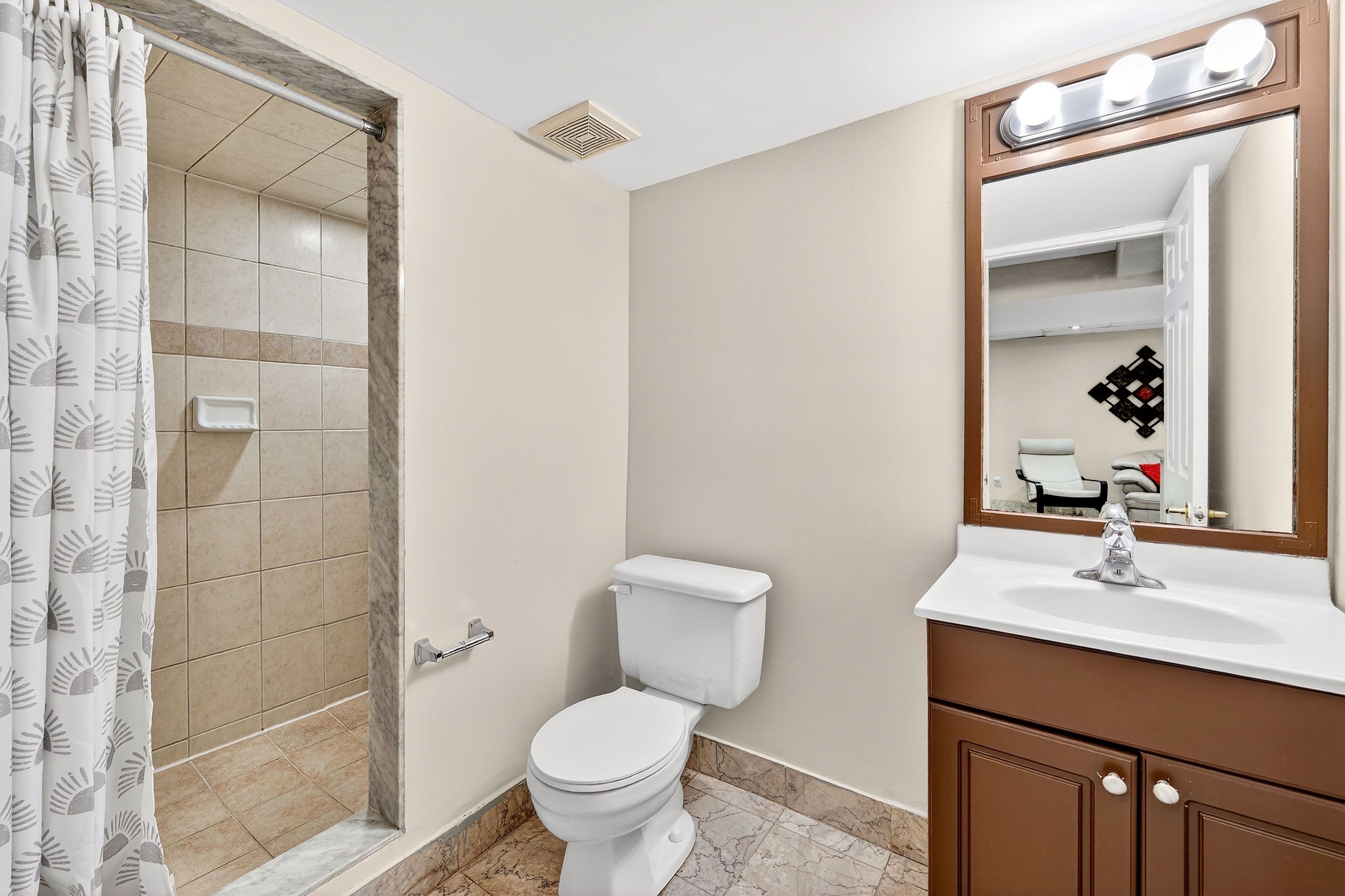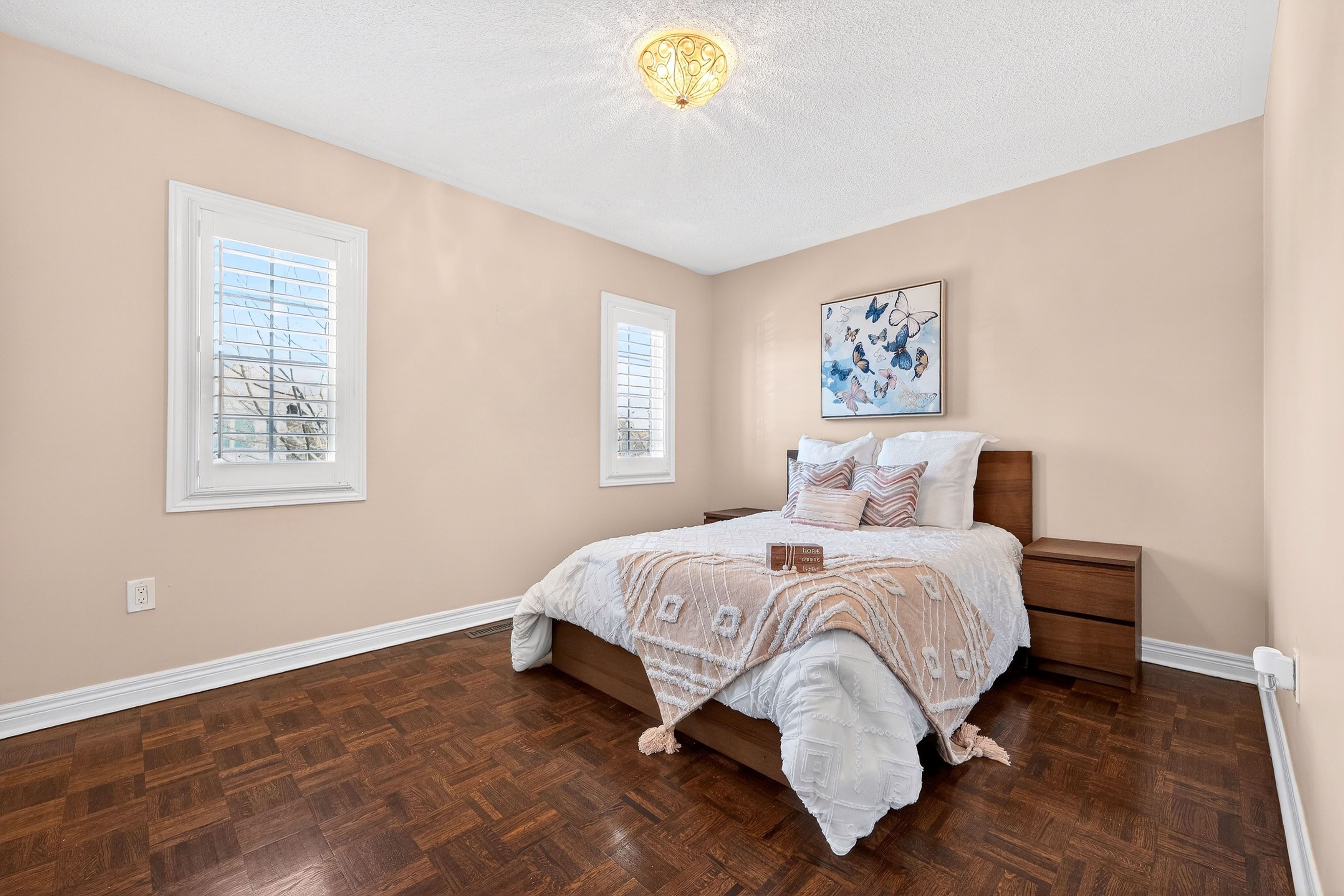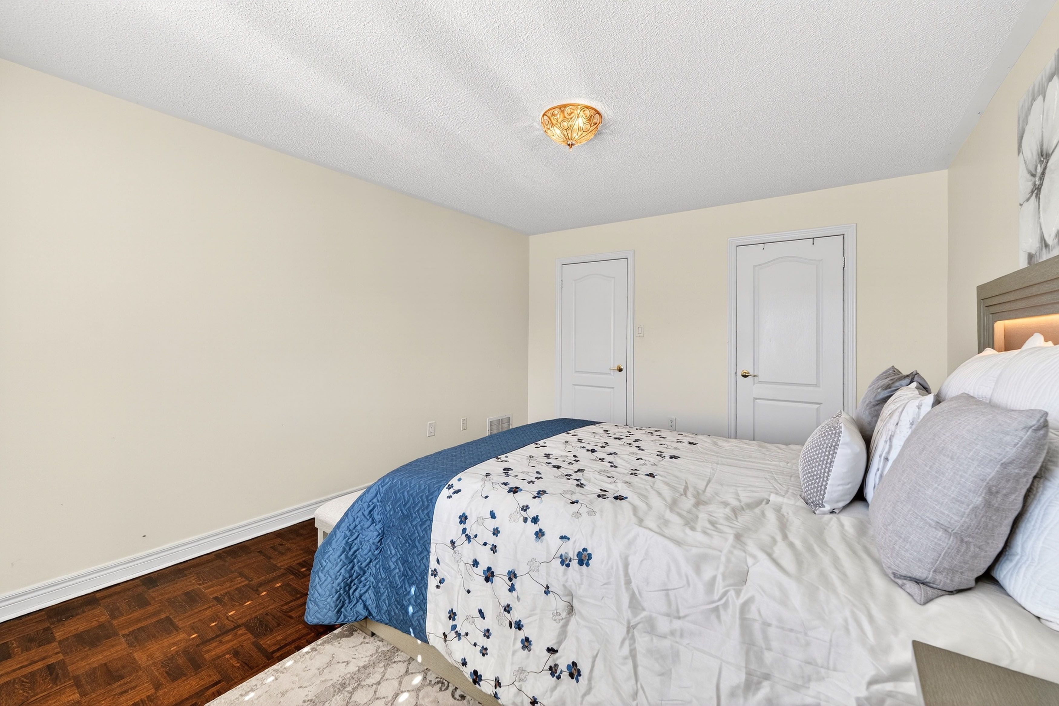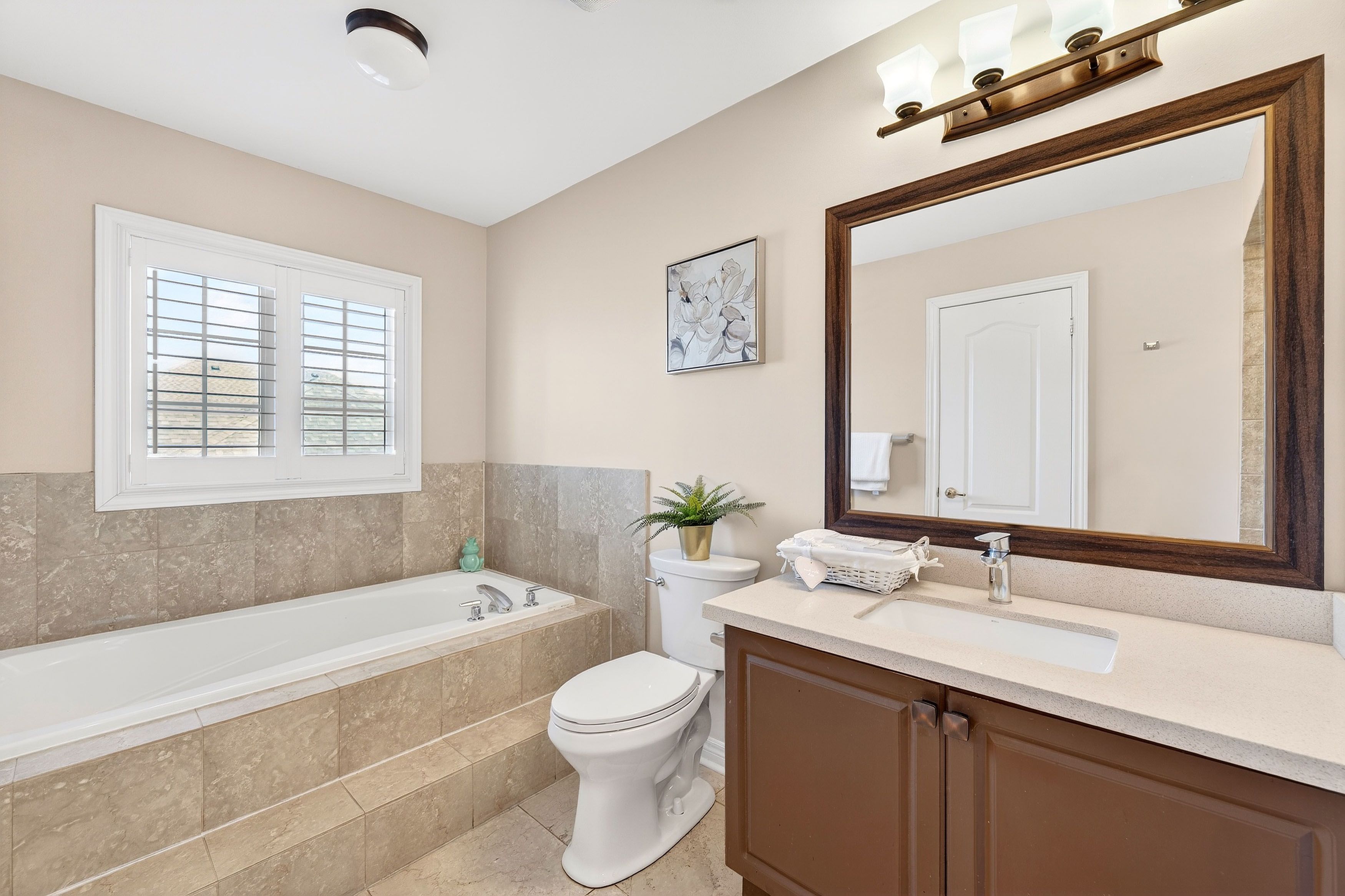 • Spacious layout with hardwood flooring, crown moulding, and 9-foot ceilings.
