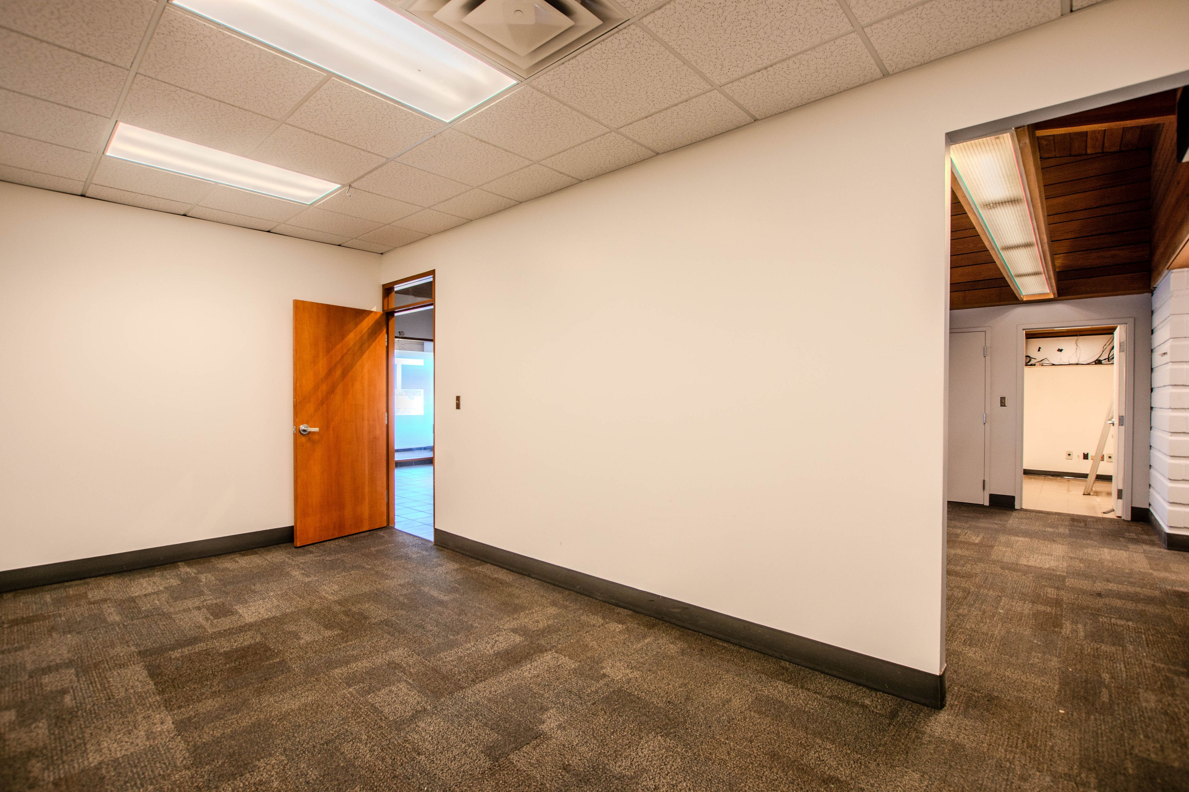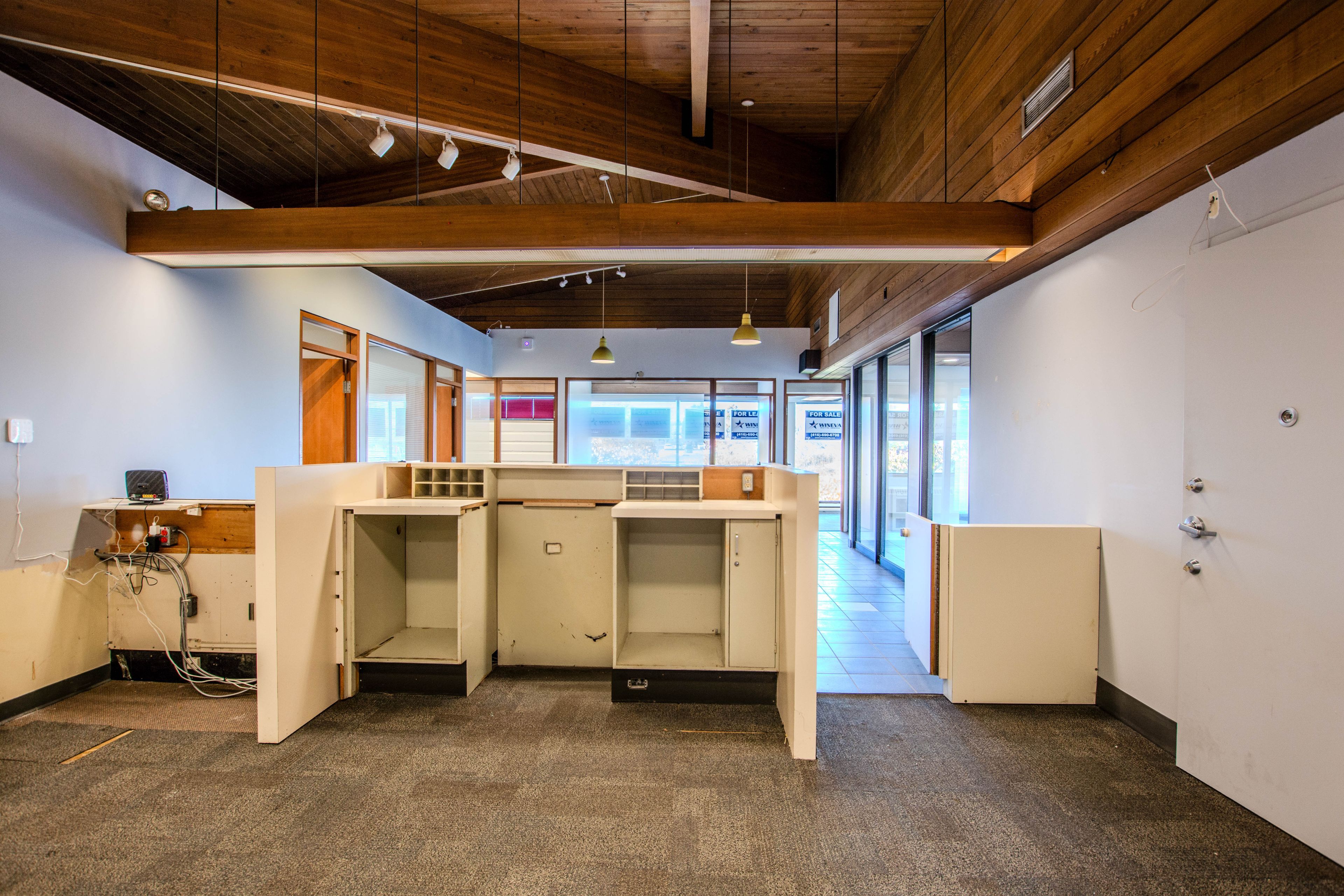 • Former bank space includes private offices, multiple bathrooms, and storage areas.
