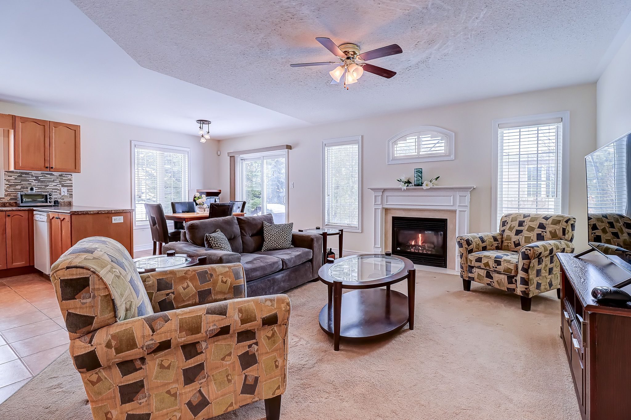 Rosedale village gated adult lifestyle living at its best - rarely available, bright and sunny end unit penelope rose bungalow townhouse. Lots of natural sunshine, open concept main level, appliances, backsplash, gas f/p, primary features 4 piece ensuite. Nicely finished basement with porcelain tiles, 2 extra rooms and bathroom - great for company! Original owners. Beautiful clubhouse, i/d saltwater pool, sauna, exercise room, party rooms, shuffleboard, private golf course (fees incl.), tennis, pickleball, bocce ball, and so much more! Lawn care & snow removal included too!, 24 hours gated security. Flexible closing.