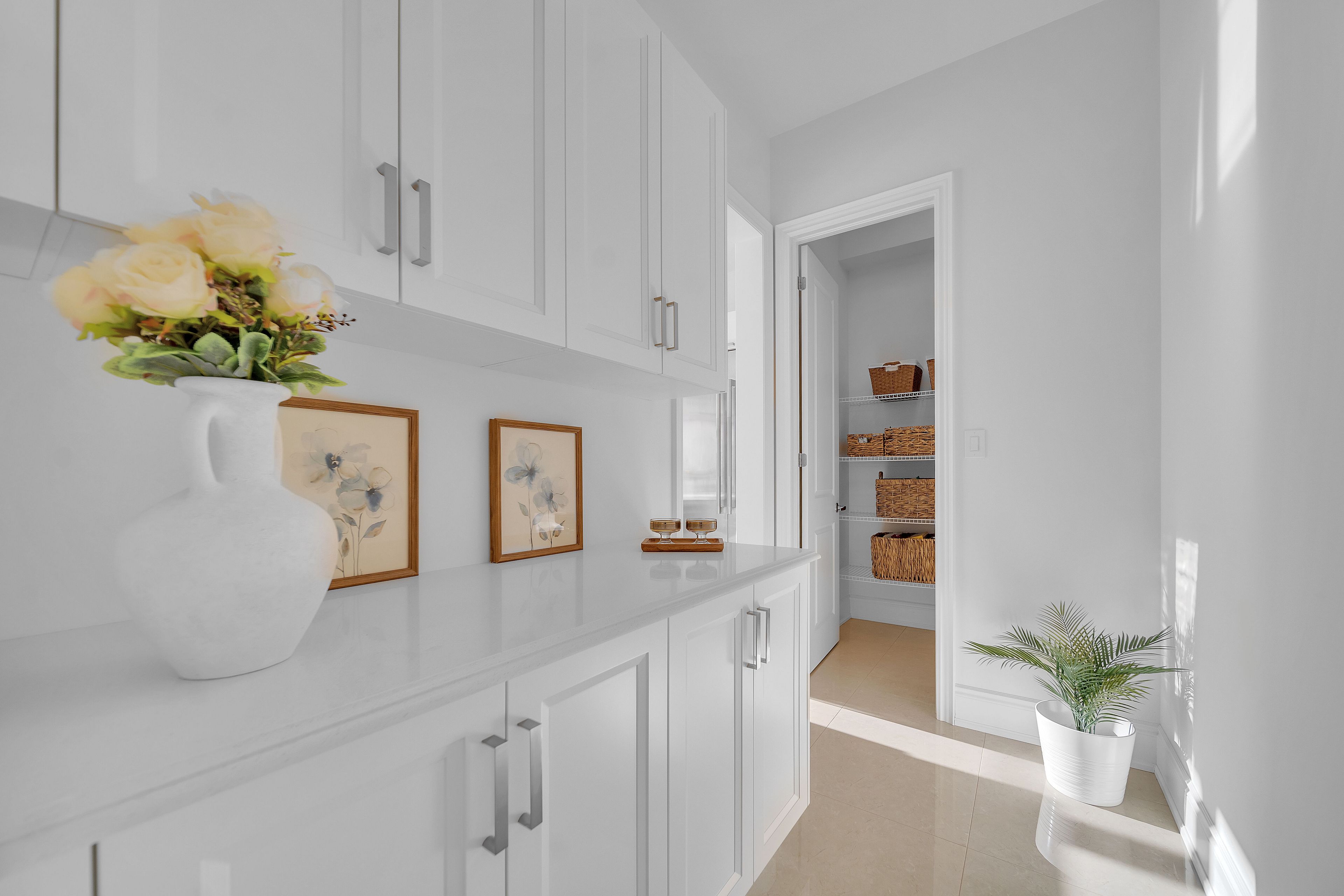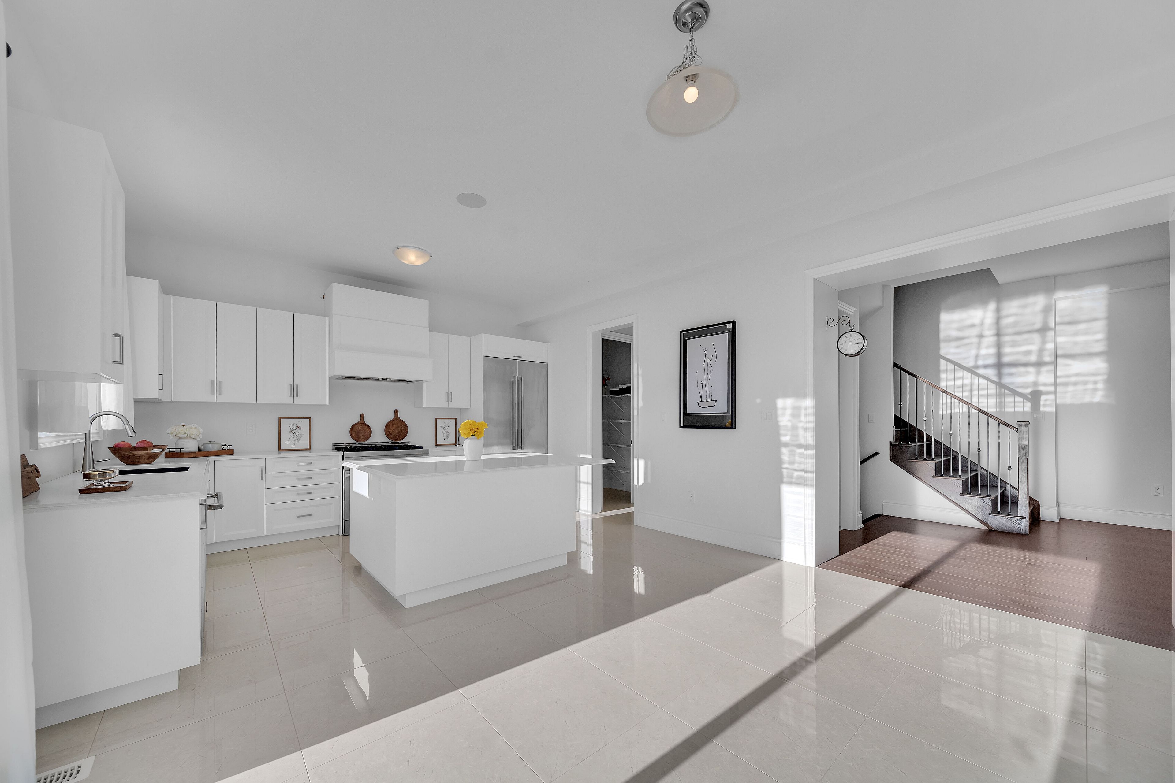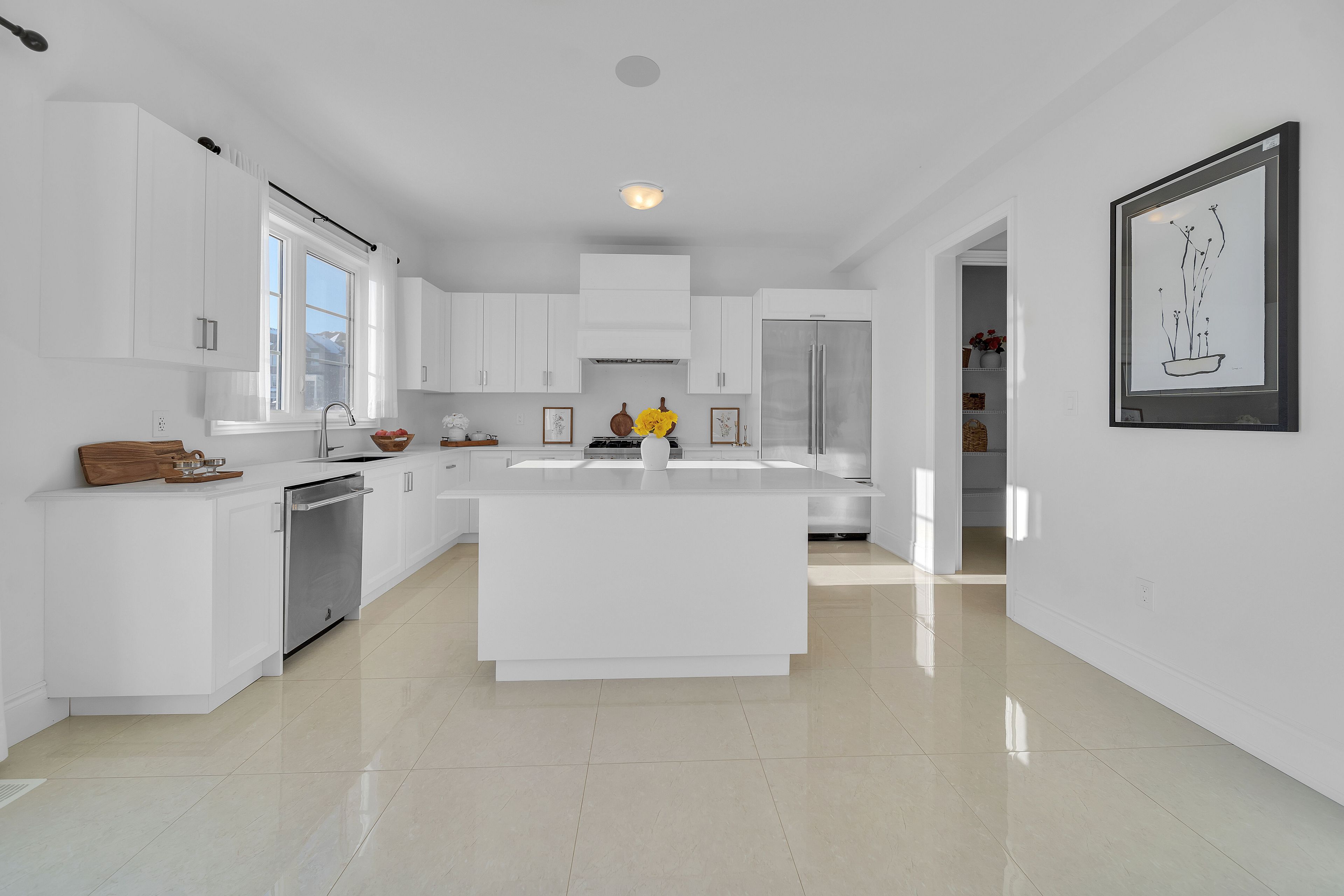 • Modern kitchen features built-in JennAir appliances and quartz countertops.