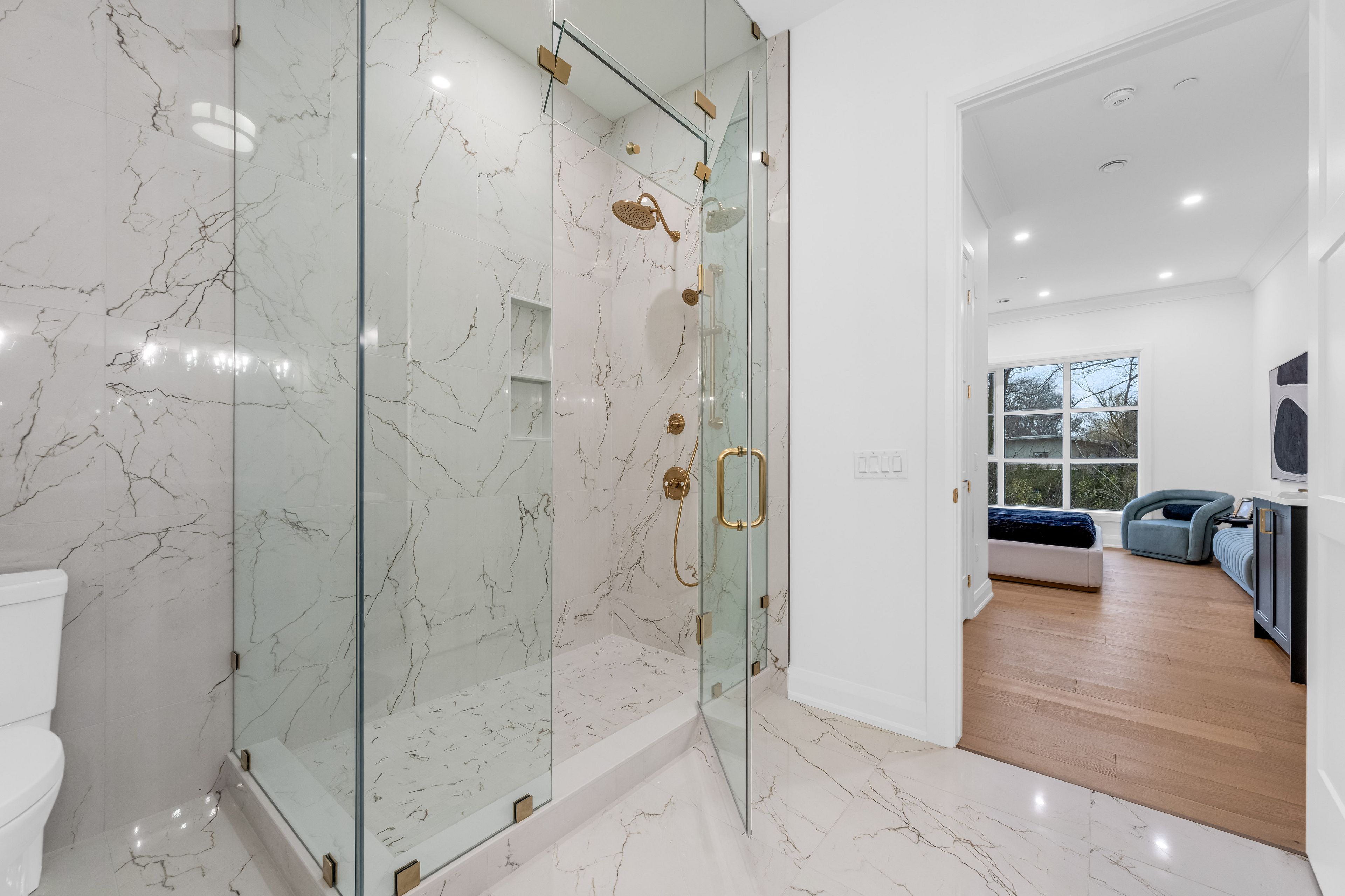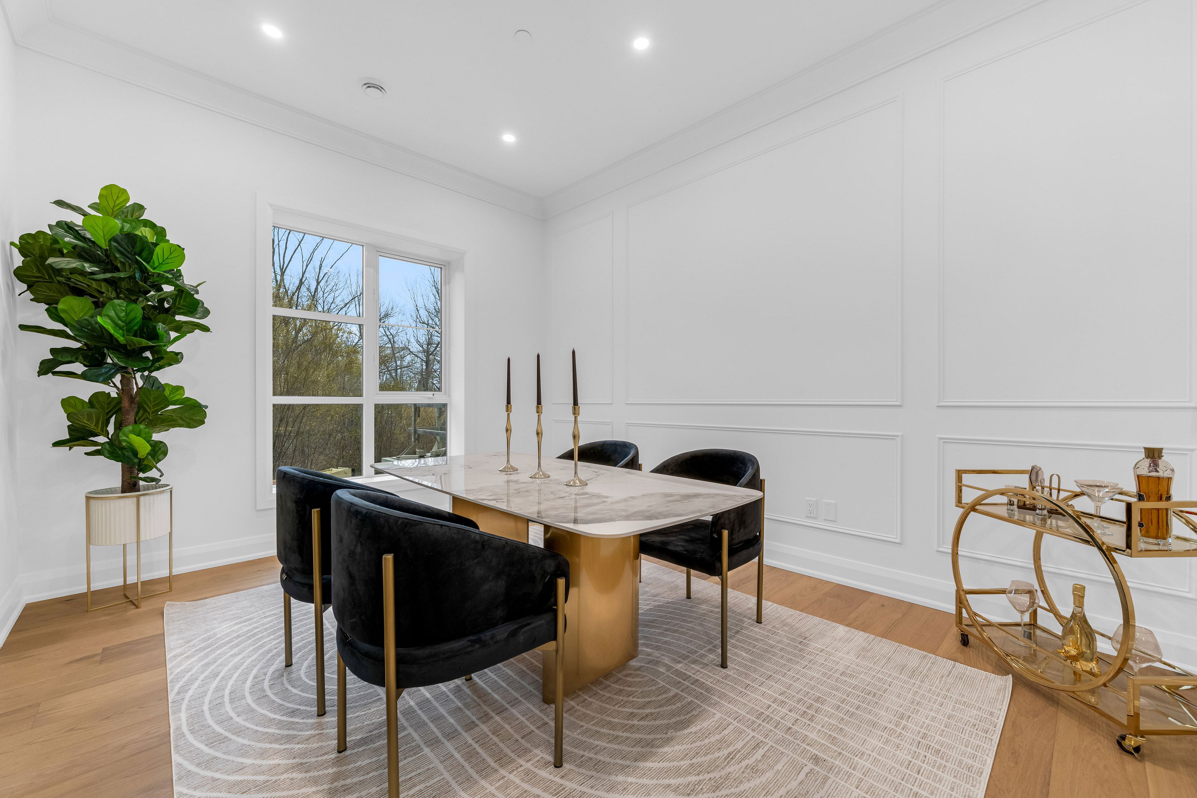 • Bright suite with expansive windows offering views of lush greenery.