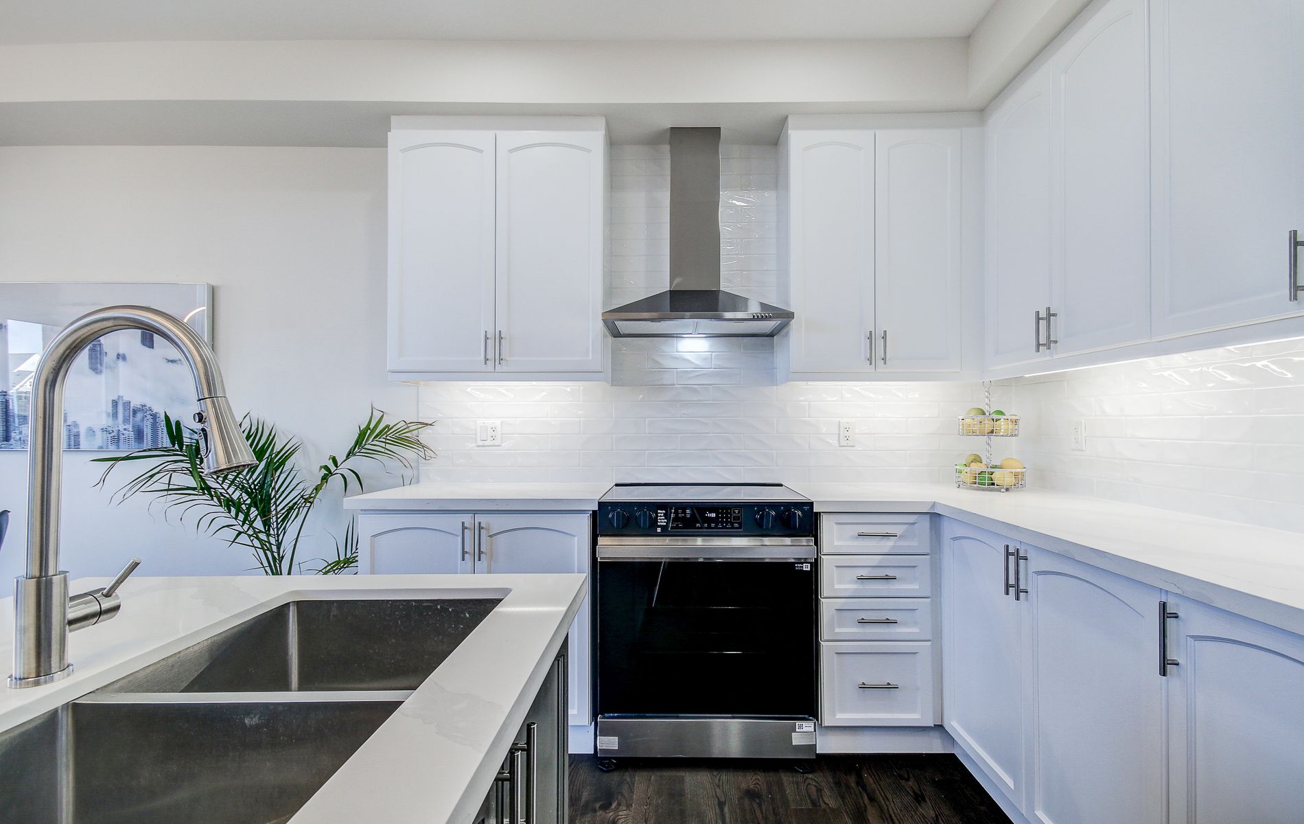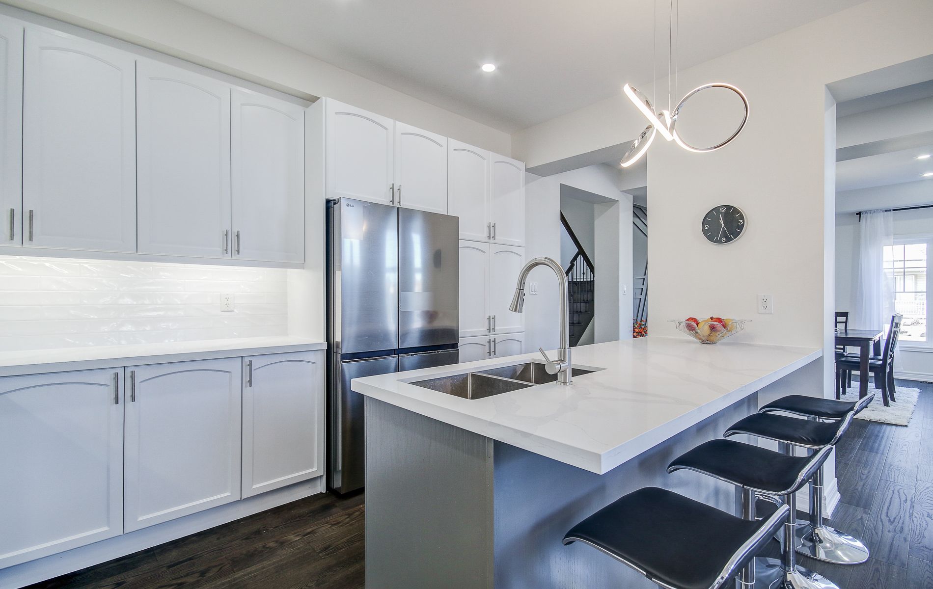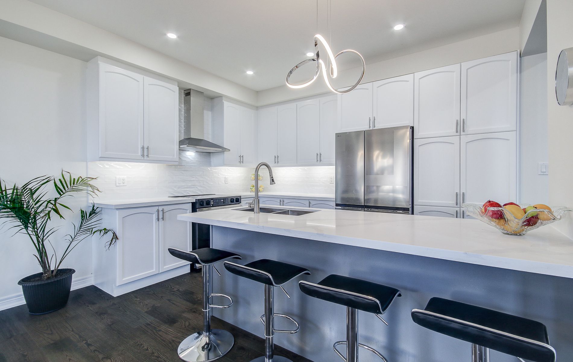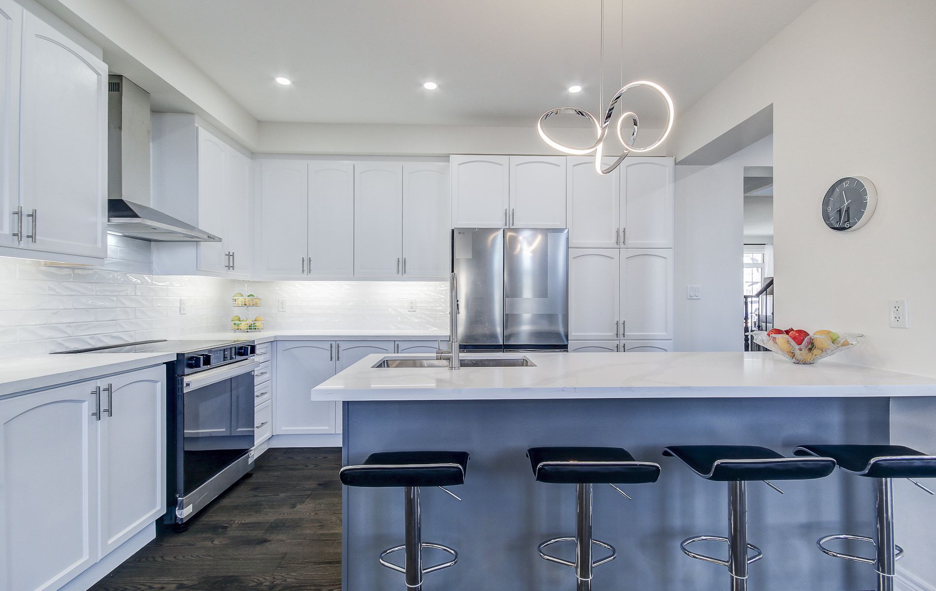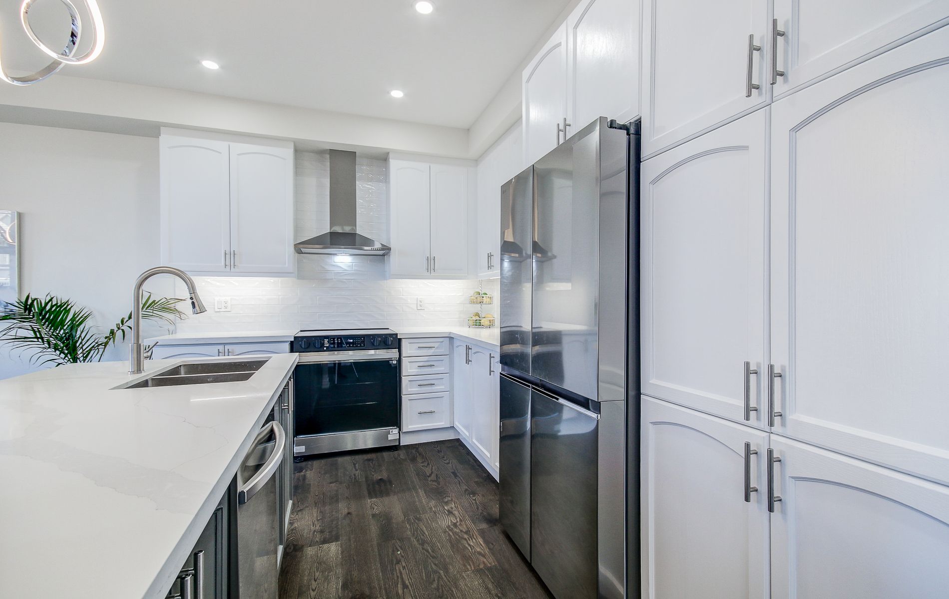 • Large kitchen featuring quartz countertops and stainless steel appliances.