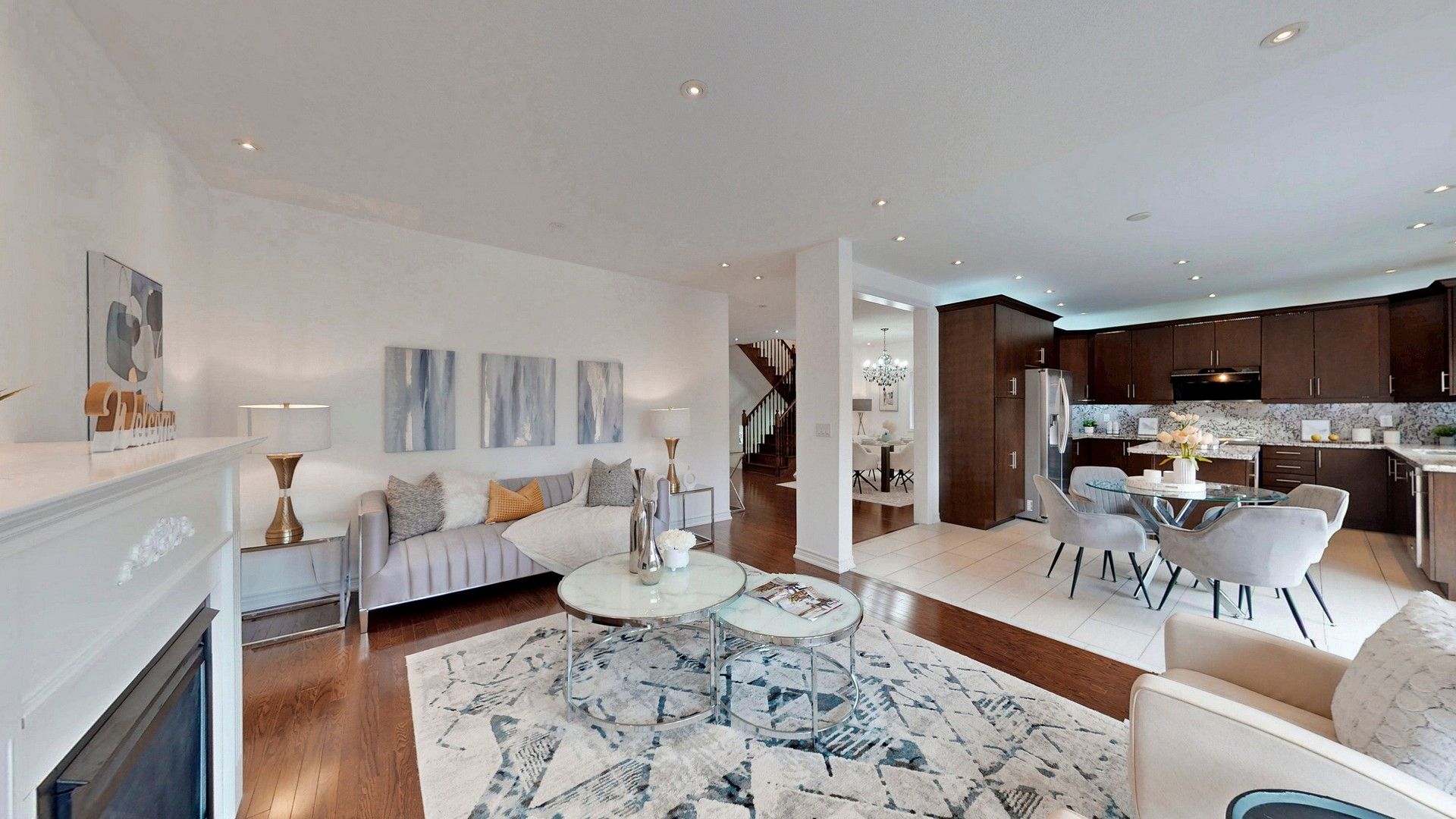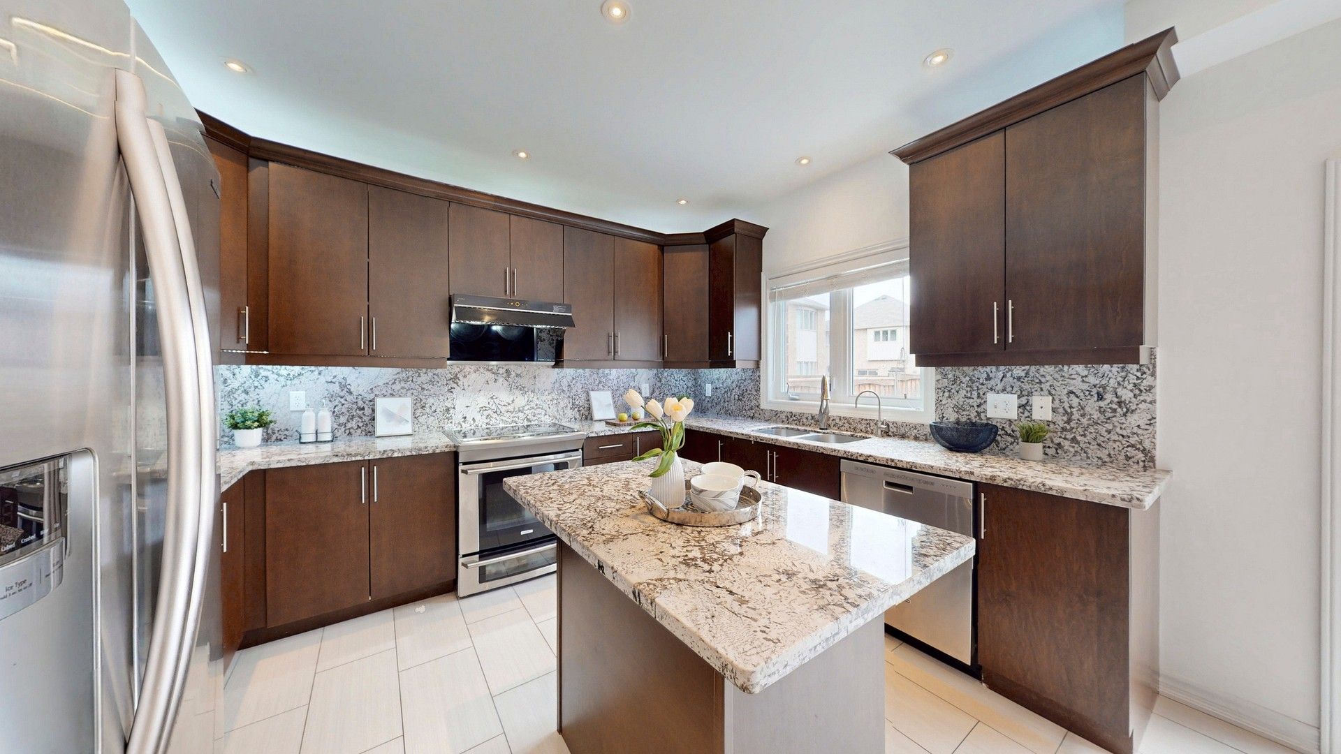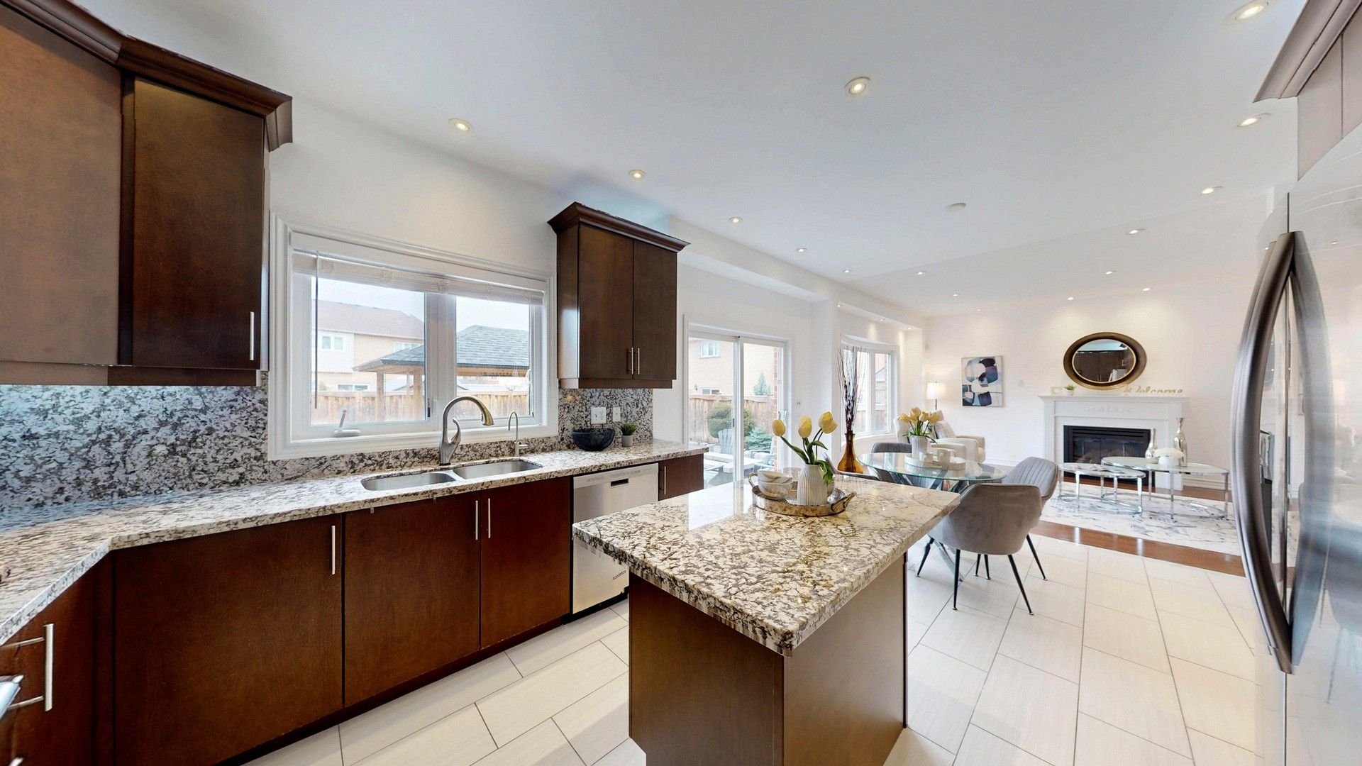 • Modern kitchen with granite countertops and a cozy family room.