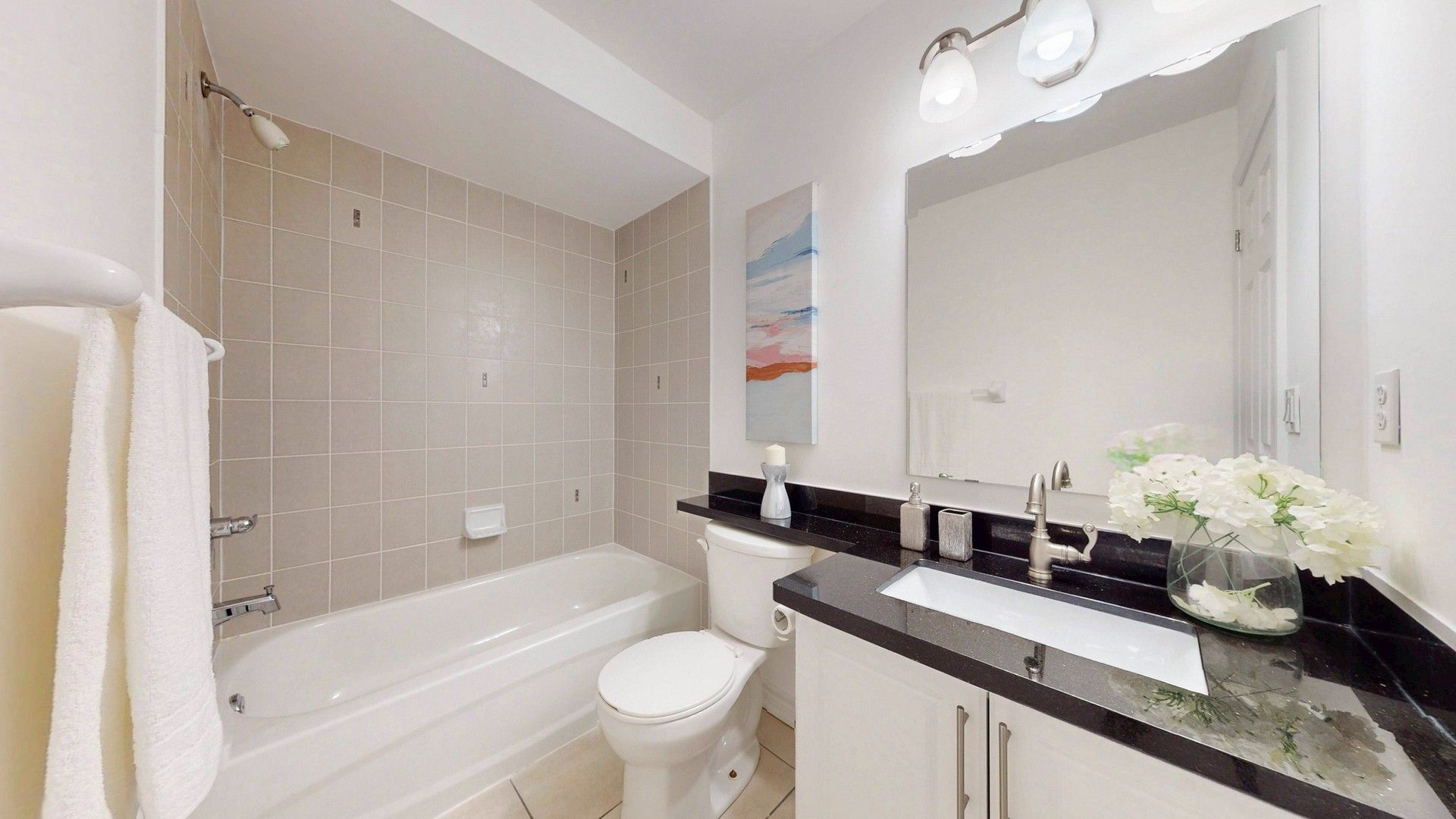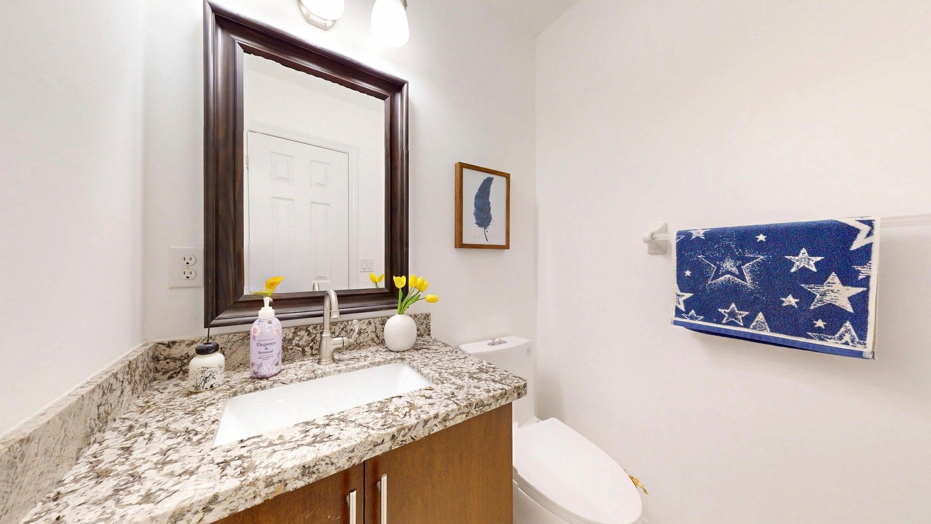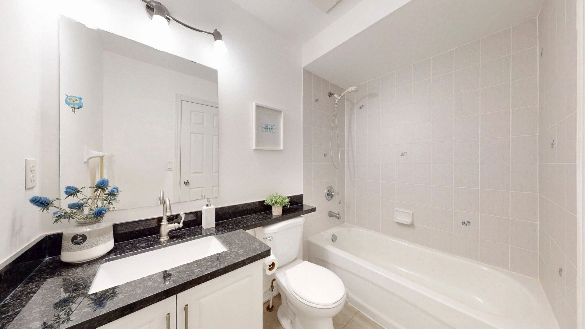 • Modern kitchen with granite countertops and a cozy family room.