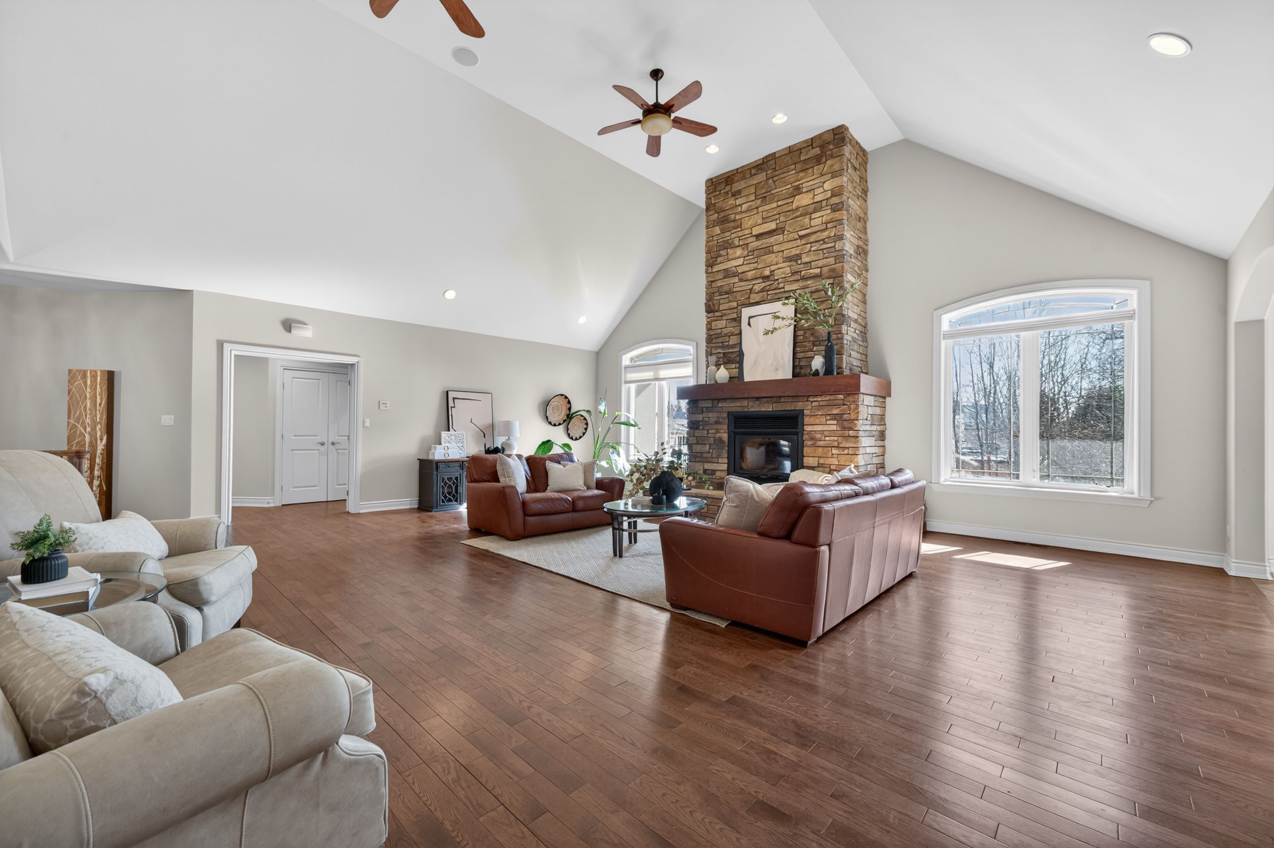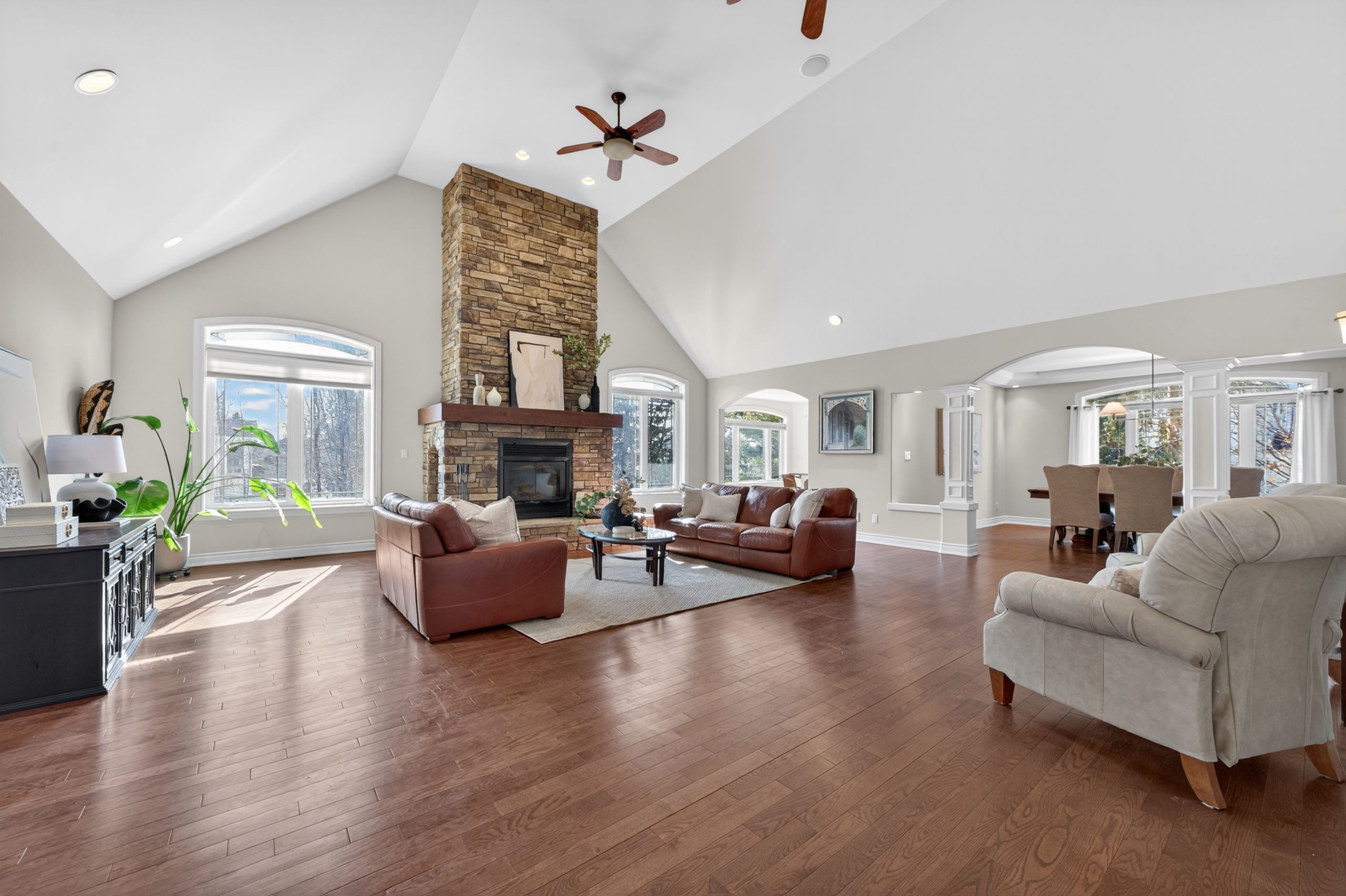 • Bright great room with 16-ft ceilings and a brick fireplace.