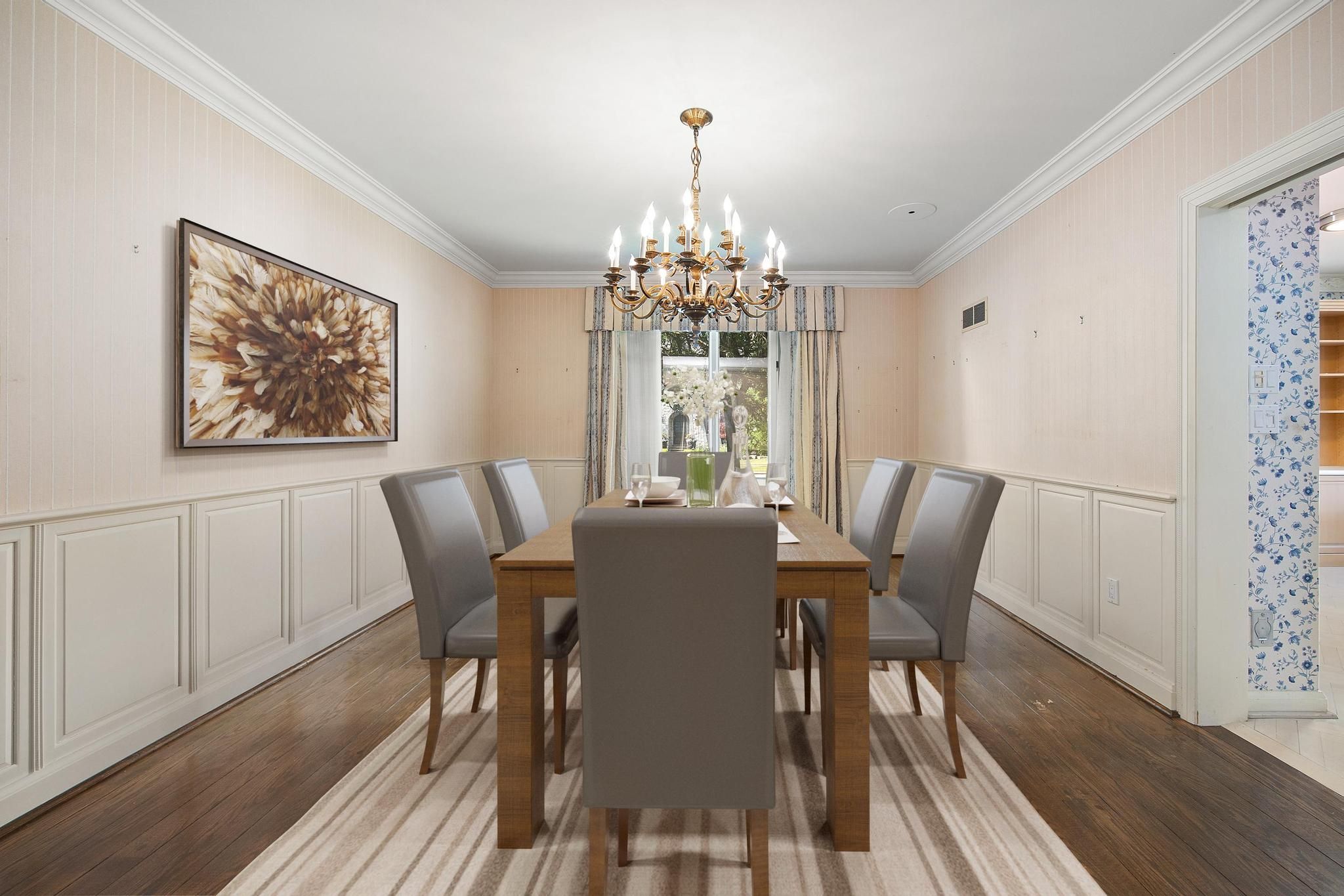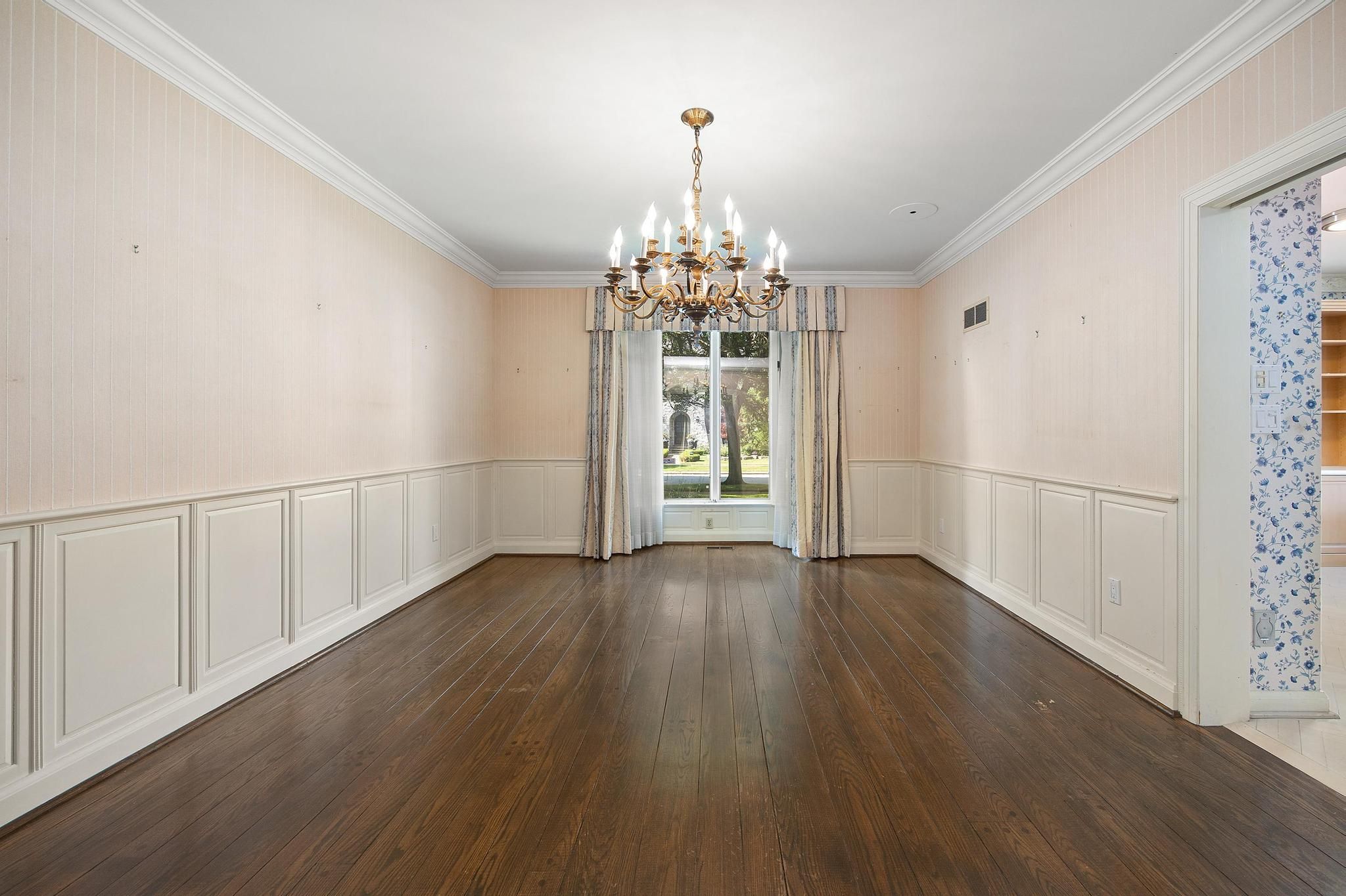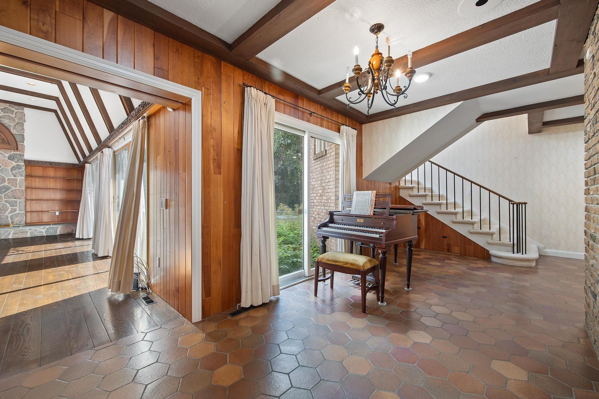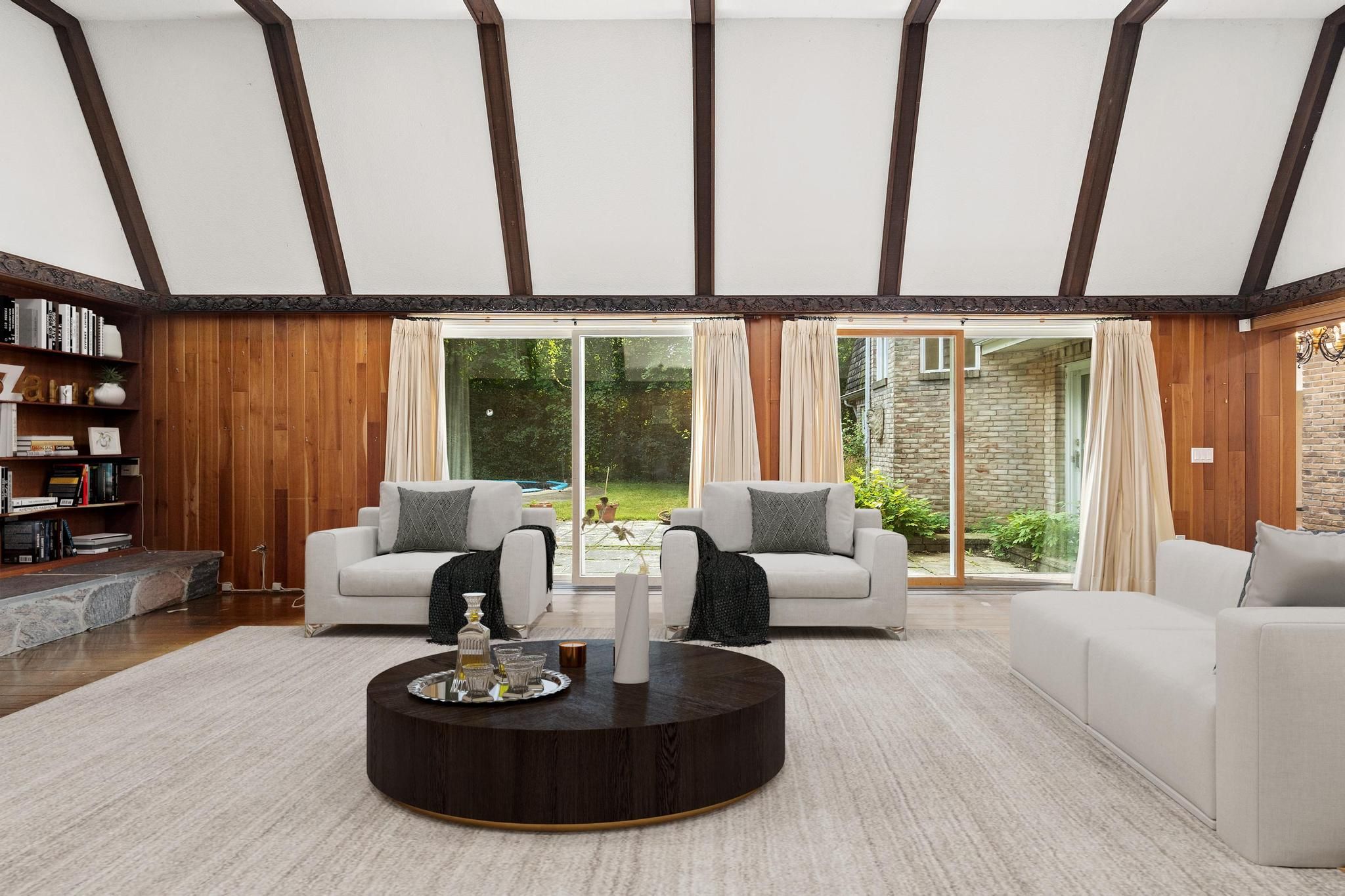 • Central family room with unique wood moldings from a historic mansion.