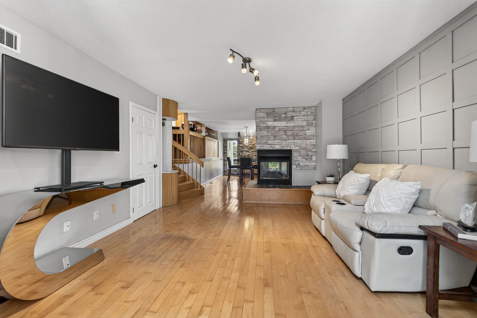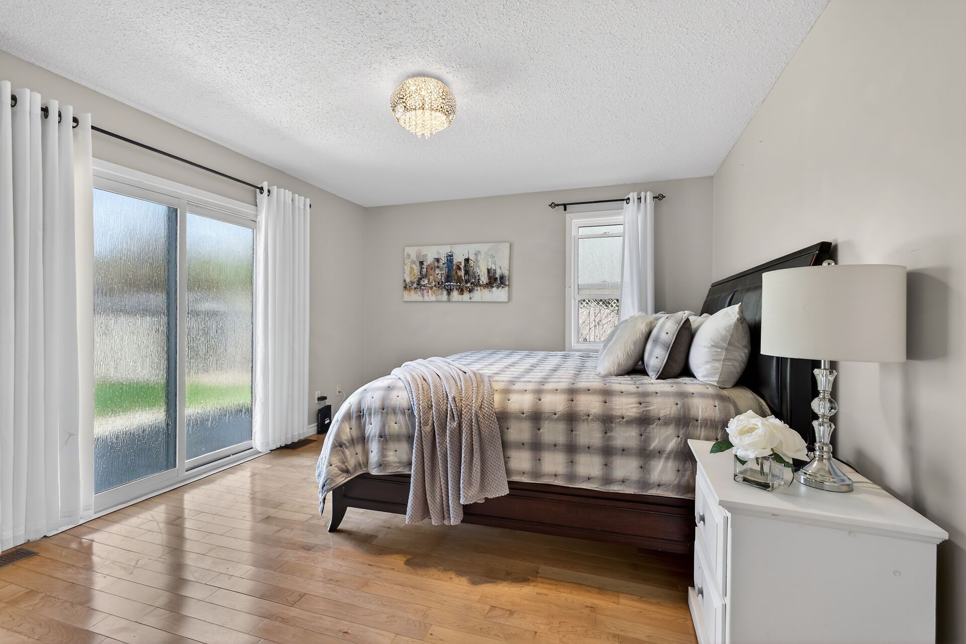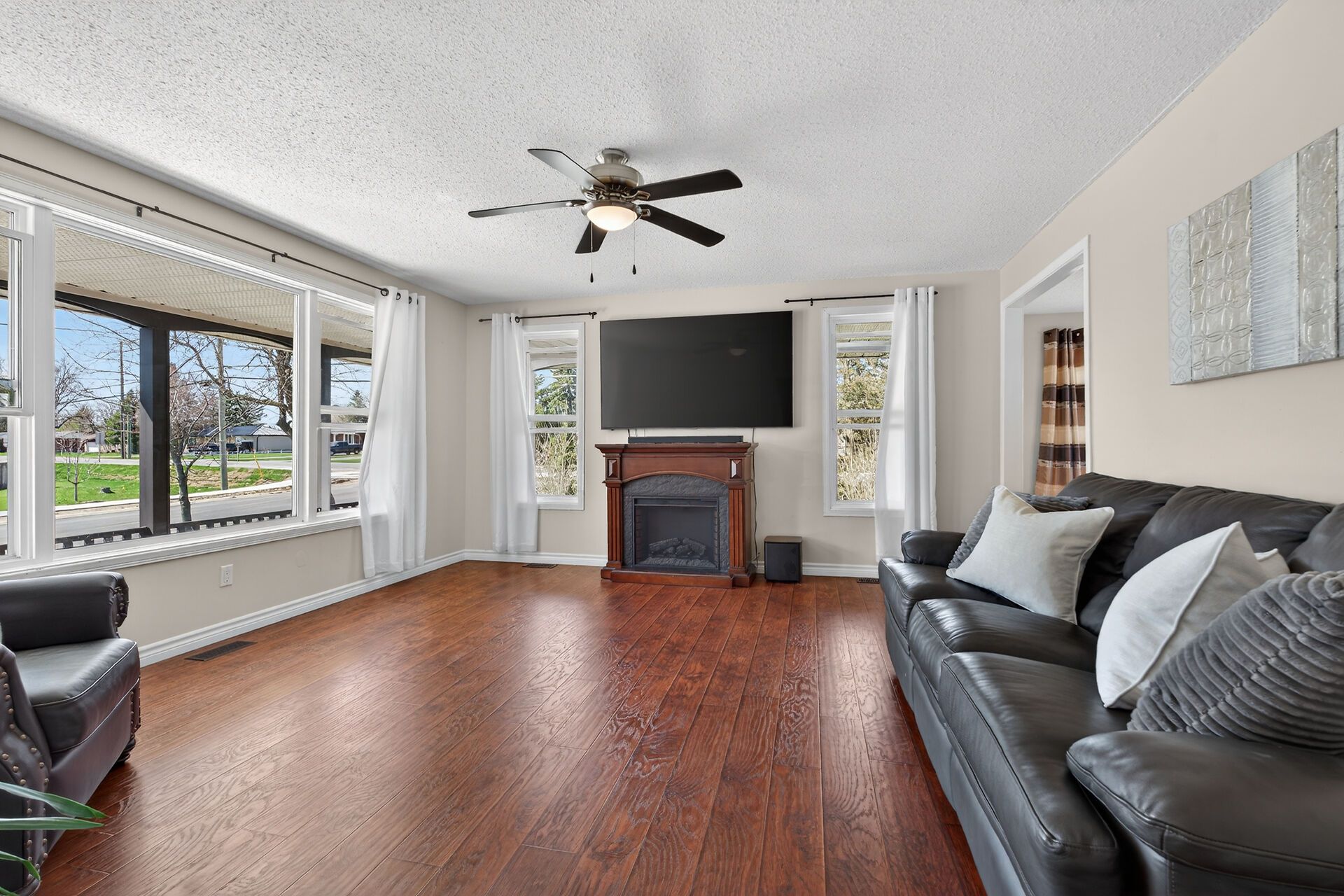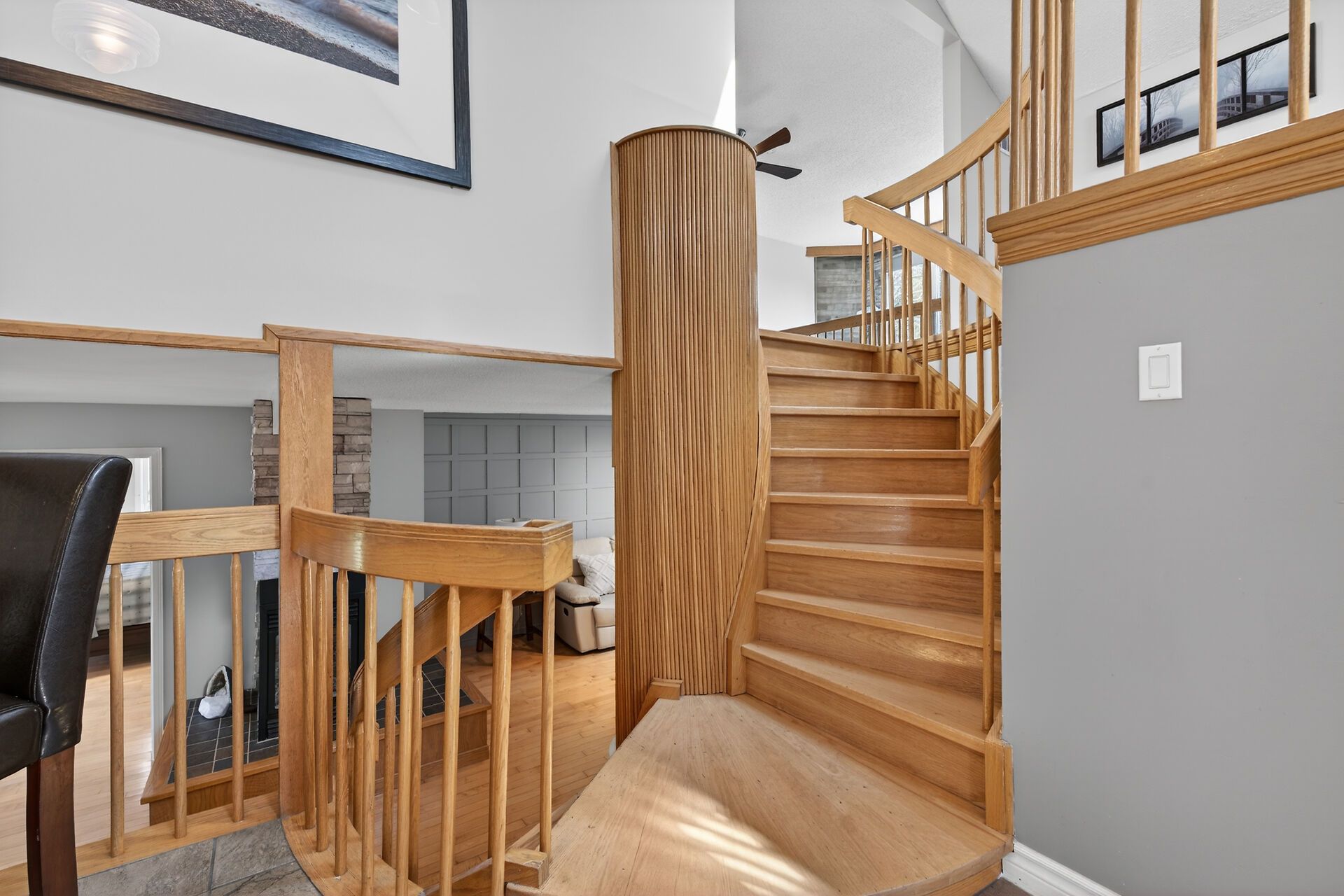 Welcome to this truly one-of-a-kind custom designed home in the heart of odessa, offering exceptional space, character, and versatility with convenient access to highway 401. From the moment you arrive, the inviting wrap-around front porch sets the tone for what awaits inside. Step into a bright and thoughtfully designed interior featuring vaulted ceilings, skylights that flood the home with natural light, and rich hardwood flooring throughout. Unique architectural details and decorative wall features add warmth and personality, while a stunning three-sided fireplace creates a cozy focal point connecting the principal living spaces. The main floor is highlighted by a spacious primary bedroom retreat, complete with a luxurious 6-piece ensuite bath and your very own sauna-delivering a true spa-like experience right at home. Upstairs, you'll find three generously sized bedrooms along with a versatile rec room/games room, a full bathroom, and access to a private exterior balcony-perfect for relaxing. The fully finished lower level expands the home's possibilities, offering a fifth bedroom, a large gym or recreation space, and a second kitchen, making it an excellent option for an in-law suite or multi-generational living. Completing the package is a double car attached garage and a layout designed for both comfort and functionality. This distinctive home is ideal for those seeking something beyond the ordinary, blending style, space, and flexibility in a prime odessa location.