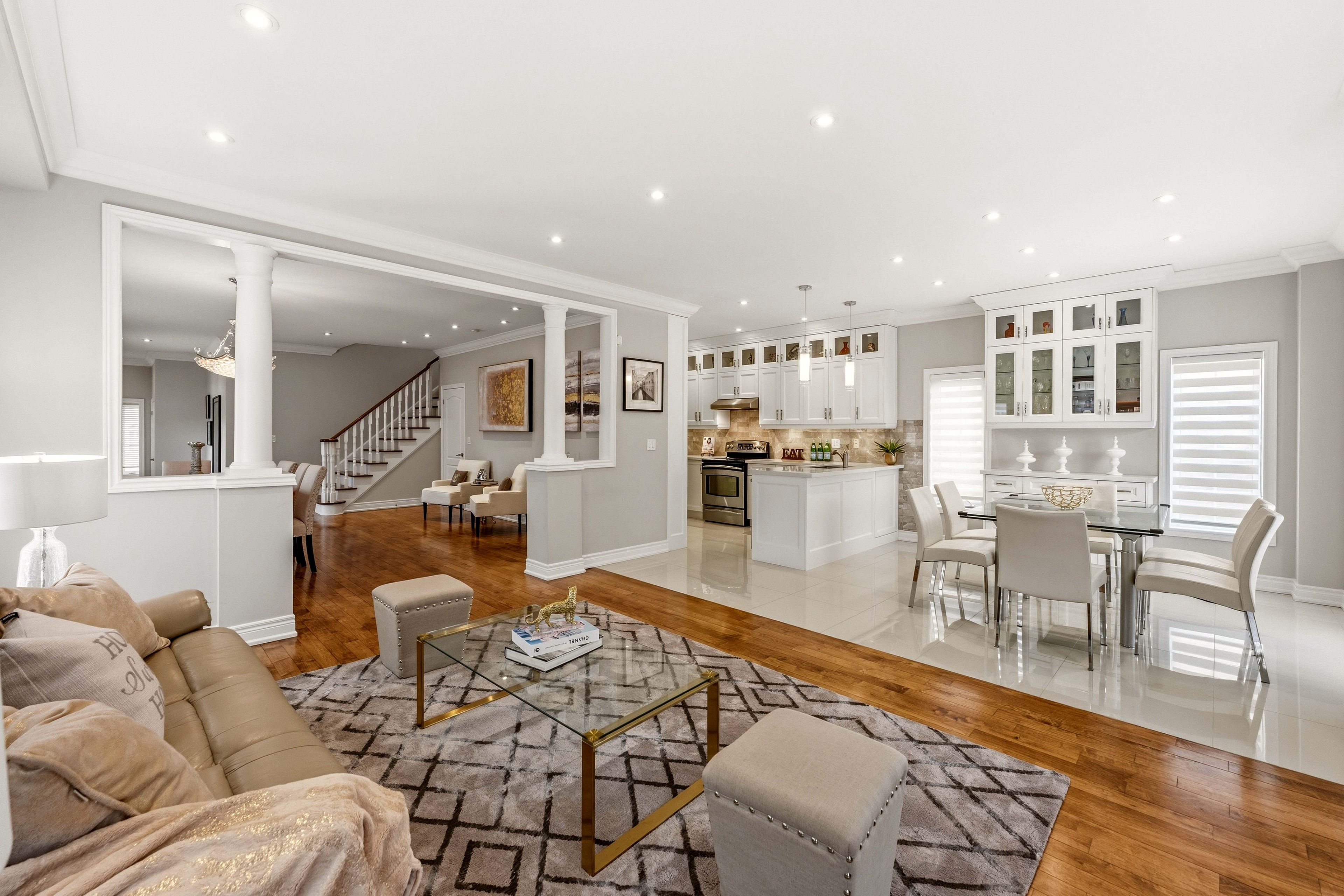• Open concept layout with hardwood floors and modern kitchen featuring quartz countertops.