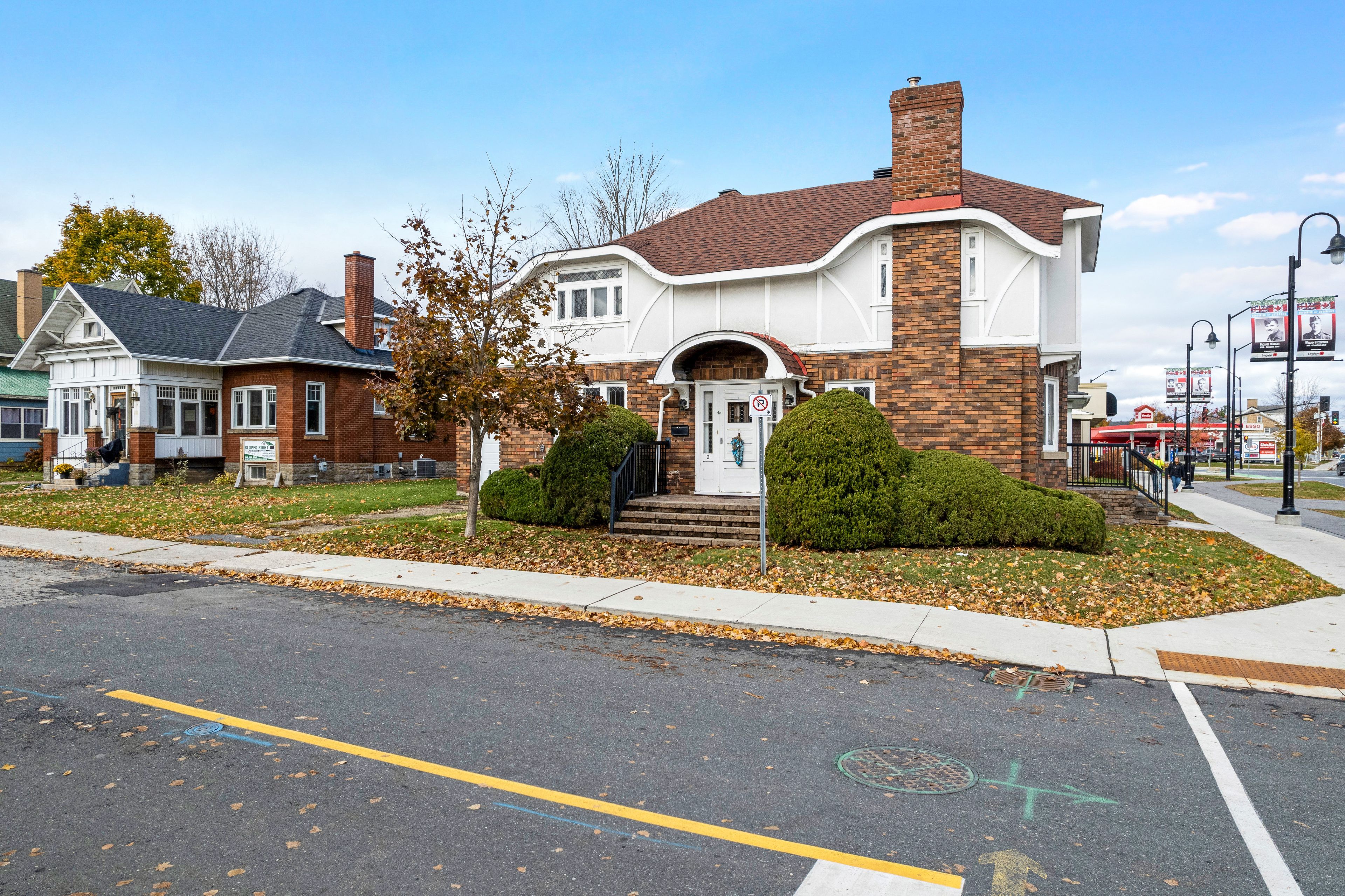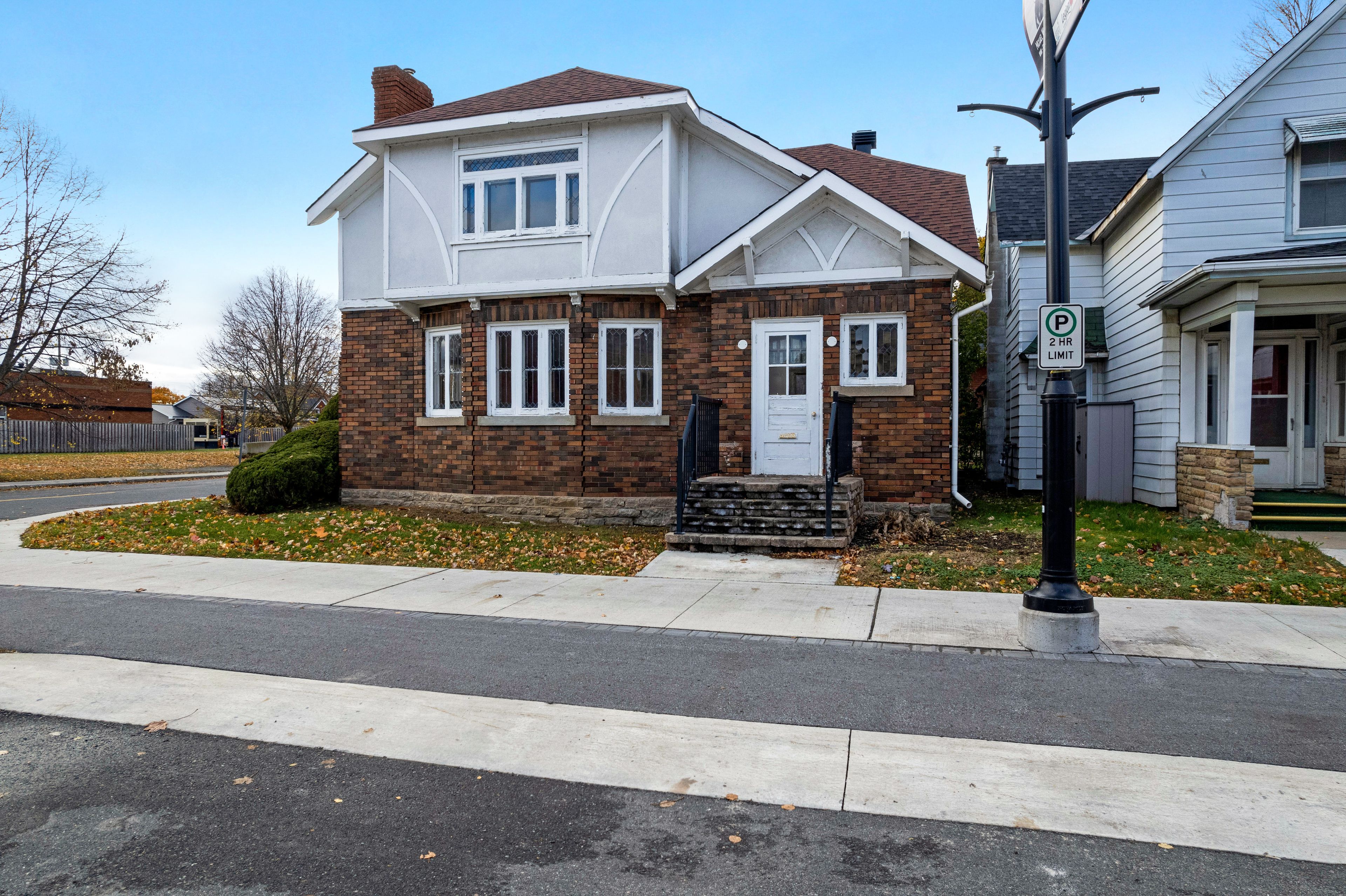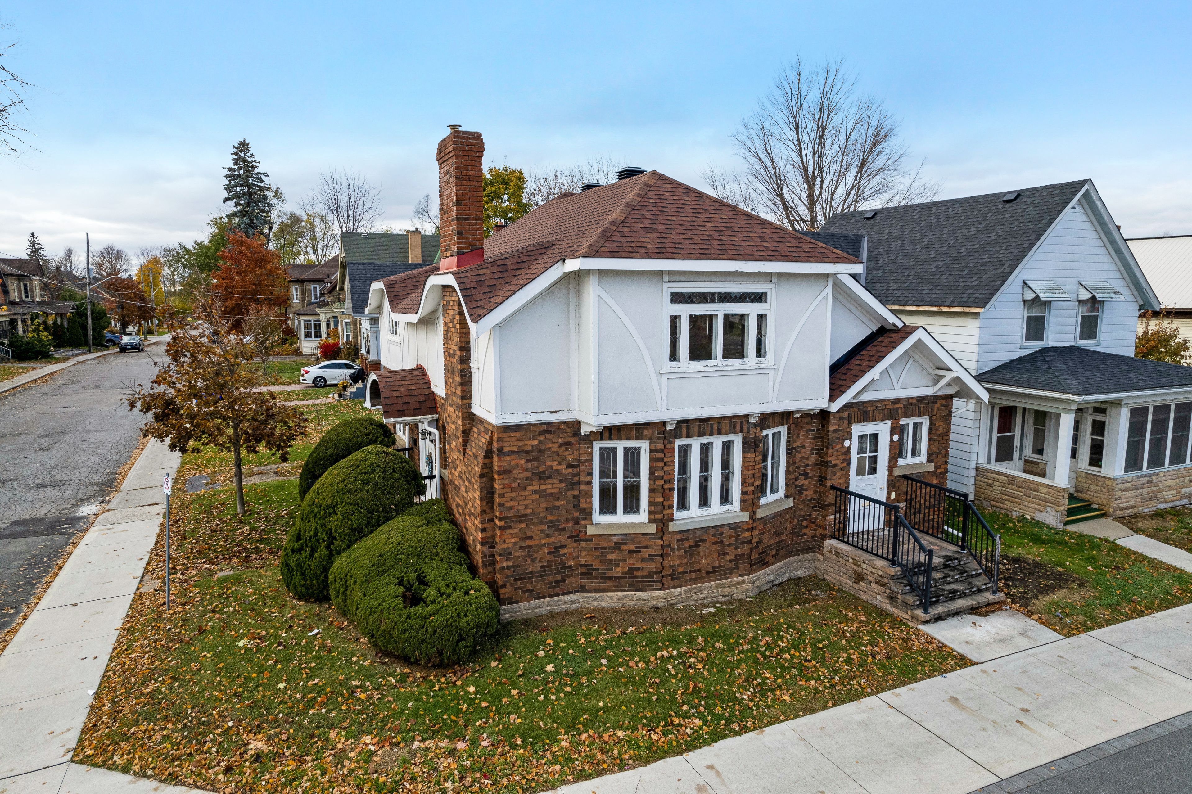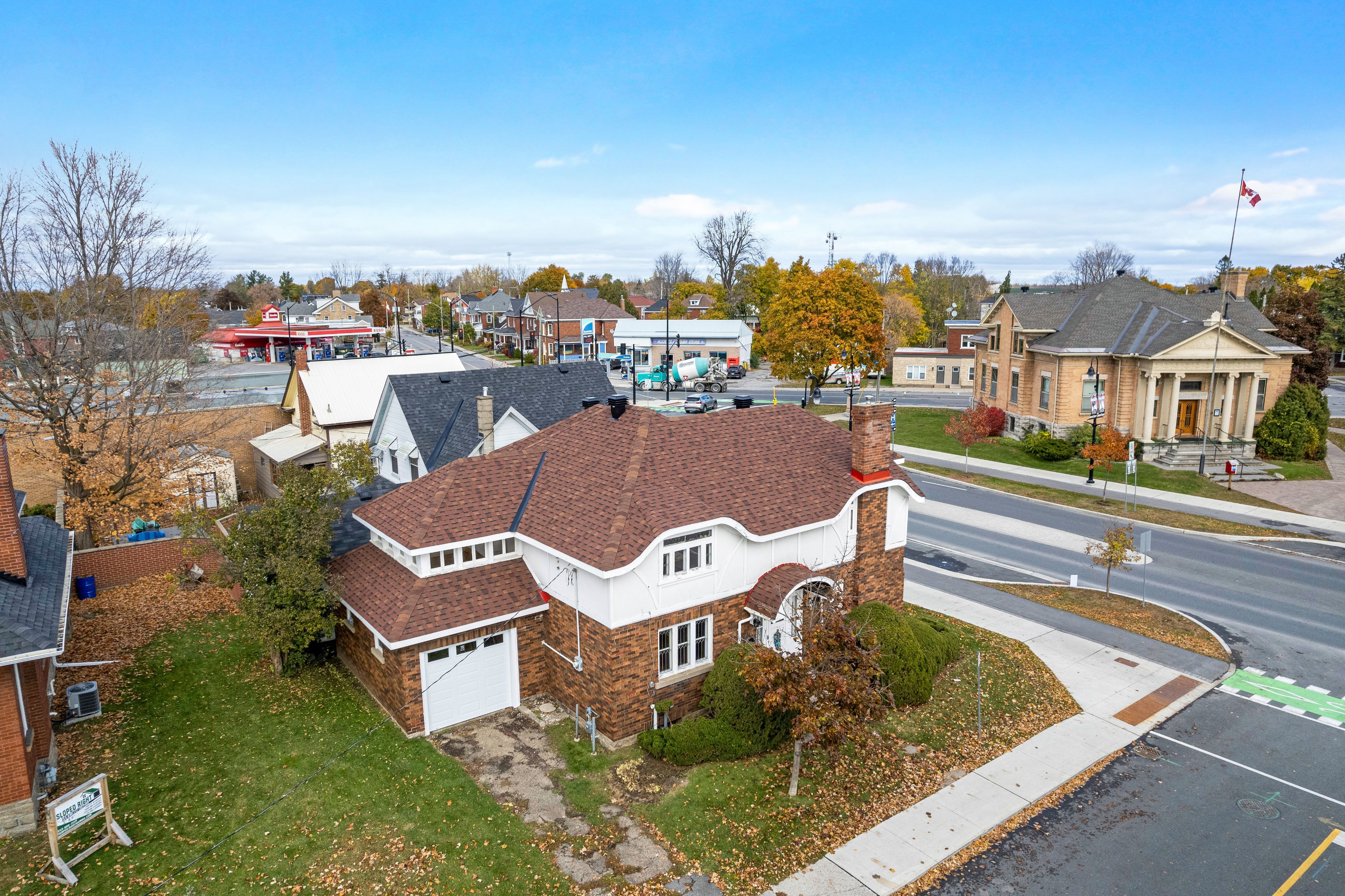 In the heart of smiths falls, just steps from cafés, parks, and the library across the street, this 1940 brick home blends the warmth of history with the ease of in town living. Its character is evident the moment you step inside, where rich millwork and the glow of hardwood refinished in 2025 set a welcoming tone. The living room centres on a wood fireplace waiting to be certified and brought back into daily use. The formal dining room and practical galley kitchen create a comfortable flow, with direct access to the attached garage. A three piece bath and a front office with their own exterior entrance provide a rare setup for professionals who need a private workspace. Upstairs, sunlight gathers in the second level sunroom, an inviting retreat for work, reading, or warm summer nights. The large primary bedroom offers two closets and a dressing area. Down the hall, you'll find two additional spacious bedrooms and a generous three piece bath. The unfinished basement, reached from an interior stairway or through a hatch in the garage, houses the utilities and offers ample storage. Hedges frame the home's front entrance, lending a splash of greenery to its walkable downtown setting. Steady, consistent updates have supported the home's long life. The roof was replaced around 2023, the chimney shaft and brickwork were replaced in 2022. The newer natural gas boiler provides efficient radiant heat through the existing radiator system. Inside, major repainting was completed this year along with the install of a brand new garage door. This is a home for those who value heritage are looking to make the most of this great downtown location. Priced to sell quickly!