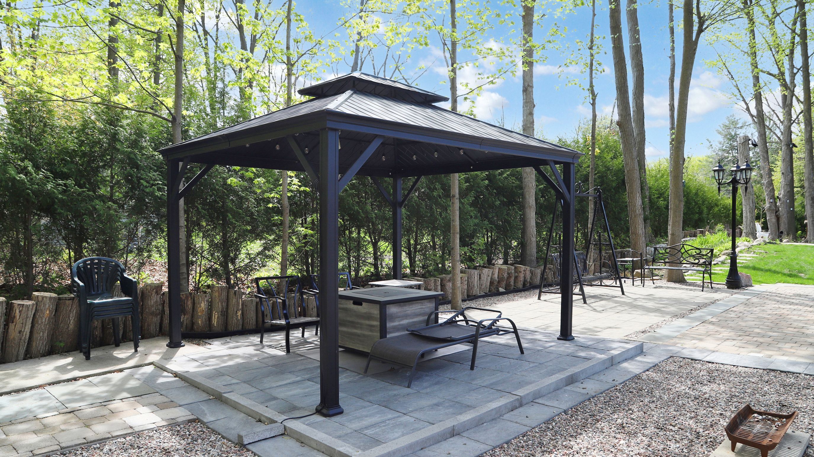 • Resort-style backyard with mature trees, gazebo, and private tennis court.