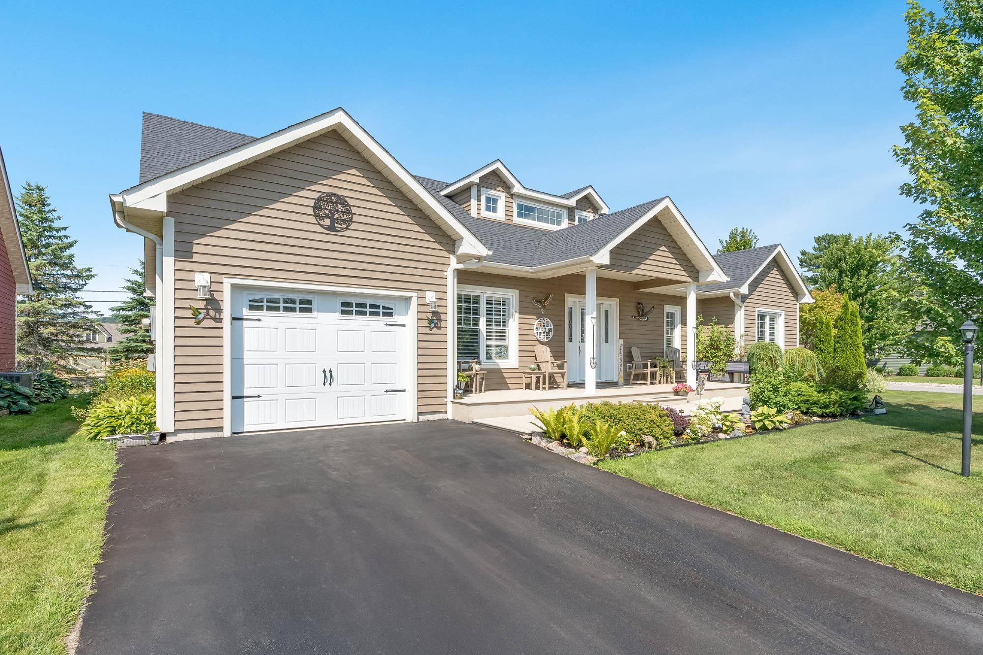 Top 5 reasons you will love this home: 1) exceptional ranch bungalow offering serene water views, a bright open-concept layout, and spacious front and back decks, perfect for enjoying the warmer months in the sought-after village at bay moorings 55+ community 2) beautifully landscaped corner lot with mature gardens, a built-in sprinkler system, and complemented by a double driveway for added convenience 3) generous primary suite with a walk-in closet and exclusive ensuite access, featuring a dual-sink vanity for both style and functionality 4) additional highlights include a versatile den, an expansive crawl space, parking for up to three vehicles, and worry-free living with access to a brand-new clubhouse 5) ideally located near shopping, discovery harbour, georgian bay, and scenic walking trails, with local restaurants just minutes away. 1,683 above grade sq. Ft.