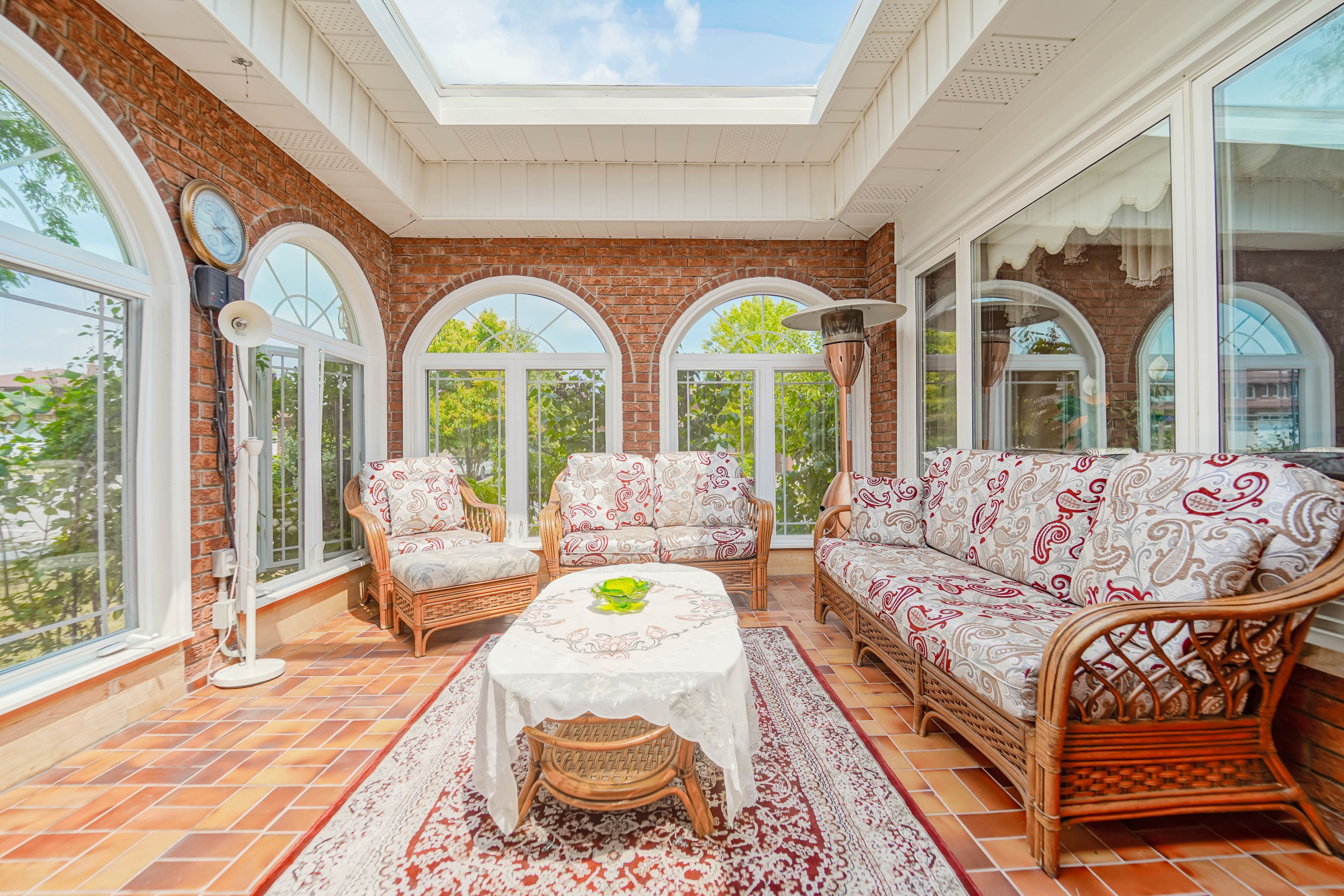 • Large walk-out porch overlooking a well-maintained garden, great for gatherings.