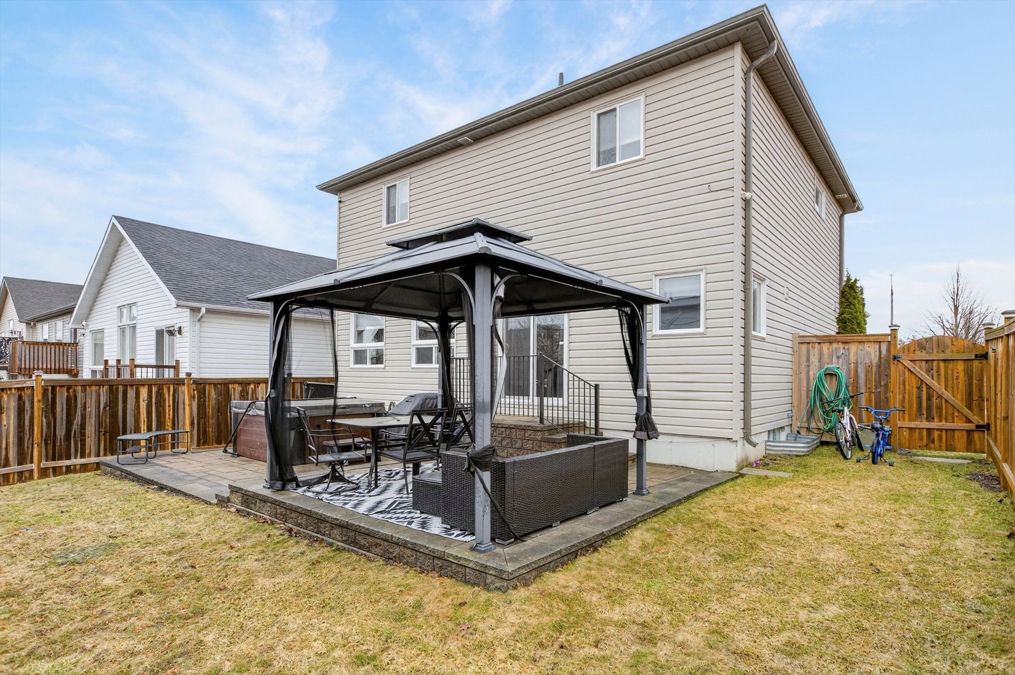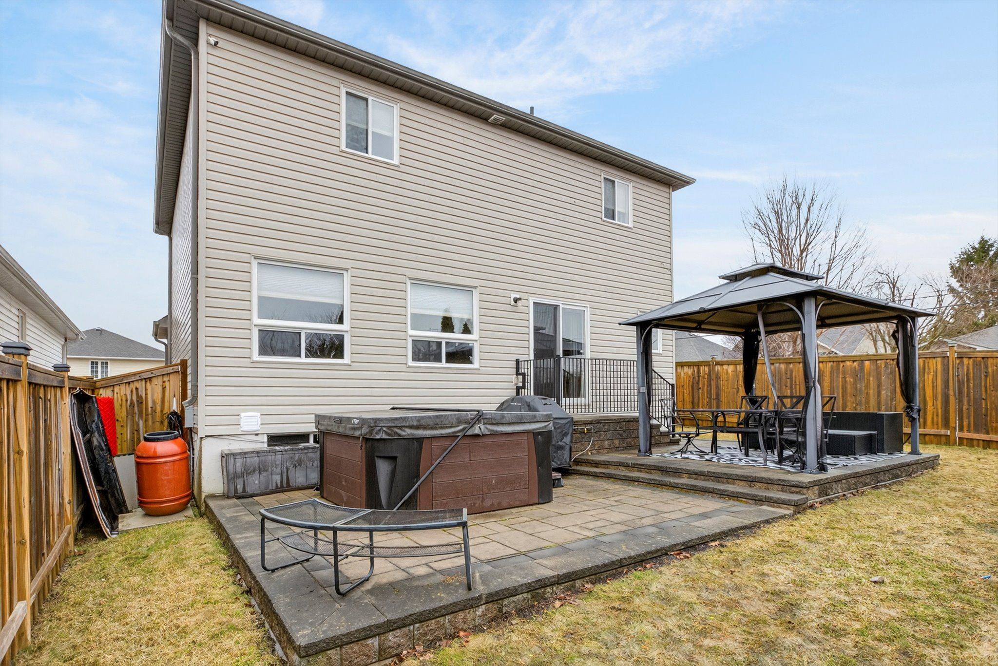 • Spacious deck with gazebo and hot tub for outdoor relaxation.