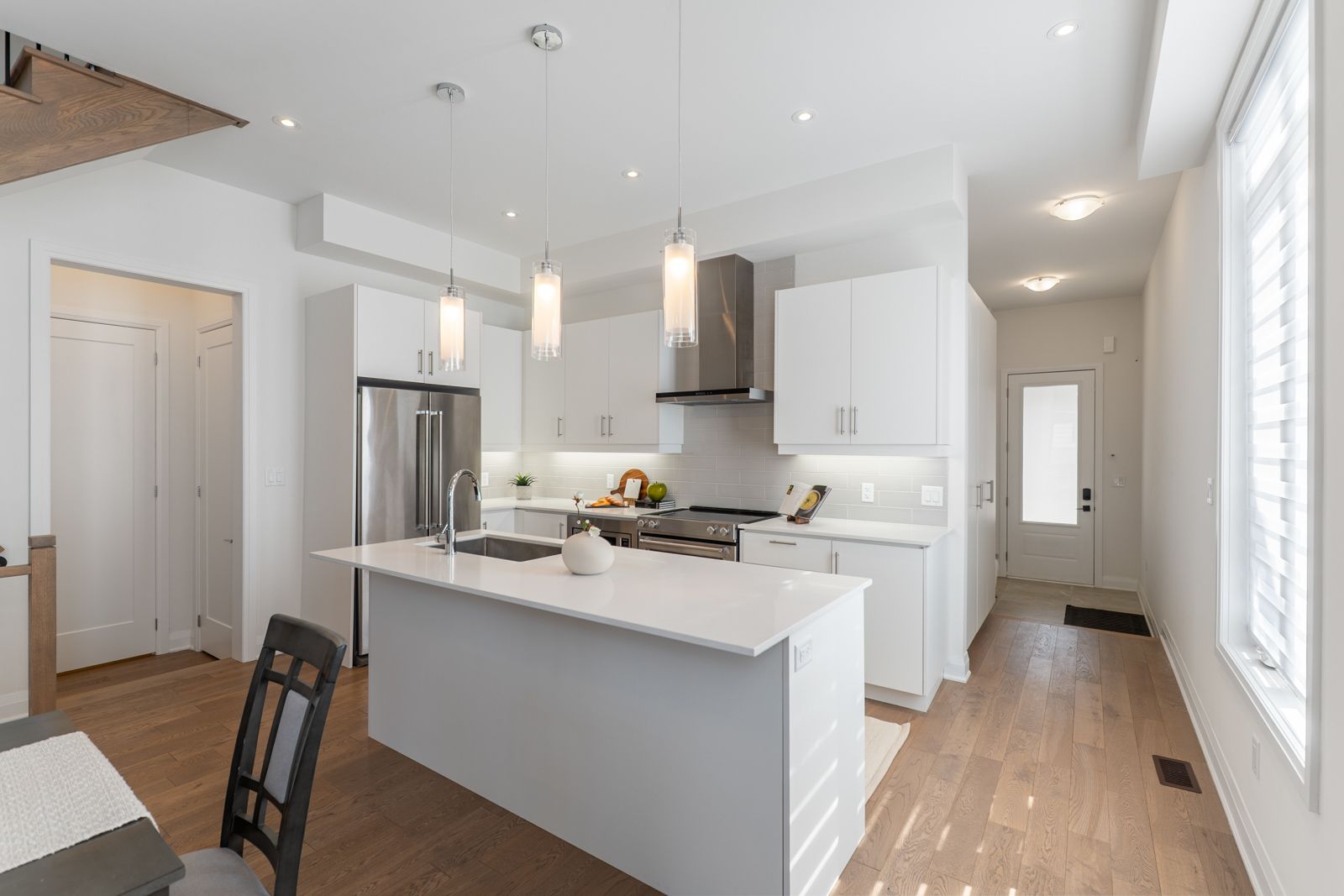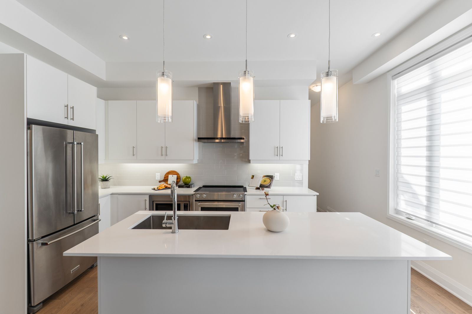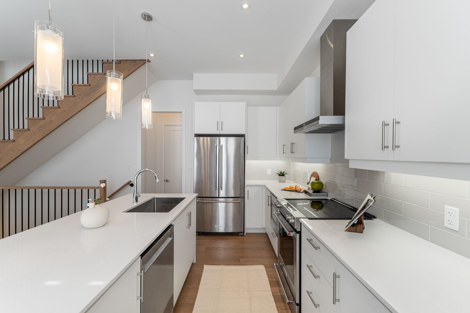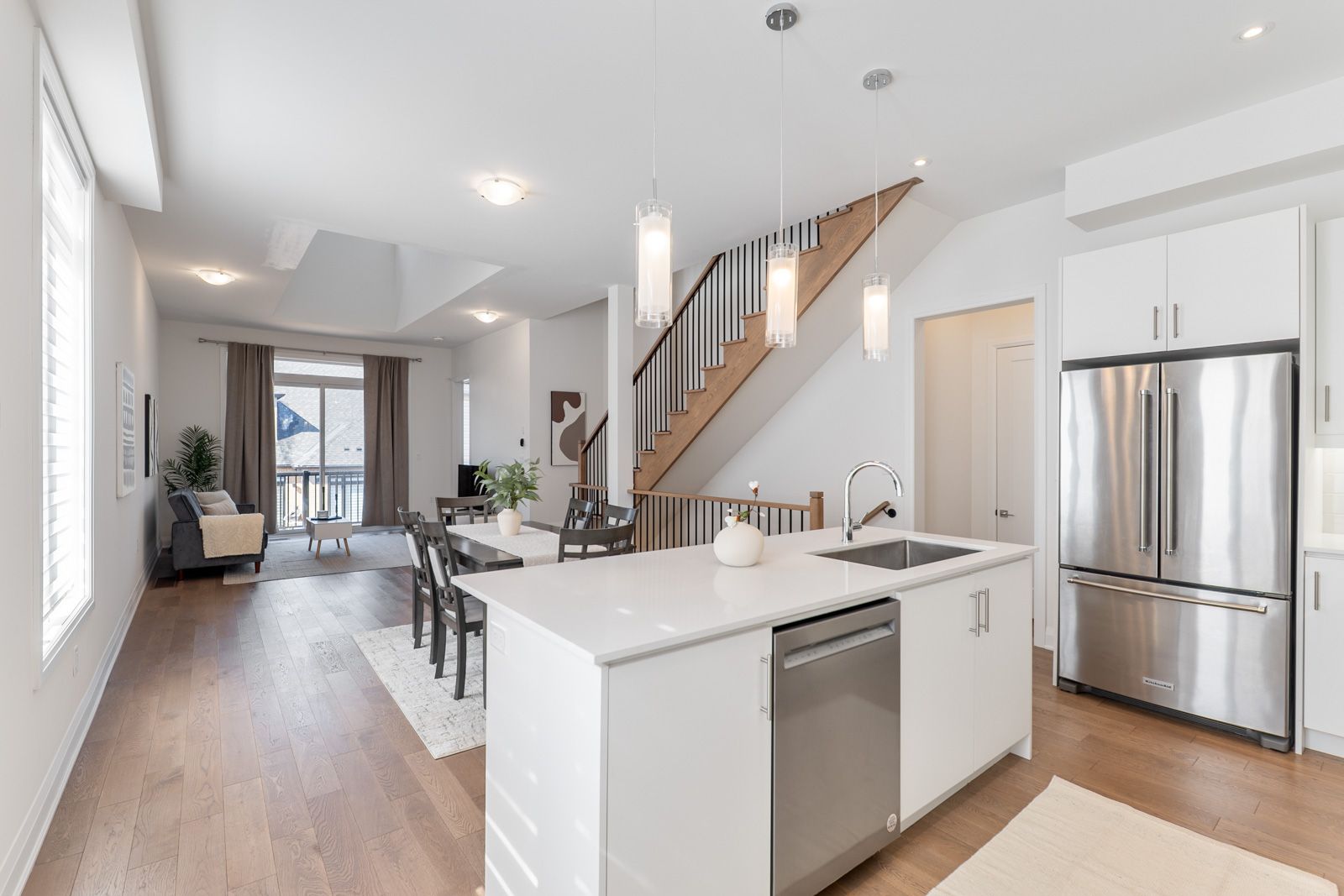 • Open-concept kitchen with stainless steel appliances and quartz countertops.
