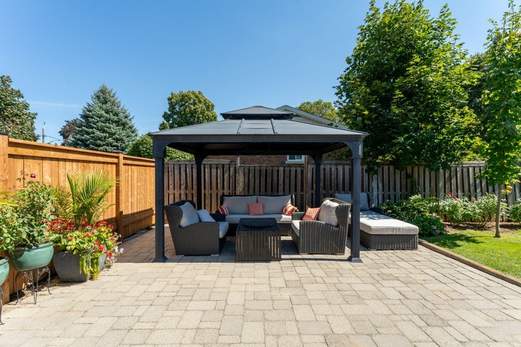 • Private fenced backyard with new deck and gazebo for gatherings.