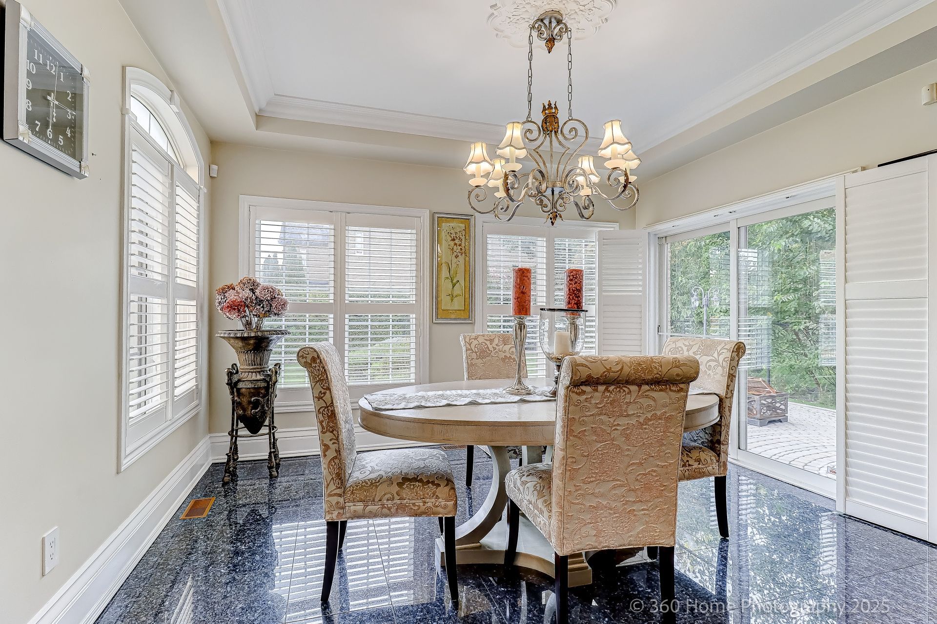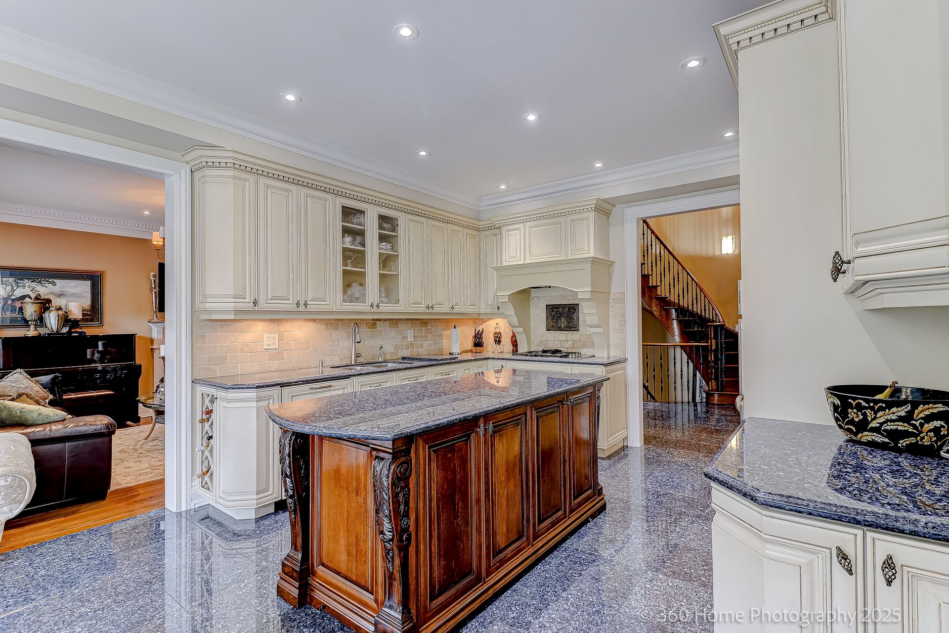• Gourmet kitchen features granite countertops and built-in appliances.