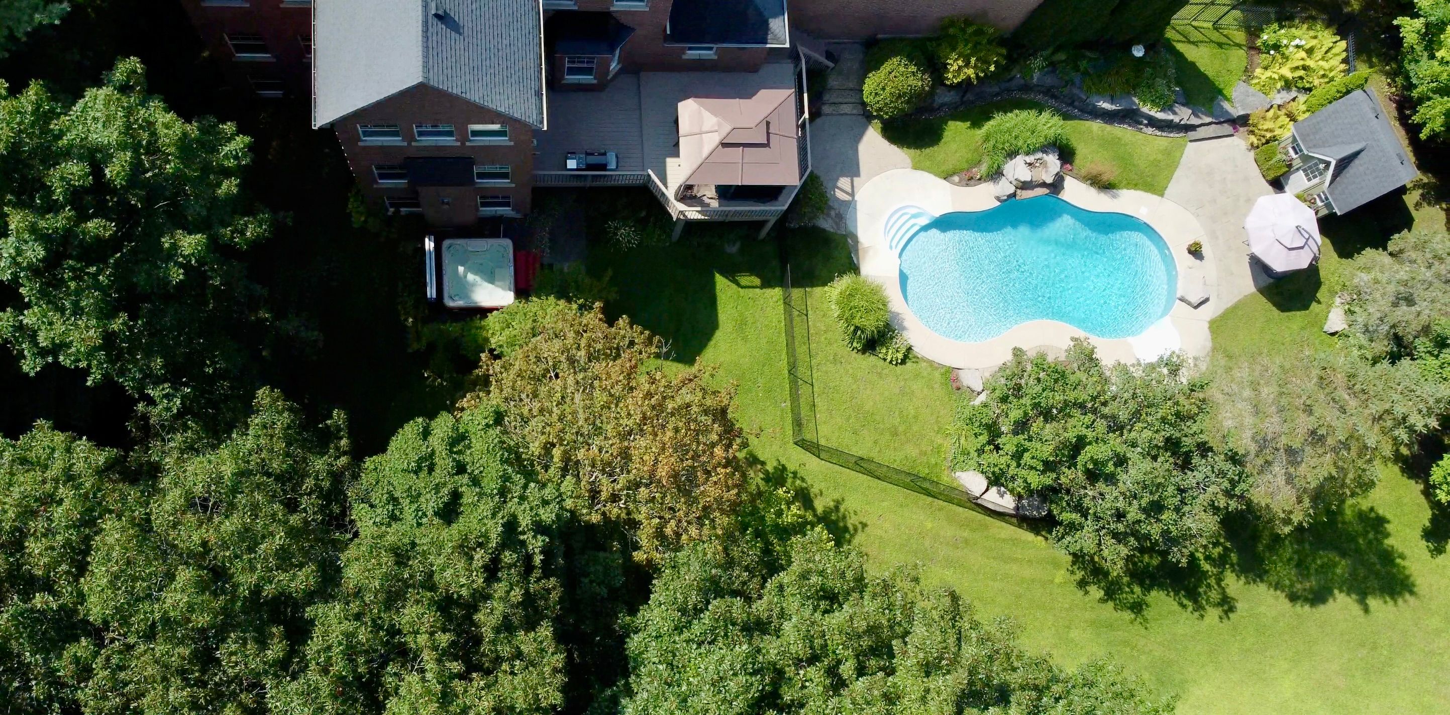 • Dream backyard with saltwater pool, hot tub, and waterfall features.