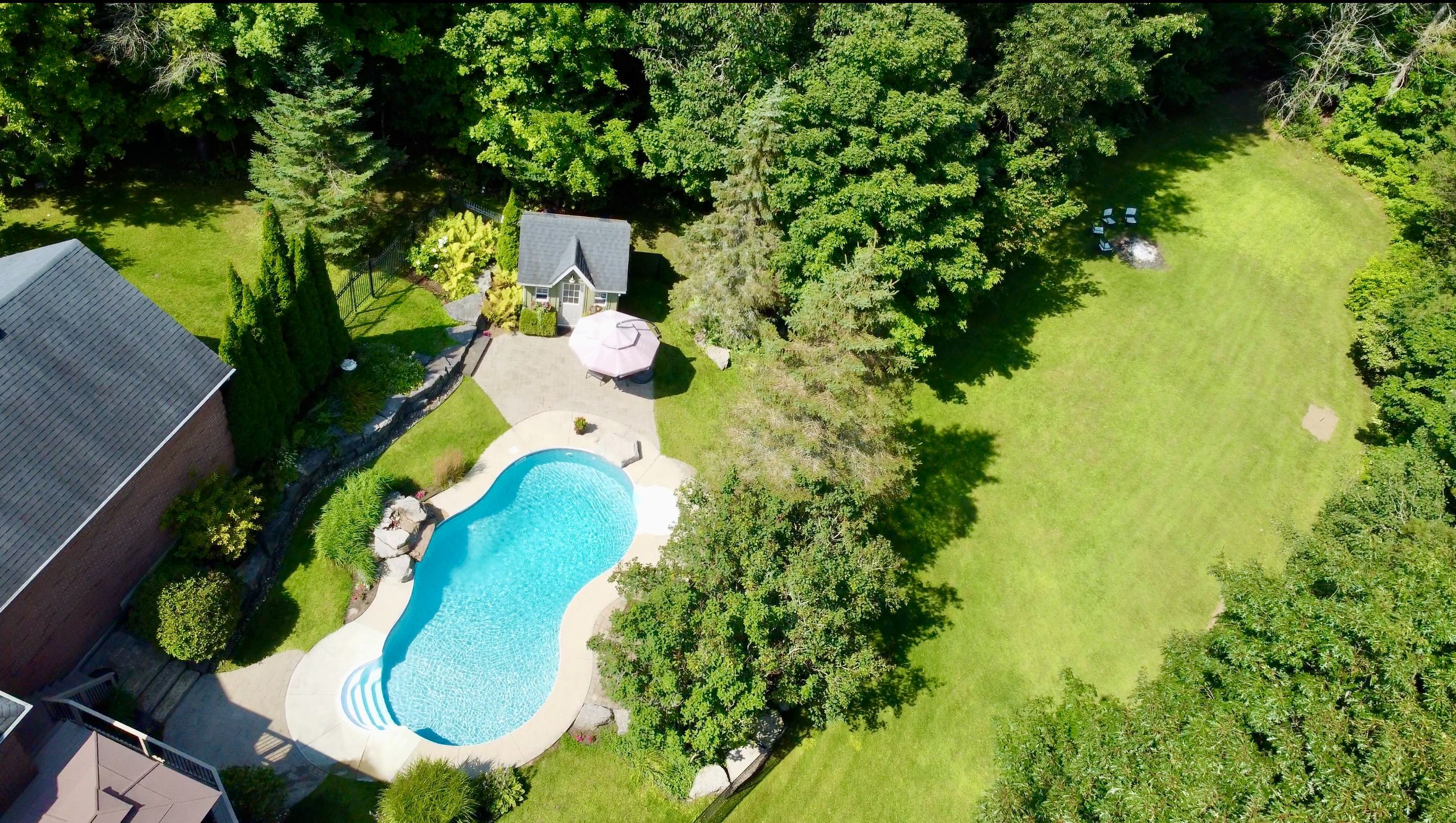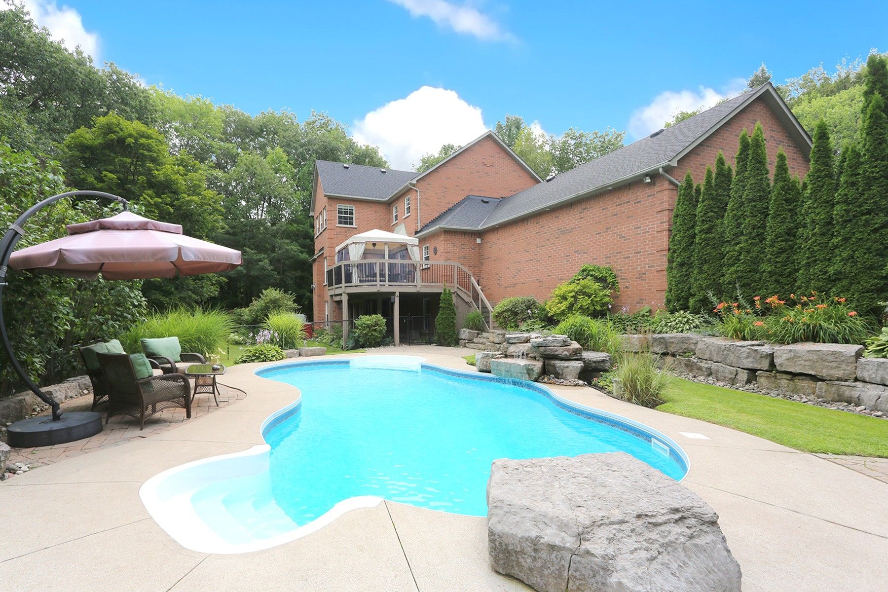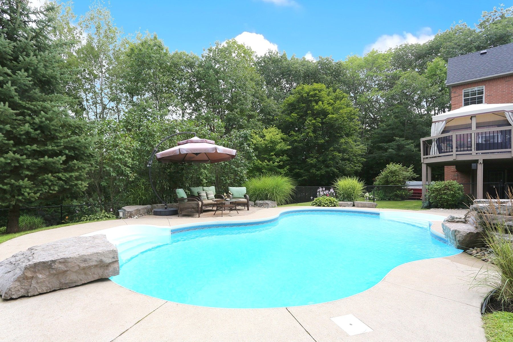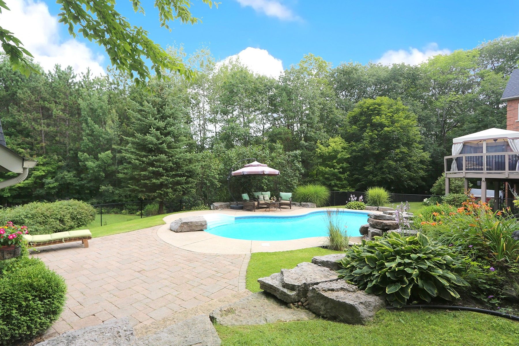 Incredible setting in the highly sought after foxfire estates just south of uxbridge. Welcome to your dream backyard, complete with saltwater pool, waterfall, hot tub and lower level leisure space. Walk out from two levels, seamlessly connecting the indoors into the backyard retreat, enhancing the flow of this exceptional home. Classically designed estate home blends timeless elegance with resort-style amenities. 4 bedroom, 4 bathroom (with 2 ensuites), 2 gas fireplaces, a formal dining room, separate living and family rooms, and also a separate office. Eat-in kitchen with pantry, breakfast bar, stainless steel appliances, and main floor laundry. There are 2 convenient front entrances, with the main entrance opening into a large foyer. A very spacious full walkout unfinished basement provides abundant natural light. The tranquil country porch spans the entire front of the house. A generous back deck with a charming gazebo overlooks the pool, and is perfect for entertaining, with gas bbq hook-ups on both levels. Don't forget the private forested area for outdoor adventures. This home features extensive landscaping with several perennial gardens, beautifully maintained to be an entertainers paradise, and private sanctuary, all in one!