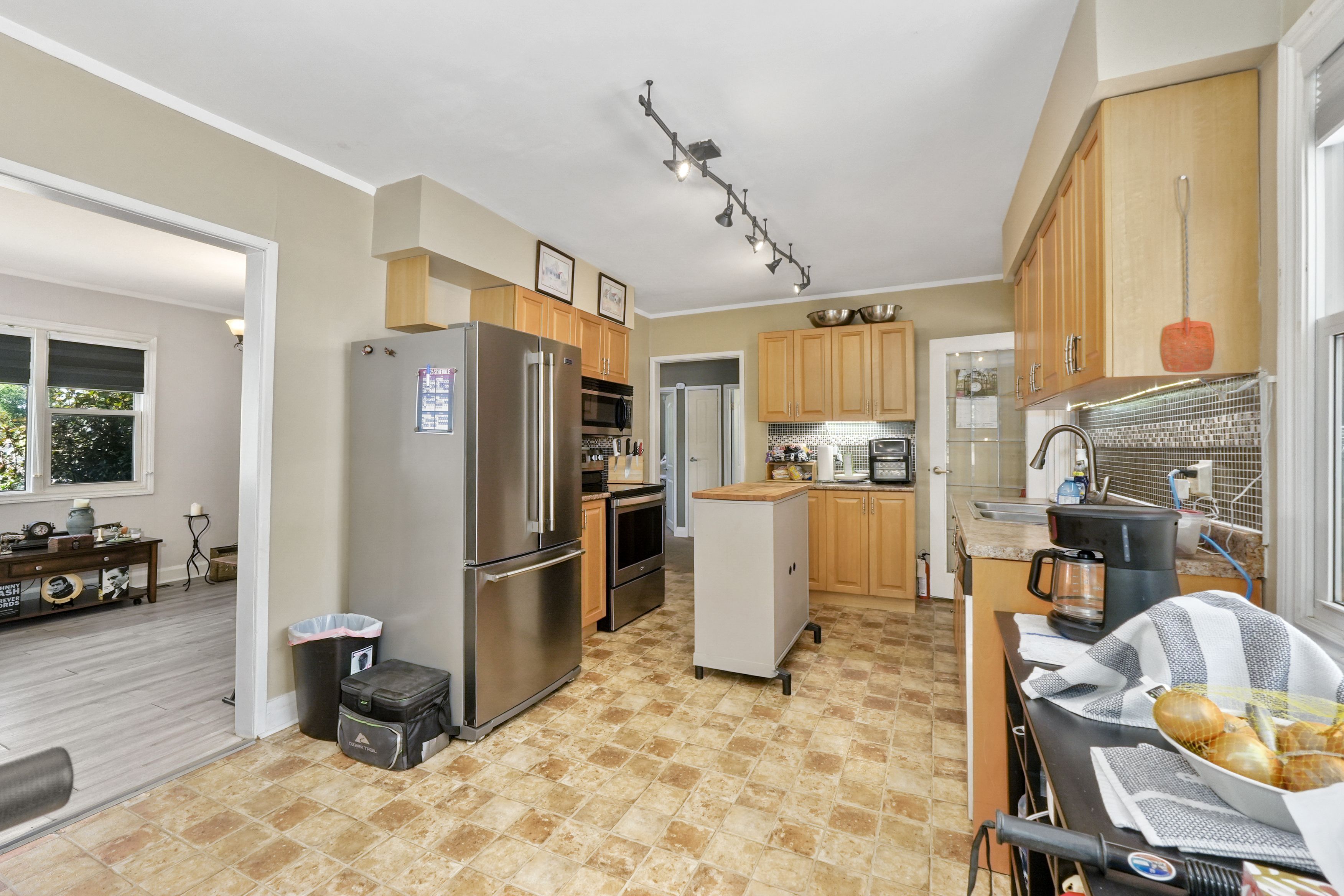 • Bright eat-in kitchen with stainless steel appliances and ample counter space.