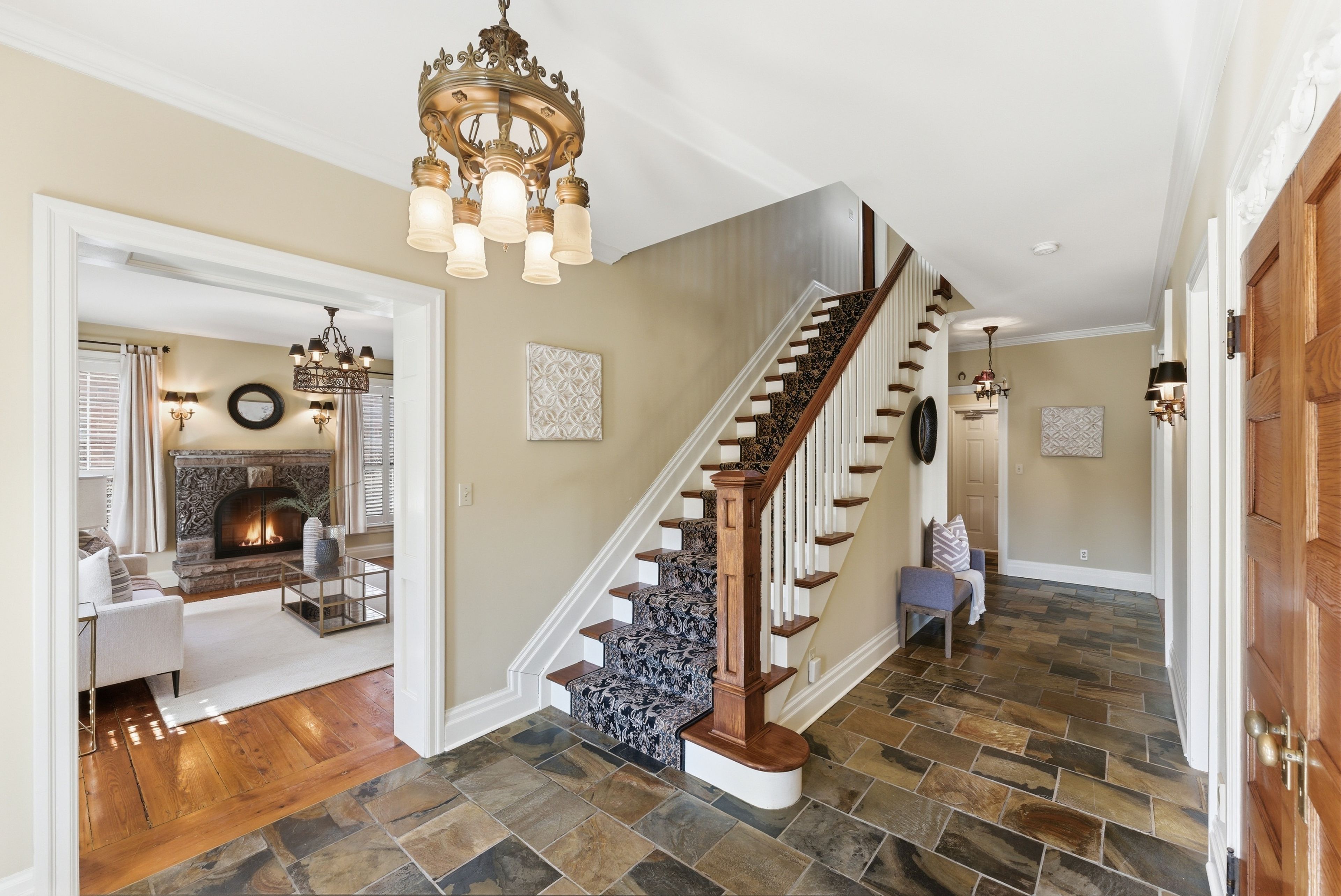 • Beautiful stone wraparound porch for outdoor relaxation and gatherings.