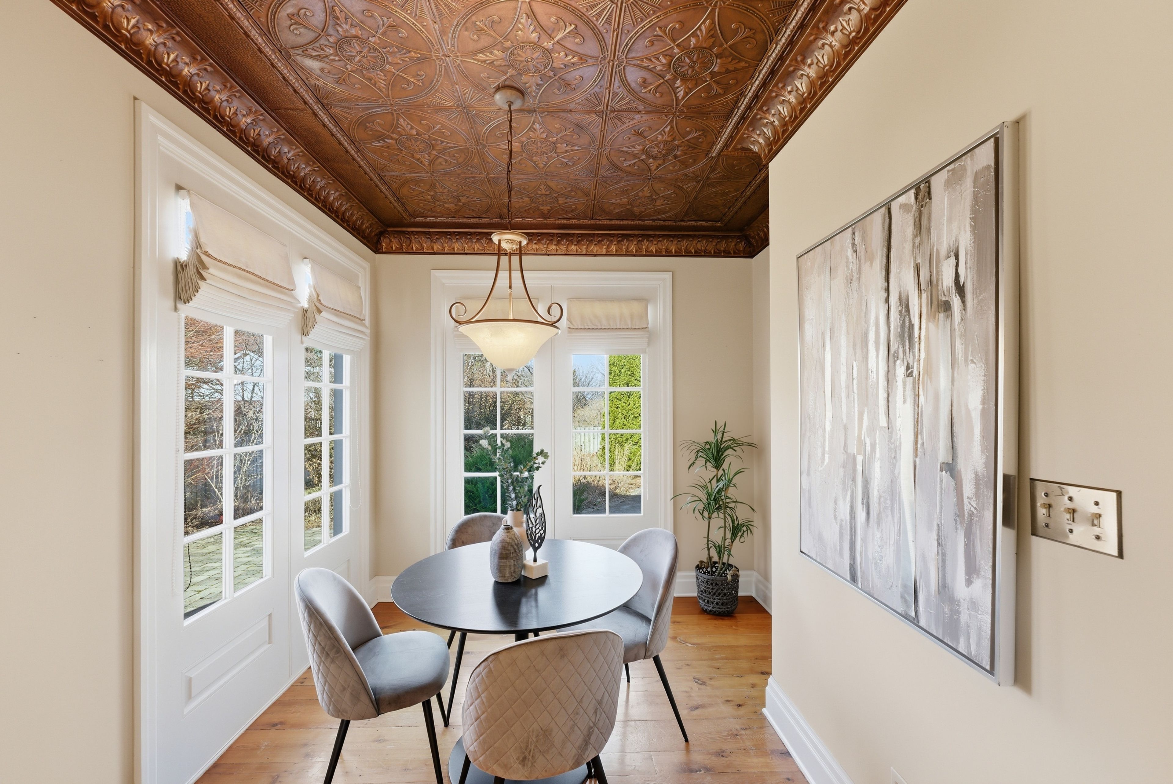 Nestled on a quiet street in the heart of niagara-on-the-lake, this stunning 4-bedroom, 3-bath residence offers approximately 2,925 sq. Ft. Of thoughtfully designed living space, blending timeless character with luxurious finishes. A gorgeous stone wraparound porch welcomes you home. Step inside to a grand foyer featuring an extra-wide staircase and elegant wall sconces. The main floor showcases wide-plank hemlock wood flooring, creating warmth and character. The living room is highlighted by a stone wood-burning fireplace and walkout access to the wraparound porch. The large eat-in dining room offers plenty of room for family gatherings and dinner parties, with additional doors leading directly to the porch. At the heart of the home lies the kitchen. A copper ceiling in the kitchen and breakfast nook creates a dramatic focal point. The breakfast area opens directly onto a stone patio and backyard. Completing the main floor is a convenient 2-piece bath and a versatile bonus room-ideal as a home office, craft room, or potential 5th bedroom. Upstairs, you'll find four generously sized bedrooms, offering large windows and ample closet space. The primary suite serves as a private retreat, featuring a spa-inspired 4-piece ensuite complete with a built-in vanity, soaker tub, and stand-up shower. An additional 4-piece bath provides convenience for family and guests. The finished basement expands the living space with a large recreation room anchored by a second stone fireplace. There is also plenty of additional storage space. Outside, the spacious backyard offers endless possibilities for entertaining, play, or relaxation, with abundant garden space for gardening enthusiasts. A double-wide attached garage and ample driveway. Located in an exceptional niagara-on-the-lake location, this home combines luxury, character, and tranquility, all while being close to the town's renowned wineries, dining, and charming amenities.