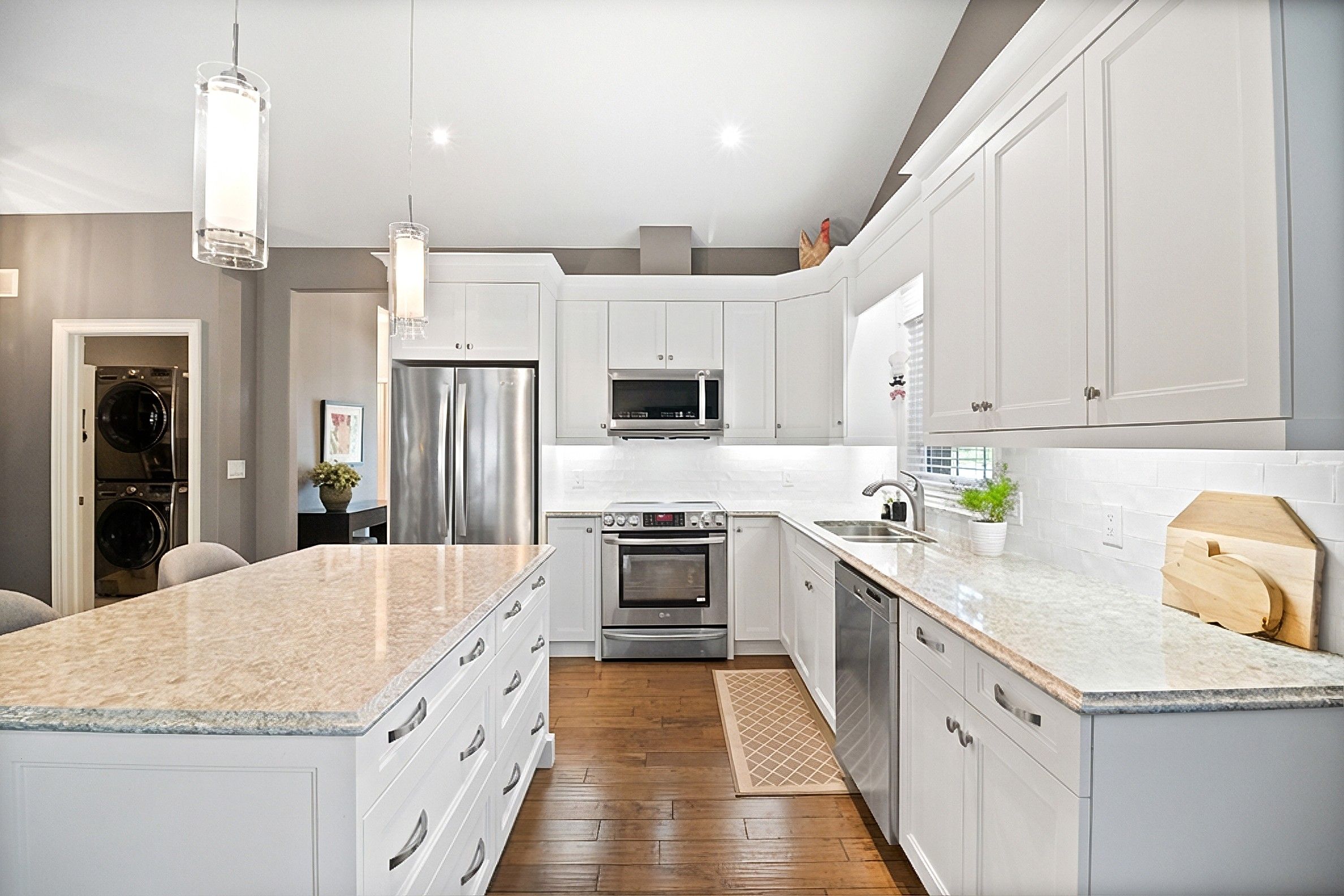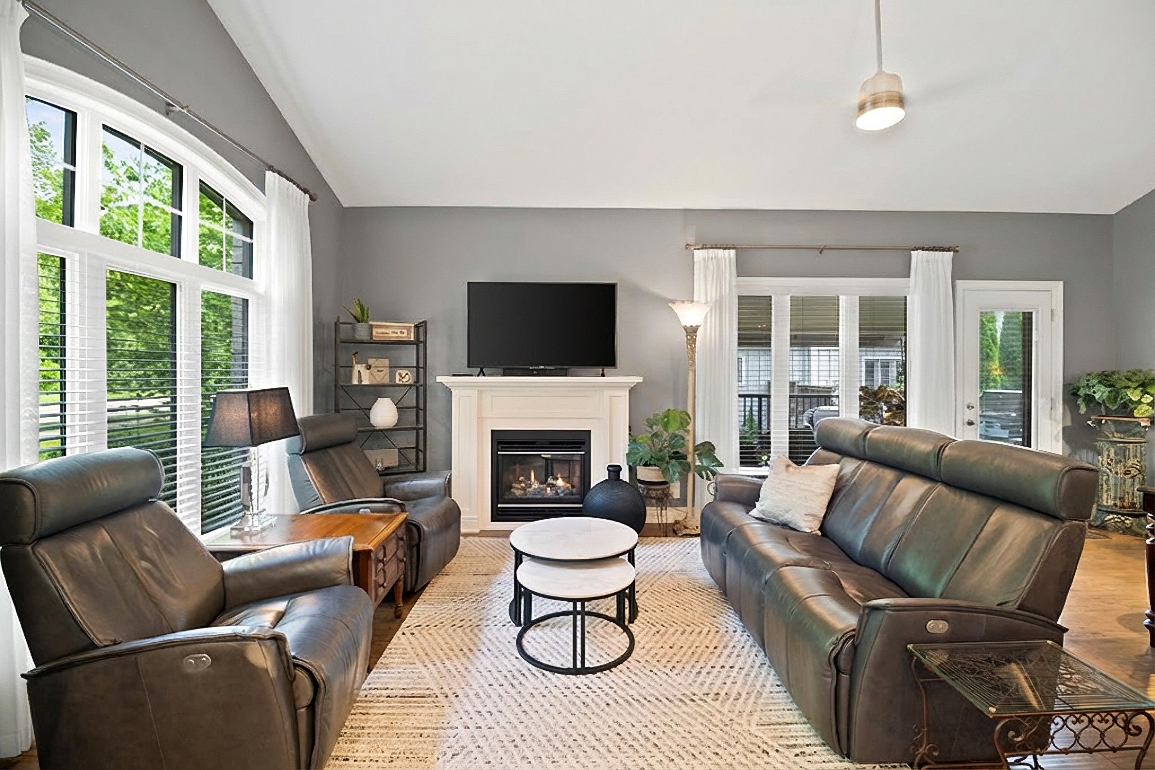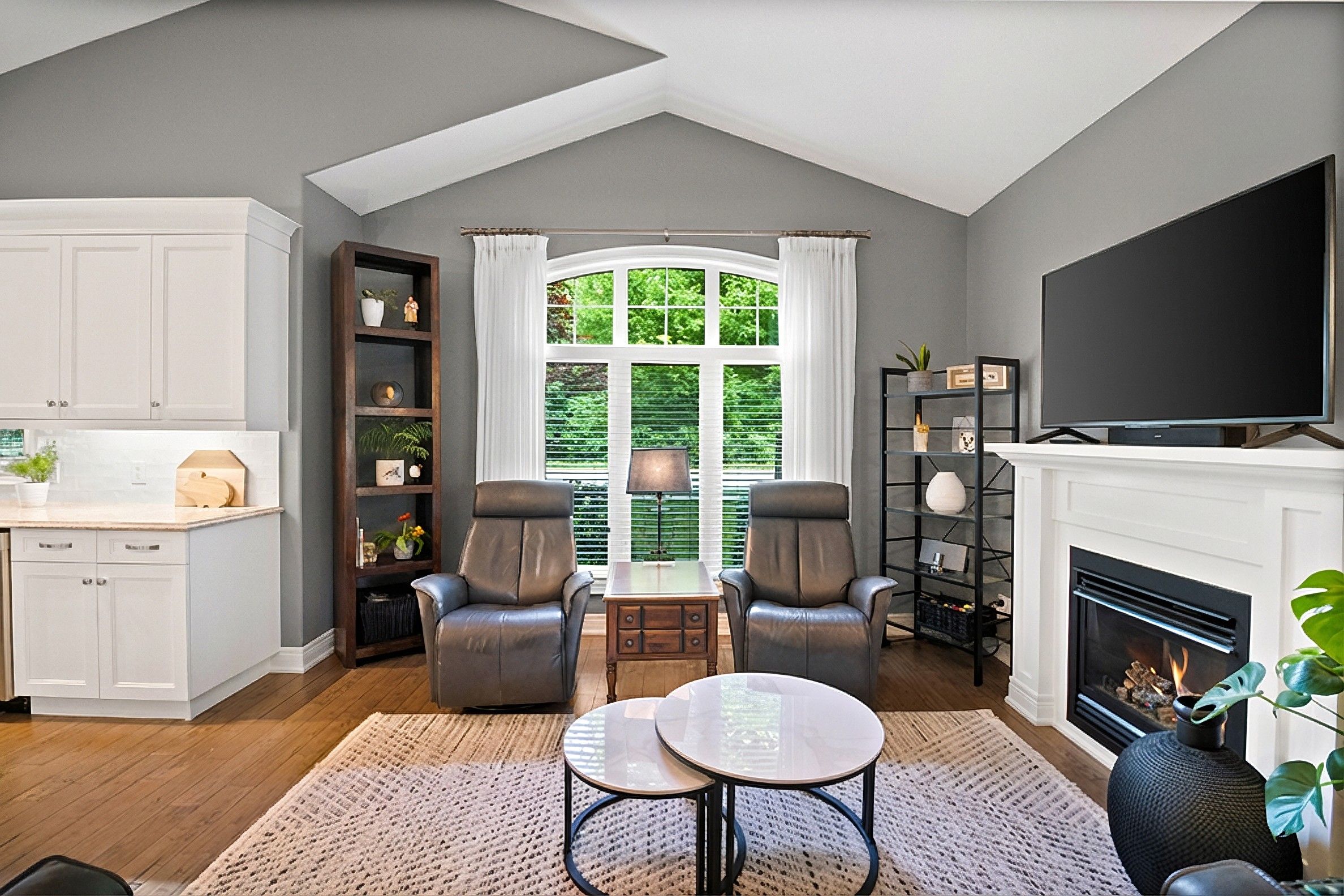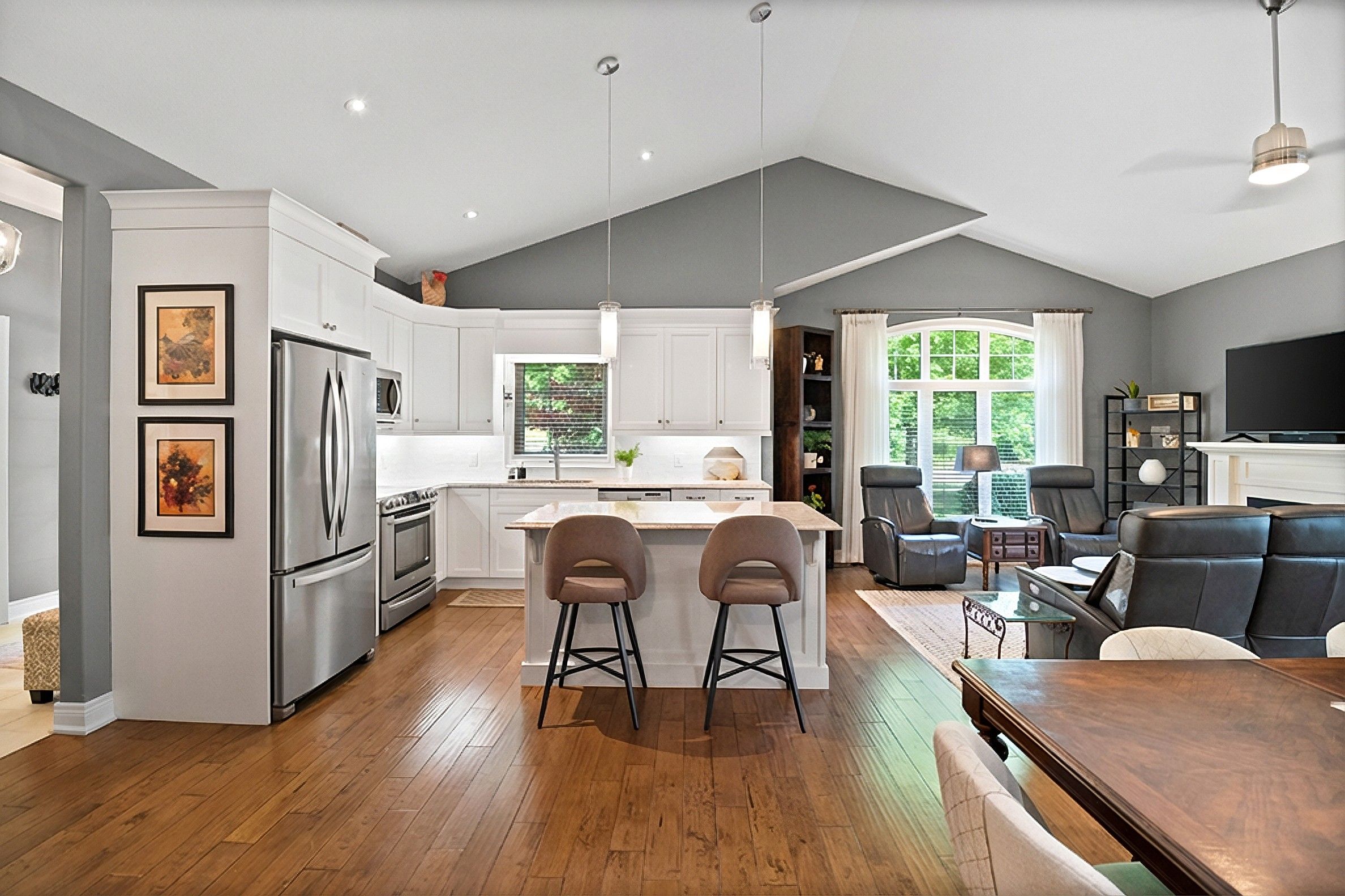 • Chefs kitchen connects to a cozy living room with a fireplace.
