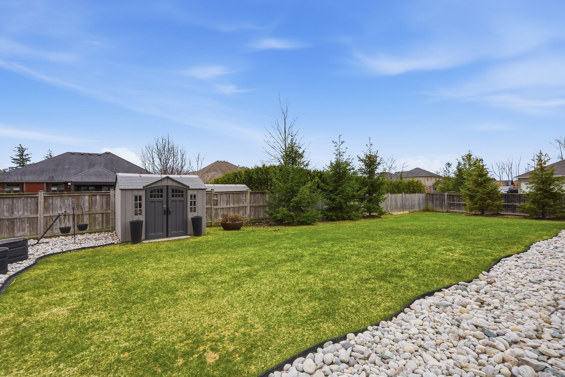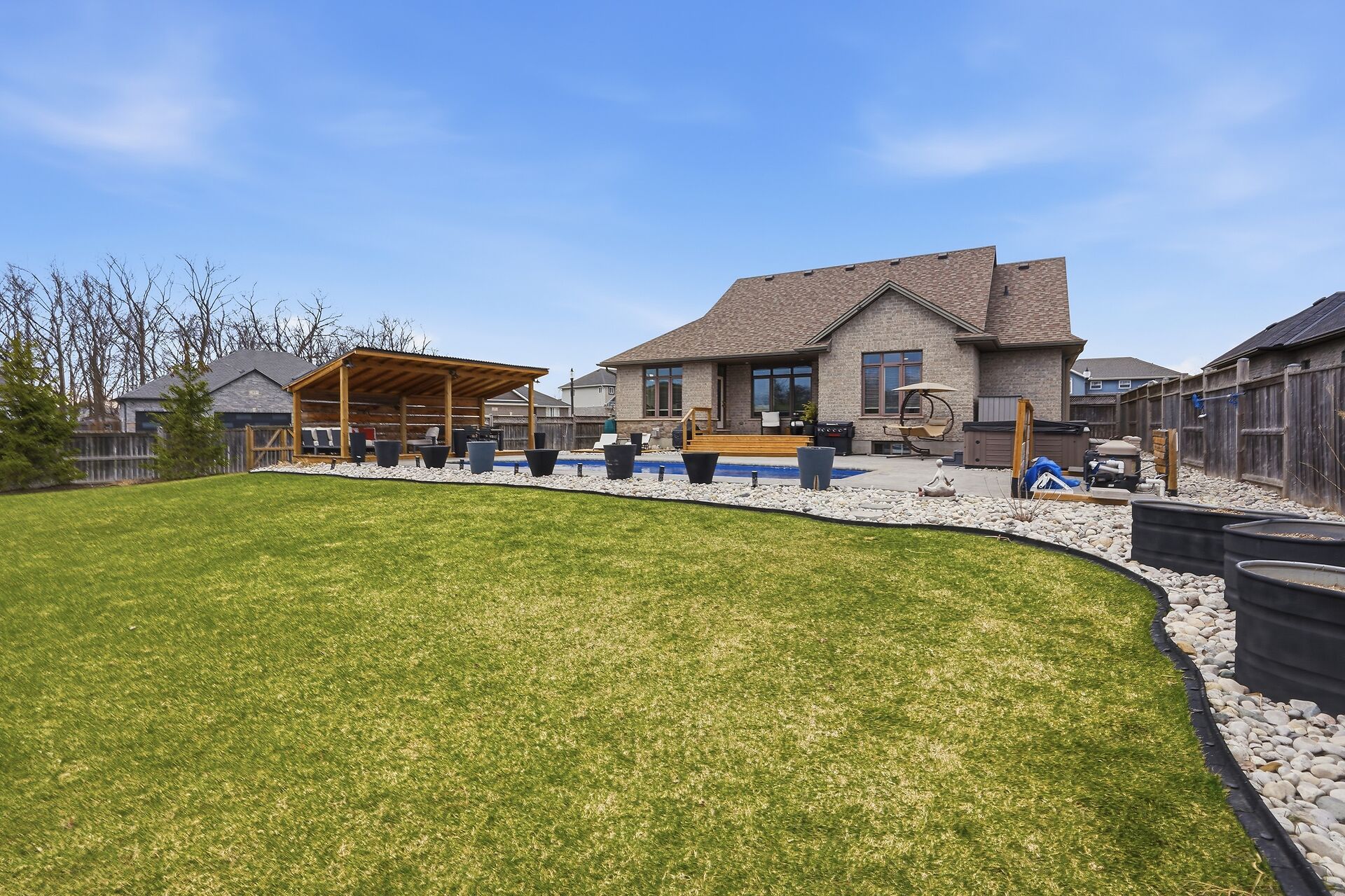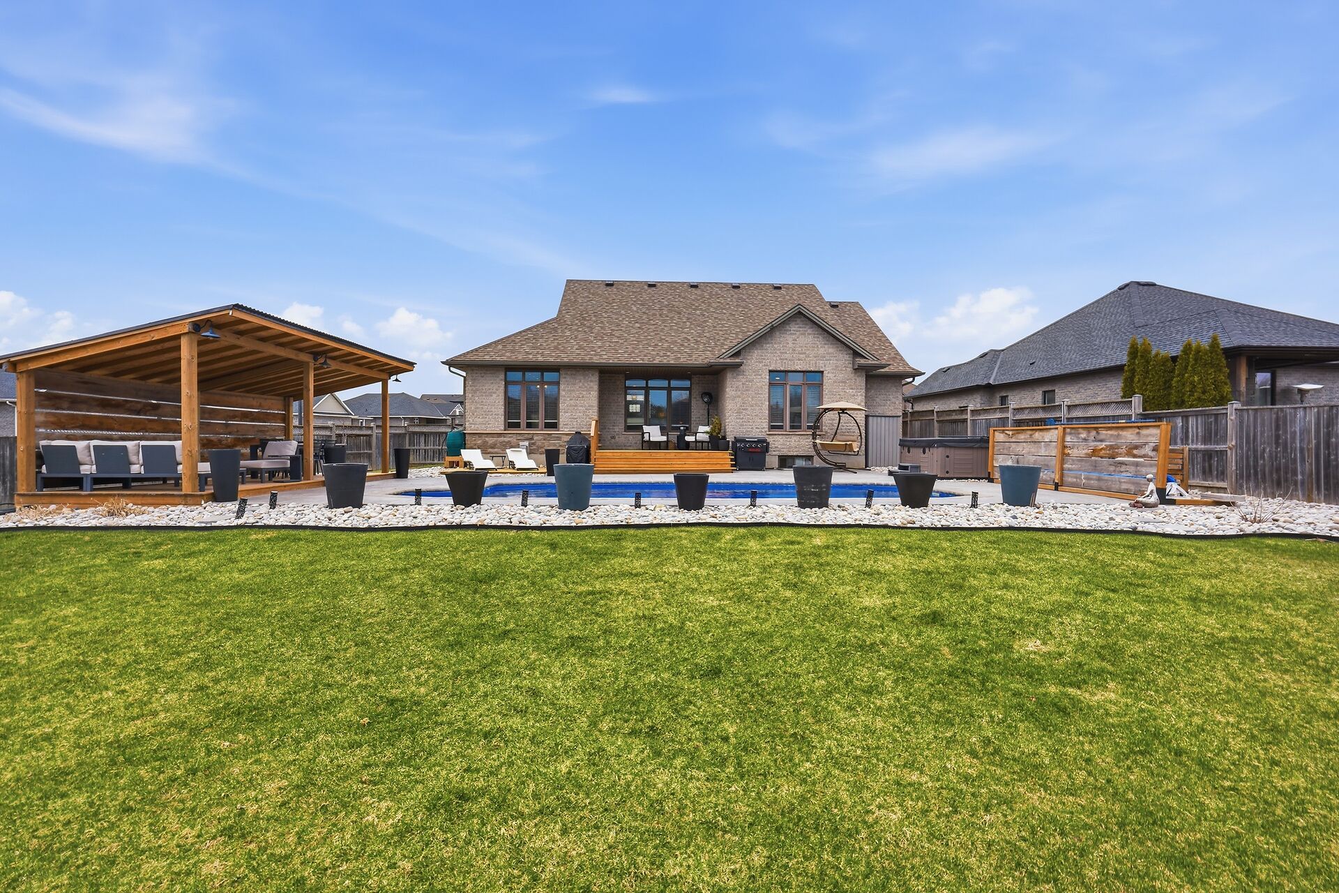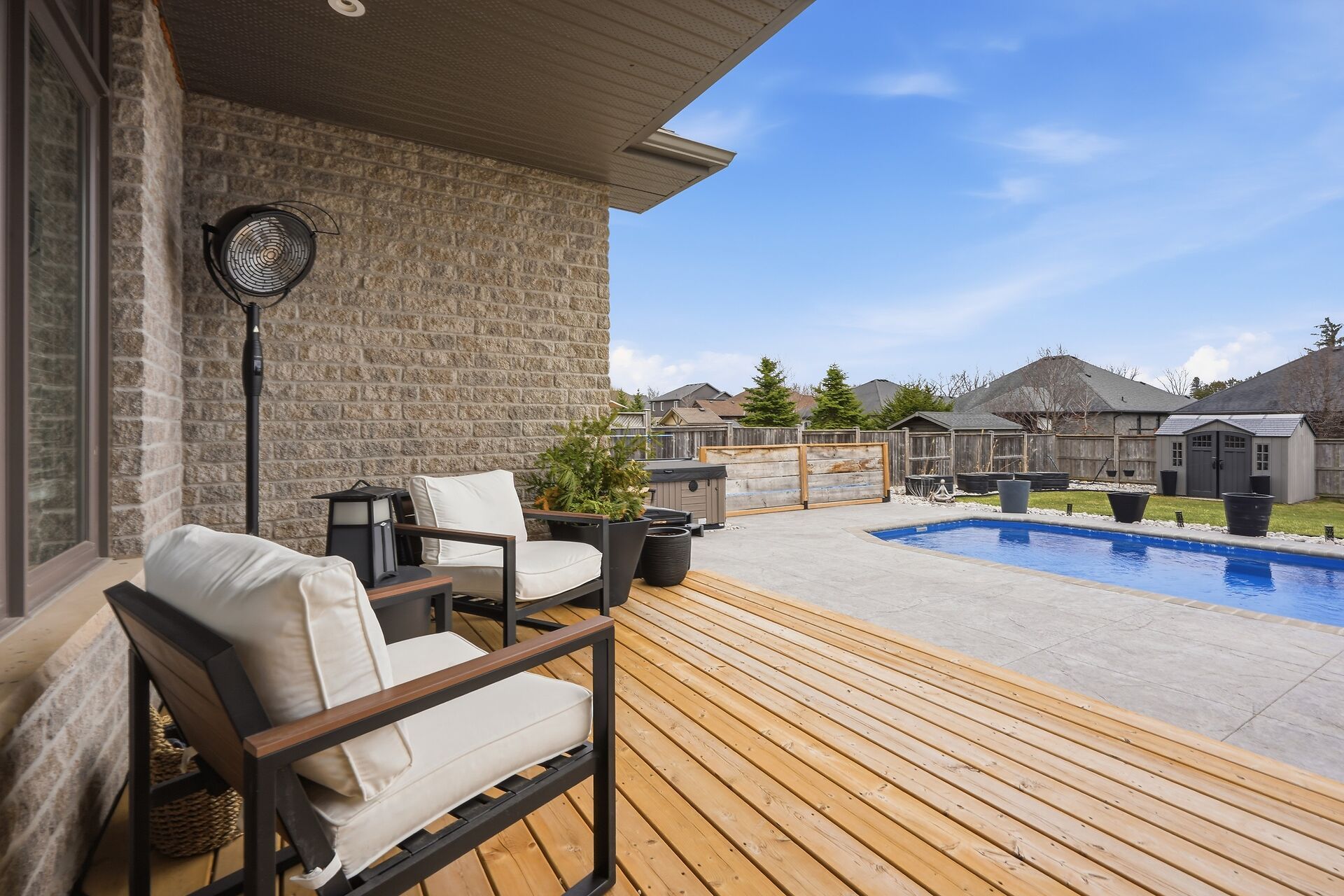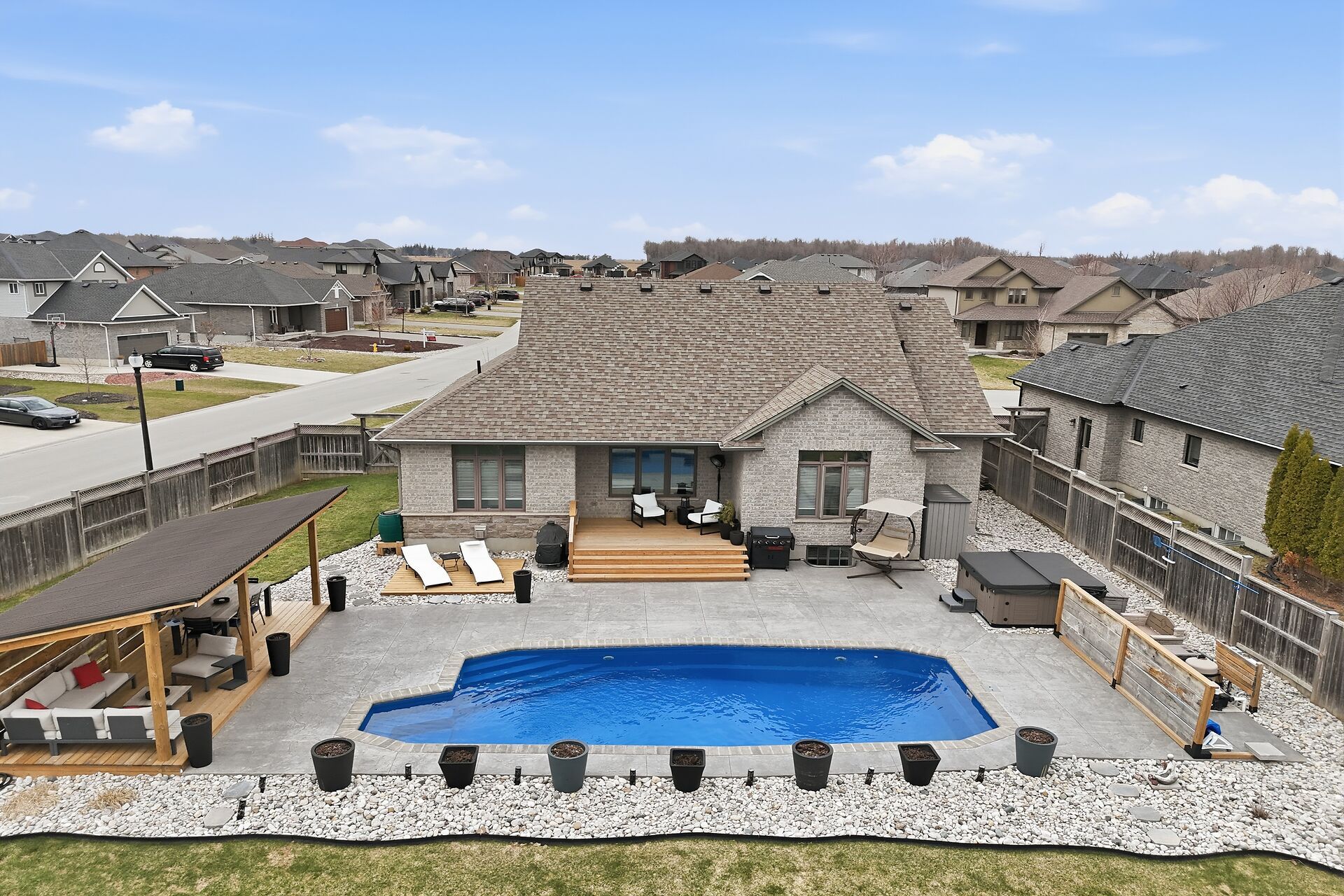 Welcome to this beautifully maintained ranch-style home offering the perfect balance of comfort, space and functionality. This home features a double car garage, impressive curb appeal with striking stone masonry, and a layout that flows effortlessly. Large windows and lower level egress windows, allow for natural light on every level. Main floor transom windows above interior doorways, enhance brightness while adding architectural character. Just off the entrance is a dedicated main floor office. Layout opens into a spacious great room where the kitchen, dining and living areas flow seamlessly together. The kitchen offers ample workspace and storage while remaining connected to the main living area, 4-piece bathroom and practical mudroom, complete with hookups for main floor laundry. Primary features a walk-in closet, a private 4-piece ensuite, while a second generously sized bedroom completes the main level. Fully finished lower level extends the living space with a cozy family room with fireplace, recreation area, two additional spacious bedrooms. A 3-piece bathroom, laundry room, and ample storage add to the home's functionality. The backyard is a true standout feature, private outdoor retreat designed for relaxation and entertaining. The heated saltwater pool, surrounded by a large concrete patio and a newly built covered seating area for dining and lounging in the shade. Designed for low maintenance, the yard includes stone garden beds and raised vegetable planters, offering beauty and practicality. With ample space to entertain, or simply enjoy quiet evenings at home, this setting delivers the ultimate staycation lifestyle. Situated on a desirable corner lot, the property offers privacy and excellent outdoor space in a sought-after, family-friendly neighbourhood. Walking distance to a local school and just a short drive to london, this home offers an ideal blend of lifestyle, location and quality craftsmanship.