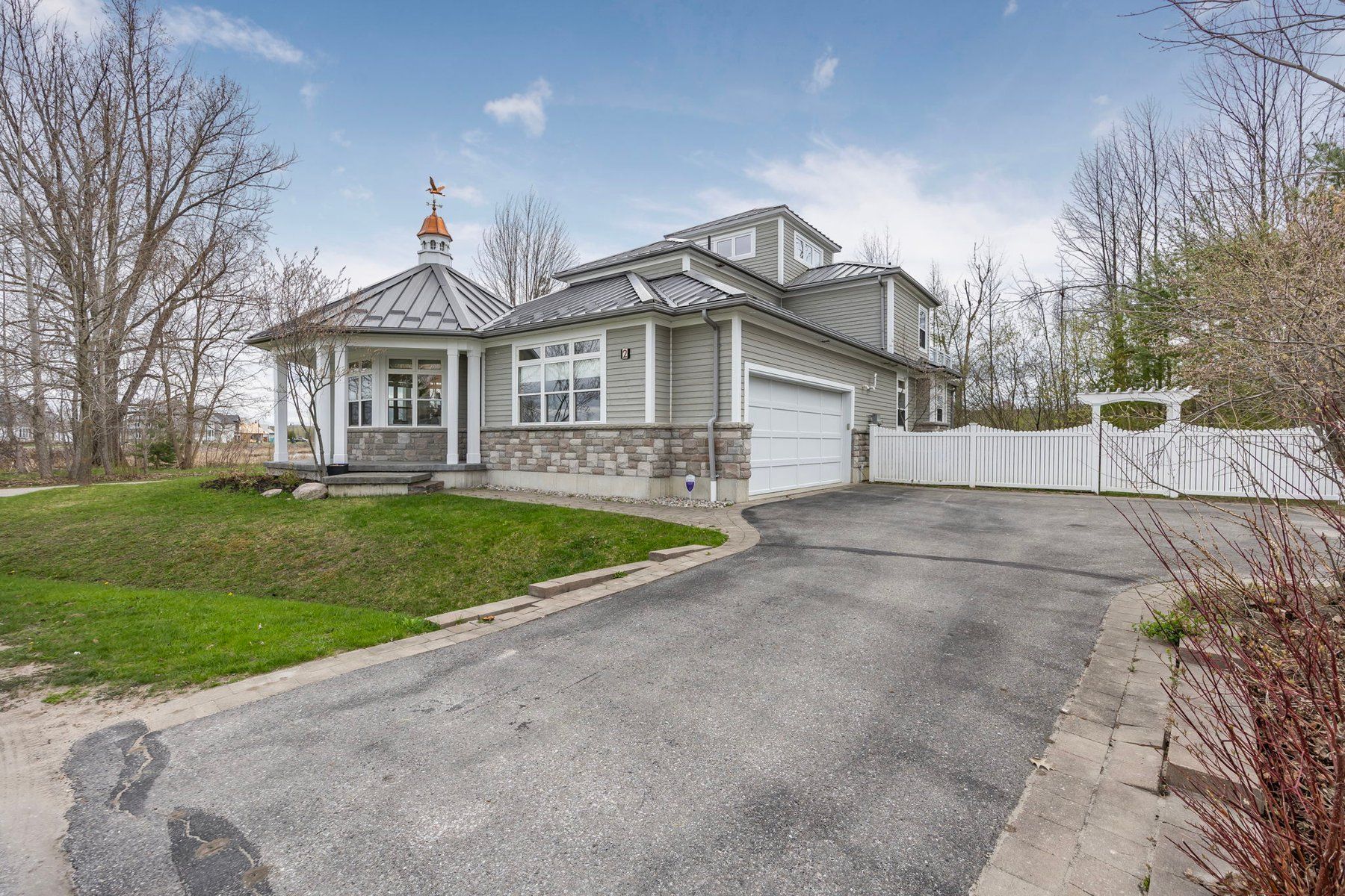 With its cupola, refined rooflines, and inviting front porch, the home makes a striking first impression.. Tucked at the end of a quiet cul-de-sac in a gated waterfront community in port mcnicoll, this cape cod-inspired home offers over 3,000 sq ft of light-filled living space. Inside, the layout flows beautifully from the welcoming foyer to a bright, hexagon-shaped dining room overlooking the porch, an ideal space to host dinners or sip your morning coffee. Vaulted ceilings and oversized windows create a sense of openness in the main living area, where a gas fireplace and walkout to the screened-in porch set the tone for relaxed comfort. The main-floor primary suite includes a walk-in closet and 4-piece ensuite, while a nearby home office offers a quiet and inspiring place to work from home. The centrally located kitchen is designed for ease and connection, opening into the heart of the house. Upstairs, two bedrooms share a full bath. One of the bedrooms connects to a balcony, while the second enjoys its own private balcony, perfect for morning sun or quiet moments with a book. Built-in floor-to-ceiling shelving in the hallway offers the ideal space for a personal library or curated display. A loft overlooks the living room and opens to a shared balcony, blending style with function. At the top, a lookout sitting room with transom windows offers treetop views and a peaceful space for reading, reflection, or stargazing. The basement provides ample storage, while the large double garage adds practical convenience. Outdoors, enjoy evenings around the stone fire pit or listen to birdsong from the comfort of your screened-in porch. A public walking trail runs along the northern side of the property. With multiple marinas just minutes away, this property is perfectly situated for boaters seeking quick access to launch points on georgian bay. Just a short drive to midland for shopping, dining, and essential amenities, this home offers a refined four-season lifestyle.